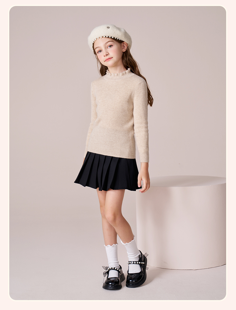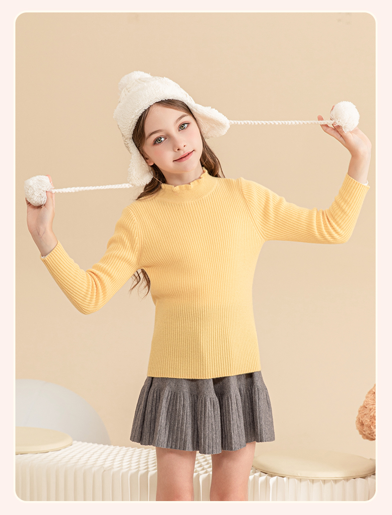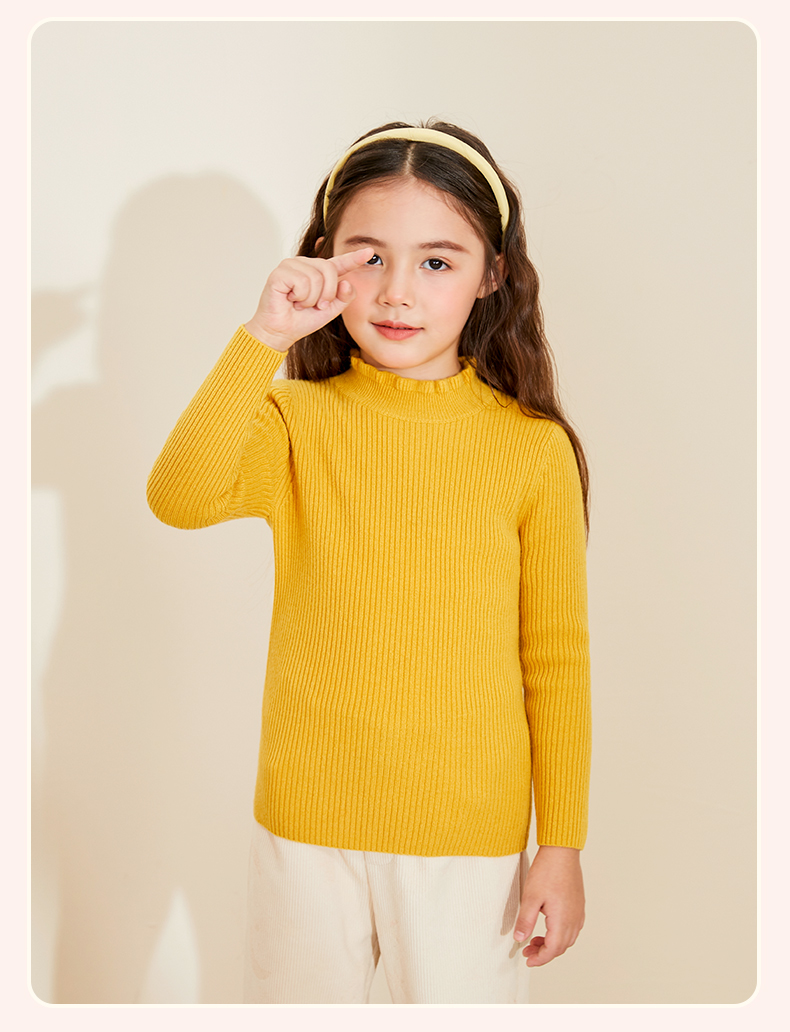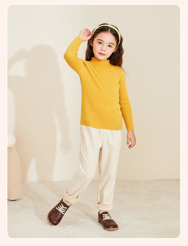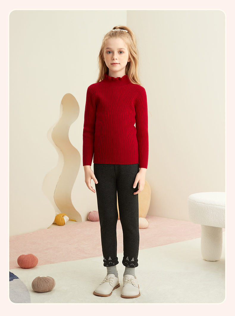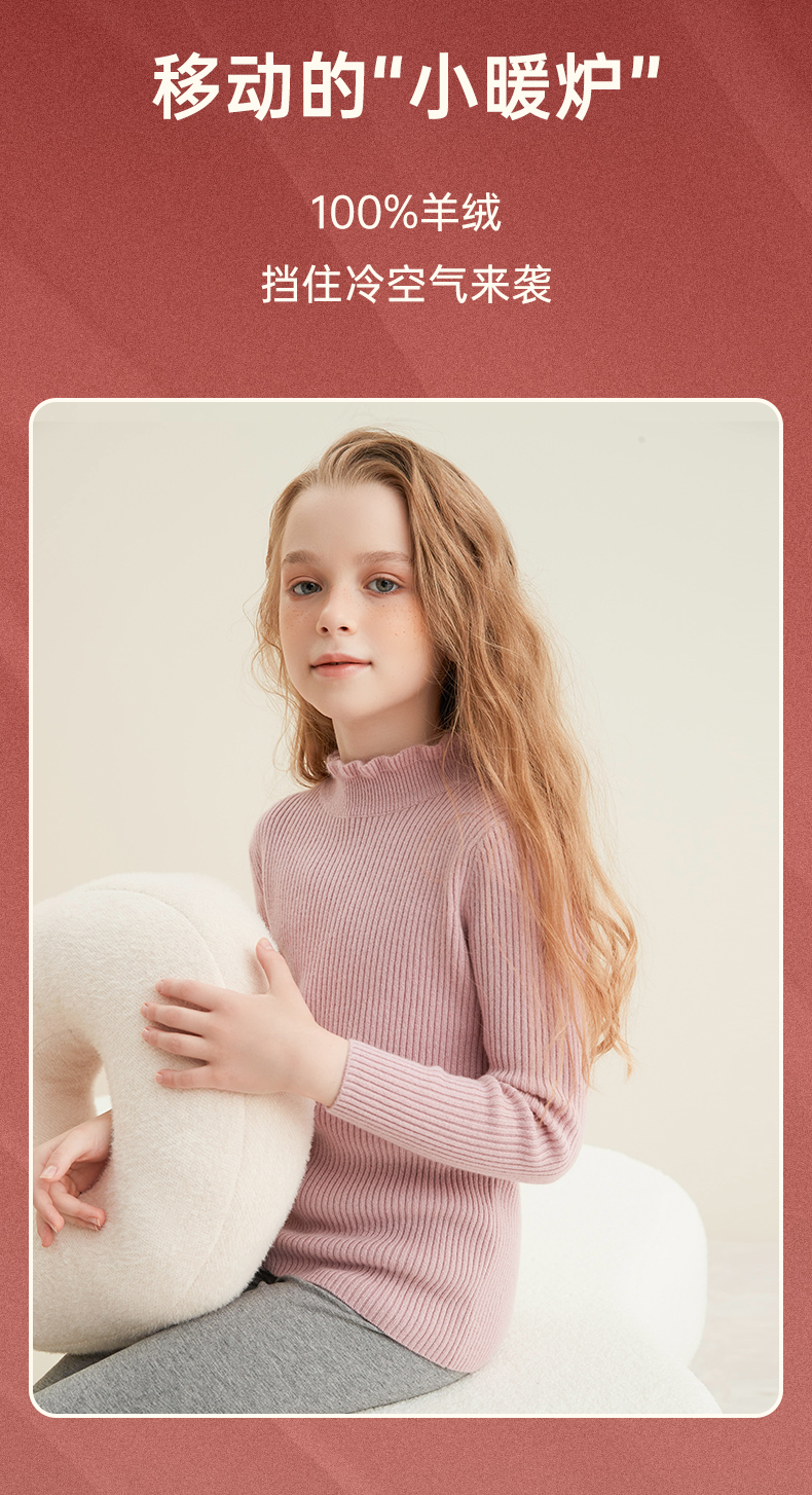 儿童100%羊绒衫女童毛衣粉色半高领秋冬花边领中大童打底衫针织衫