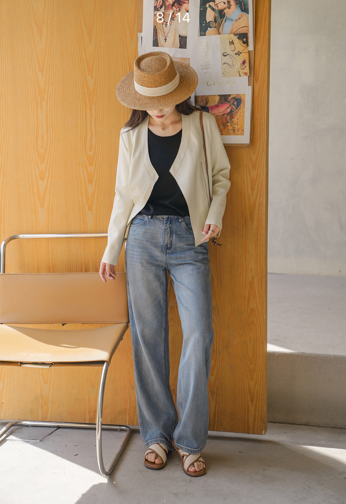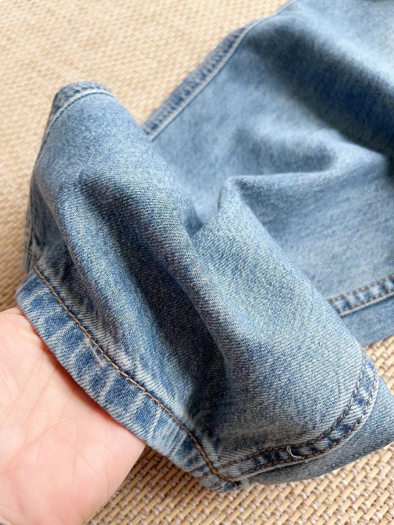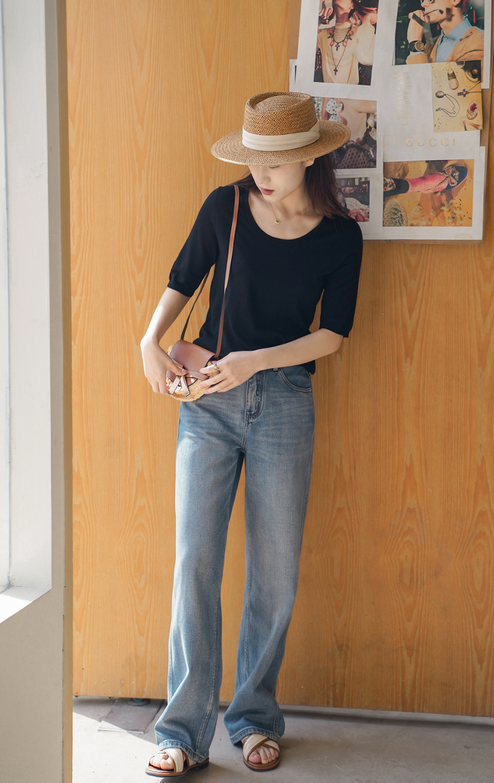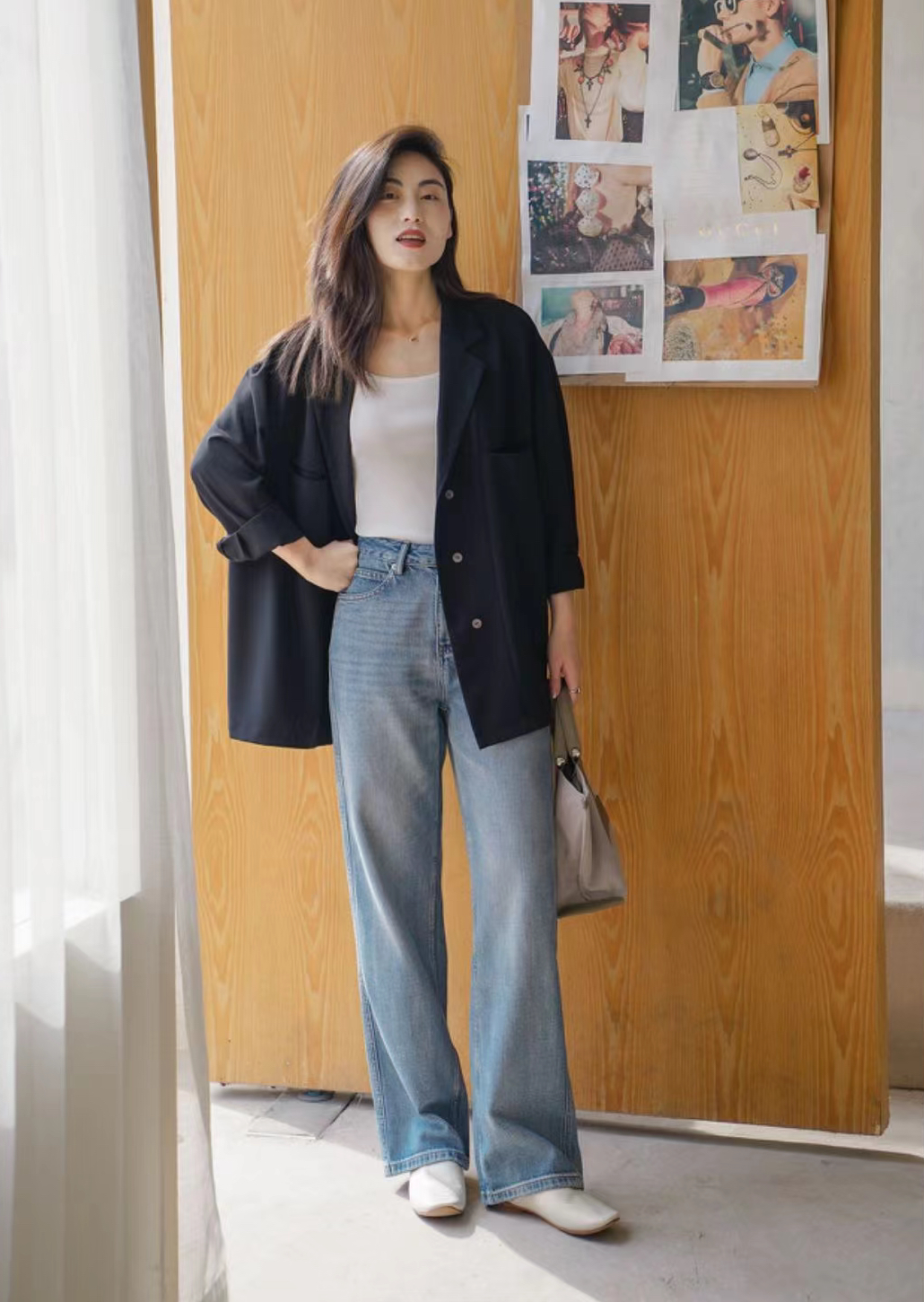 颜色是复古带磨白的水洗蓝,真的好喜欢,经典的一款,超百搭不挑人。微微拖地的裤长,不会很夸张,也没有任何负担。想卷一卷边,也没有问题。这个厚度,夏天穿就可,初秋也OK,超级显瘦!!