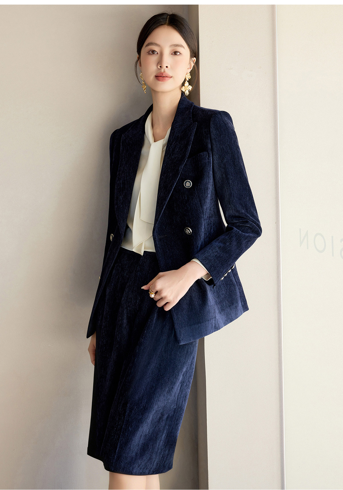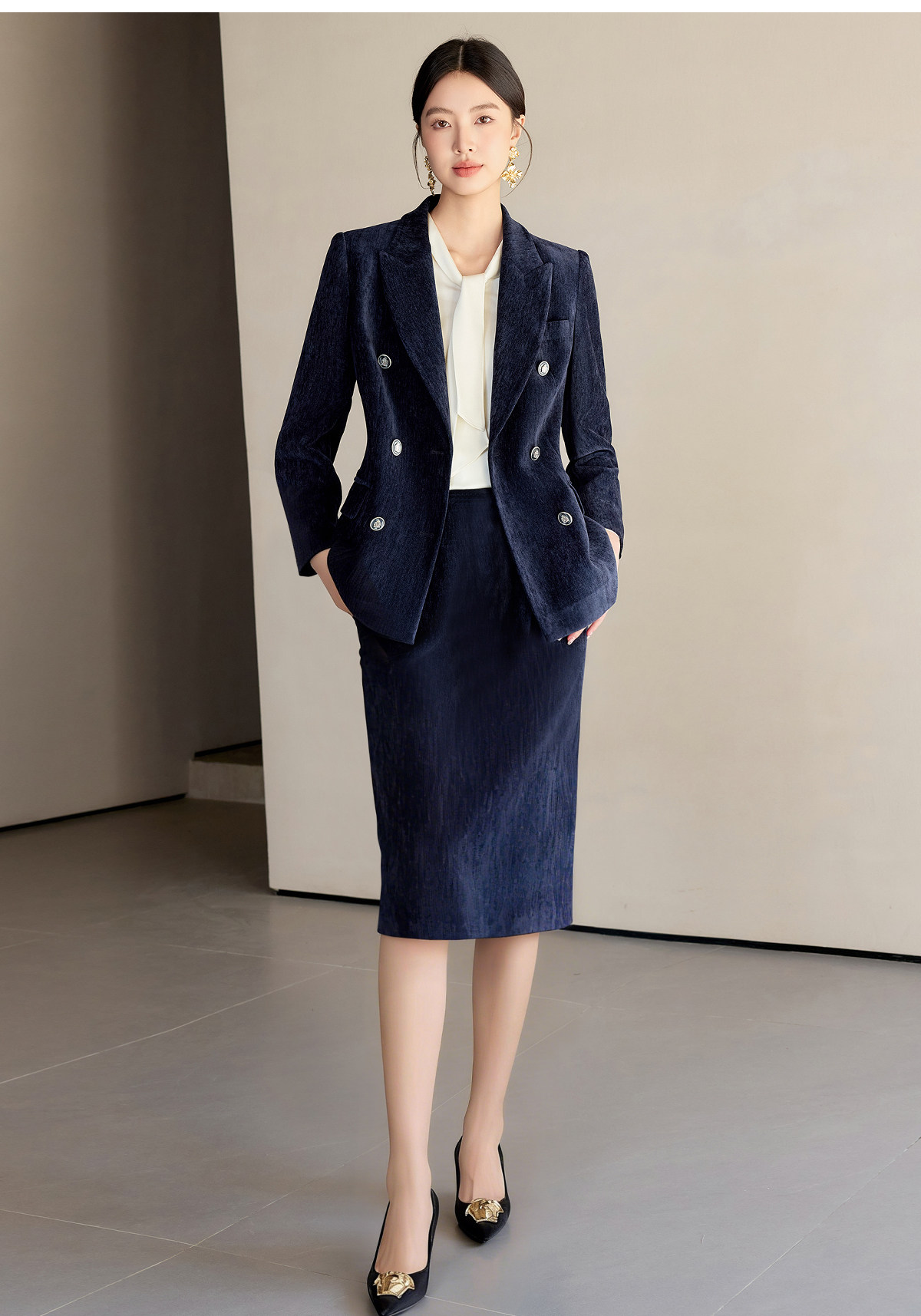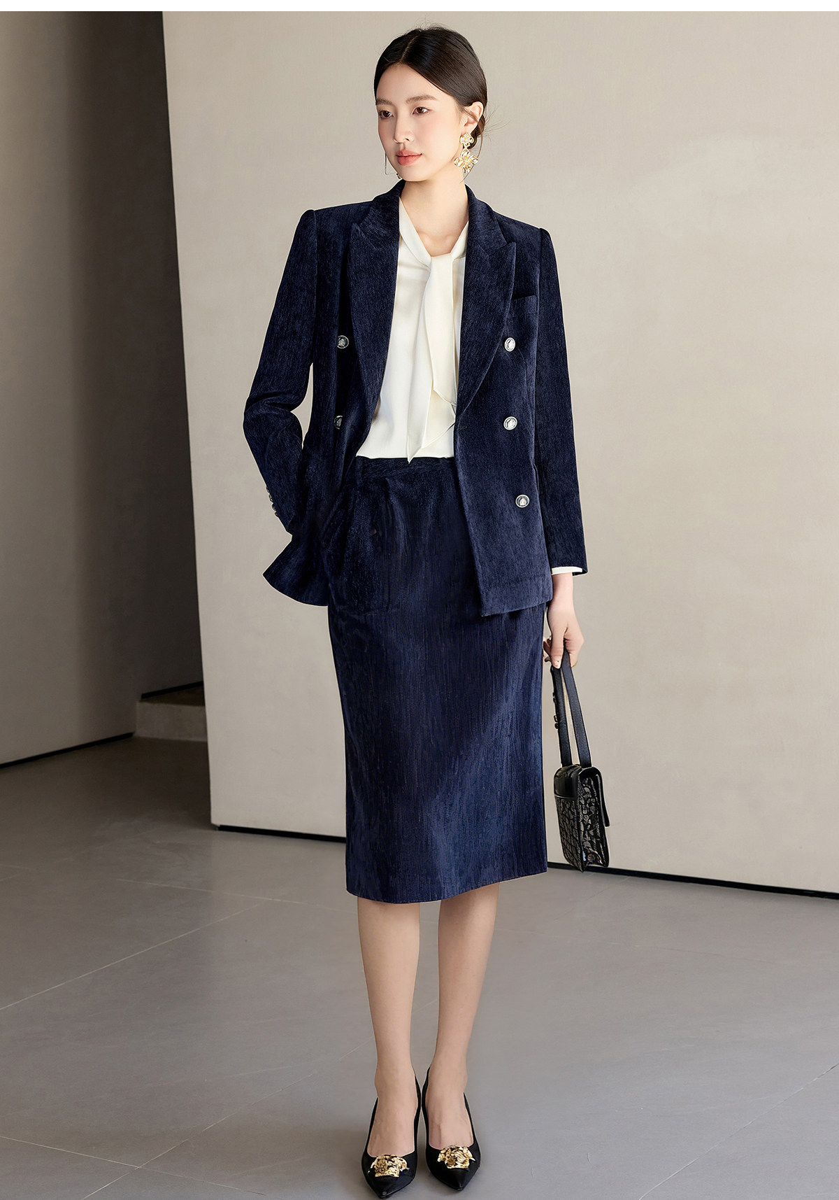 IWY/藏蓝色双排扣西装套装女秋冬气质丝绒职业装通勤套裙工作服24CS673