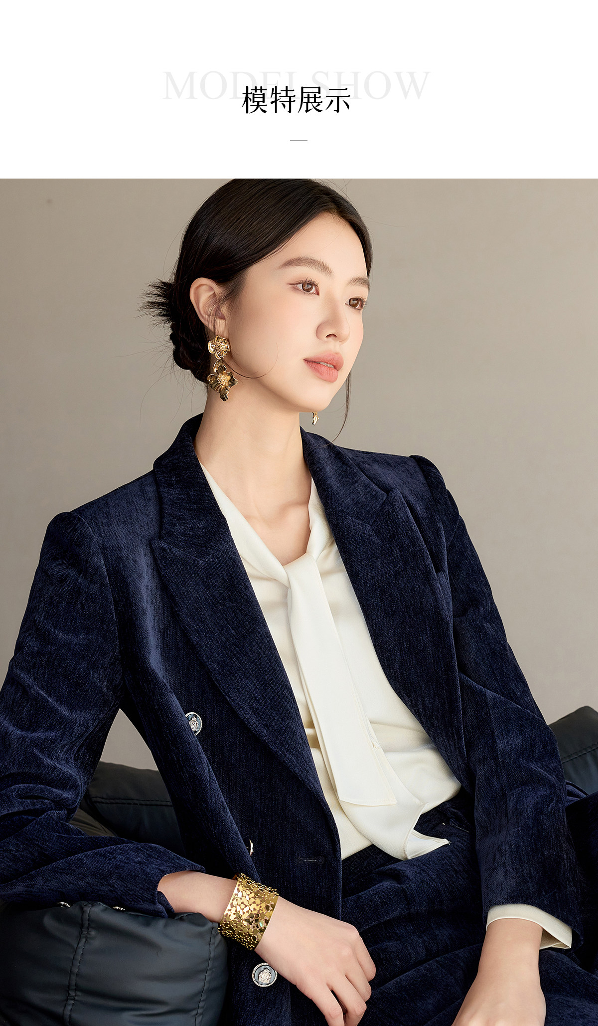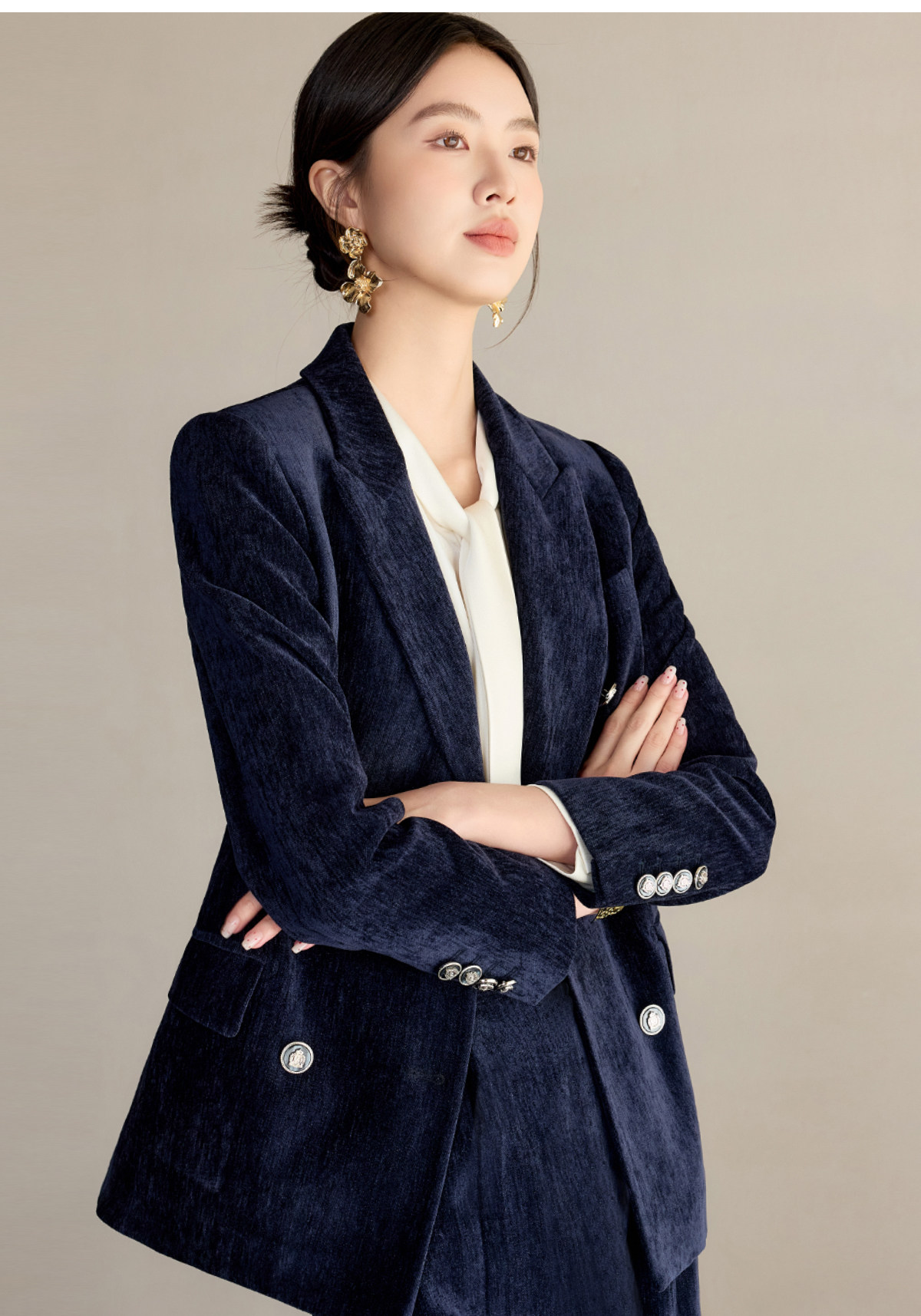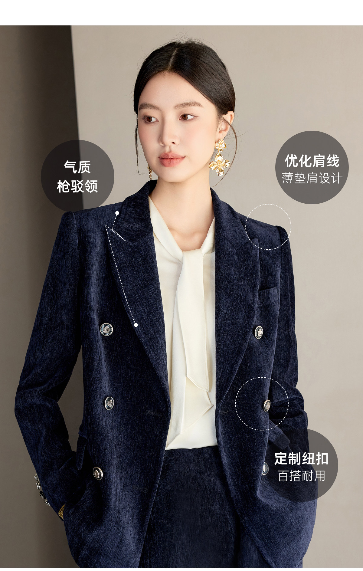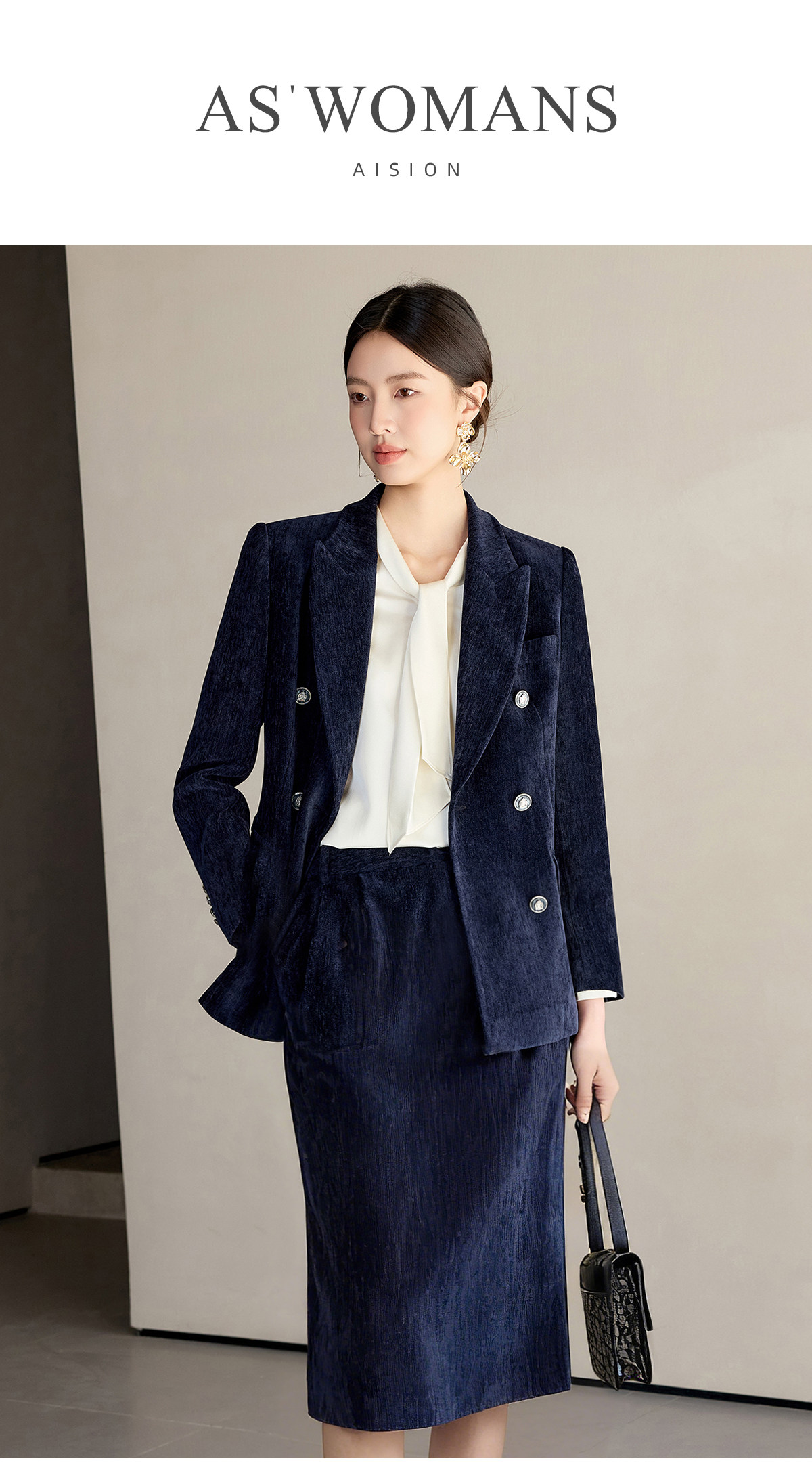 IWY/藏蓝色双排扣西装套装女秋冬气质丝绒职业装通勤套裙工作服24CS673