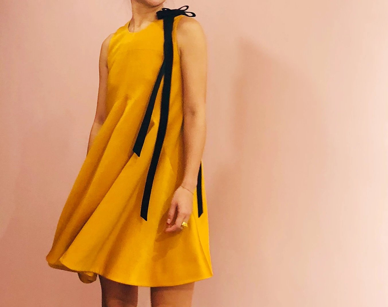 醒目柔和的姜黄色裙身,采用自然流畅的剪裁,尤其适合展现春夏随性风范。单侧选用了对比感强烈的黑色飘带,自然地垂于一边,呈现飘逸的流畅感。