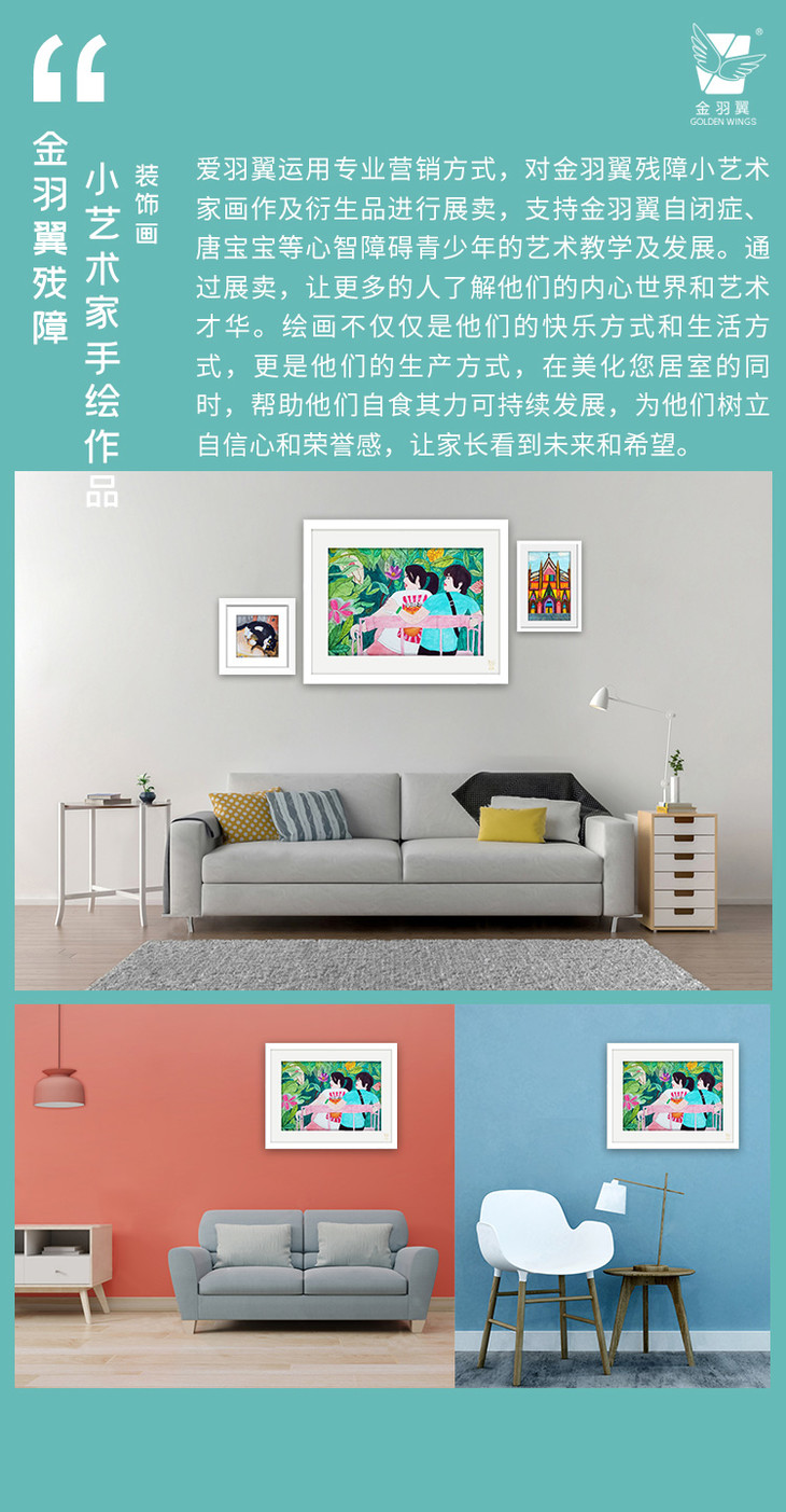 - 金羽翼将艺术与心理治疗相结合,用艺术教育的形式帮助残障青少年体现自身价值、提高生活质量、实现艺术梦想,并将绘画作品开发成衍生品销售,收入扣除成本后,20%返还给学员家庭,80%用于金羽翼艺术康复教学。
