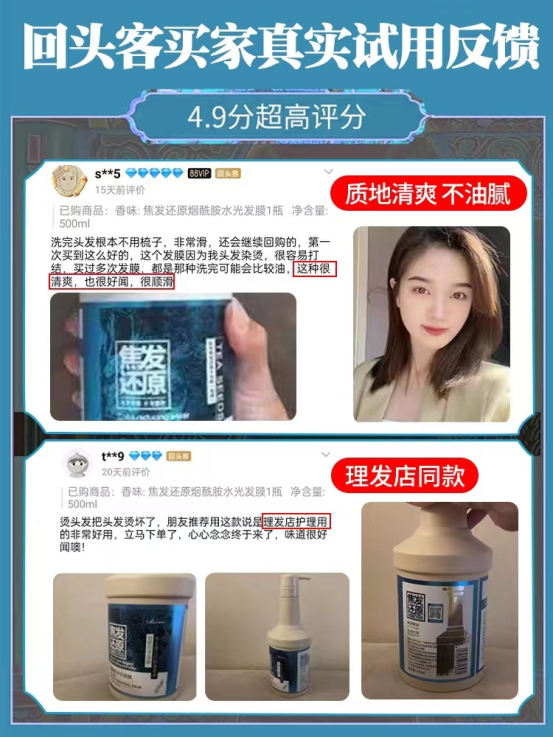 3.集亮泽、滋养、顺滑、强韧于一体,烫染发修复必备,每次用完都像给头发敷了100张面膜一样,发质好到不行