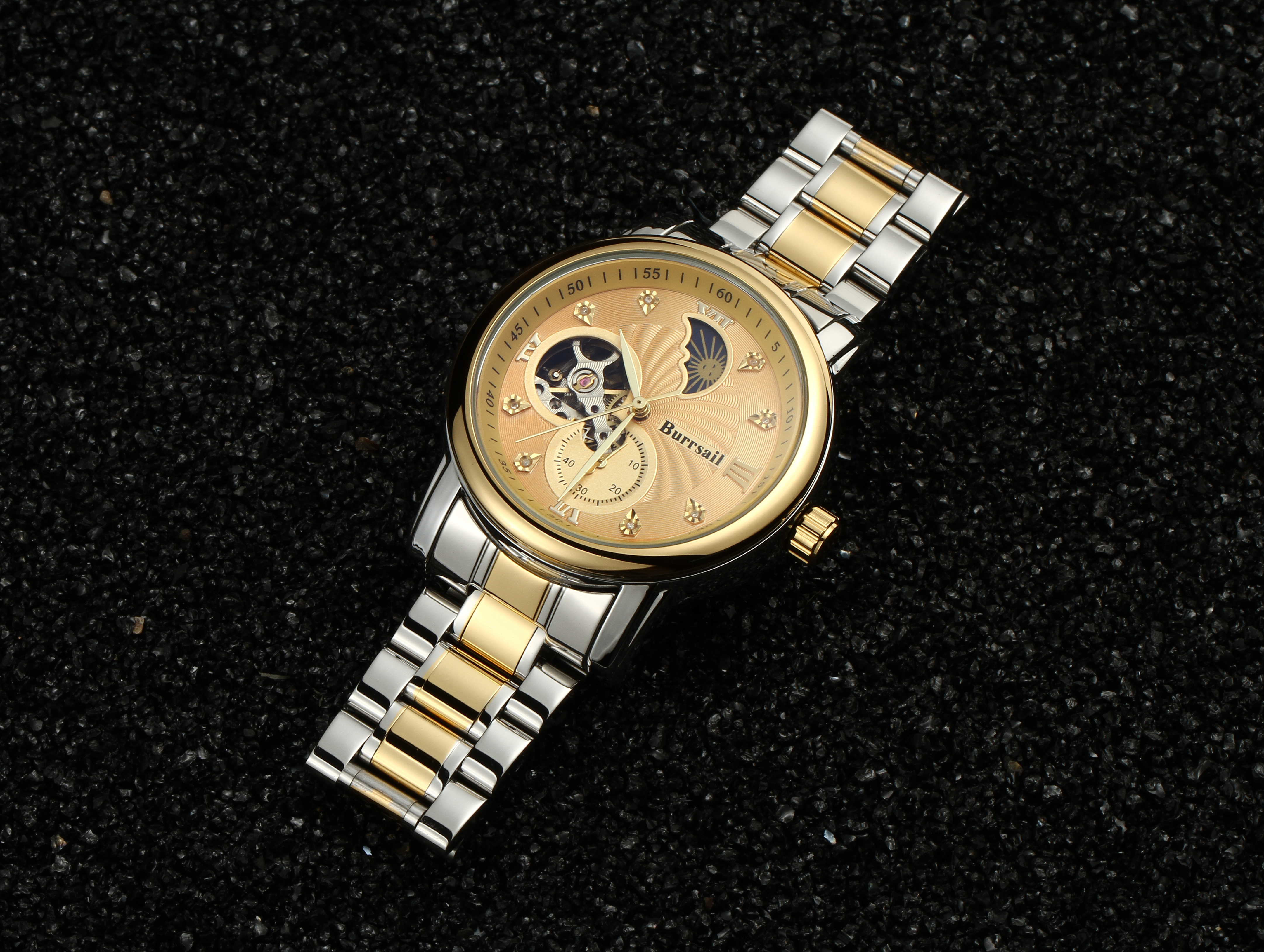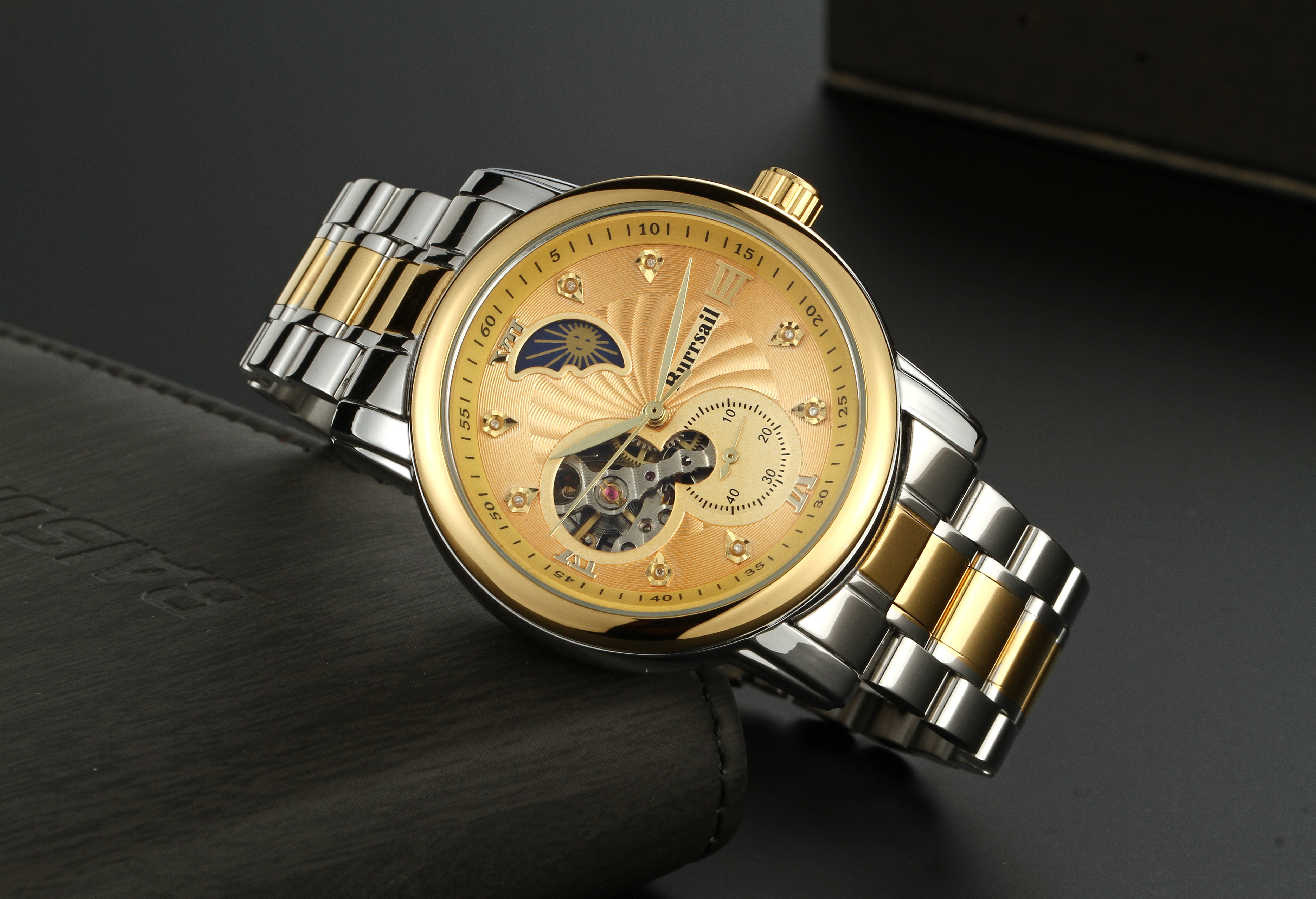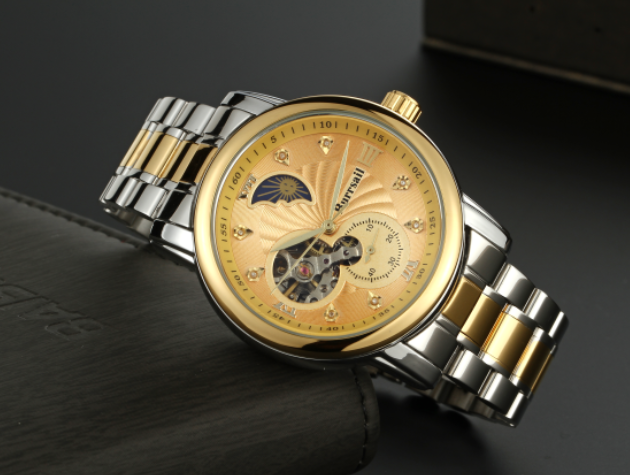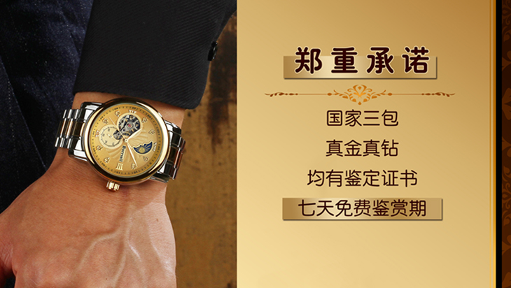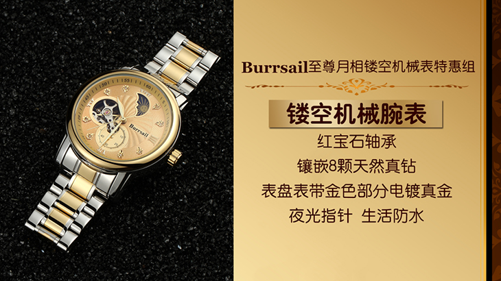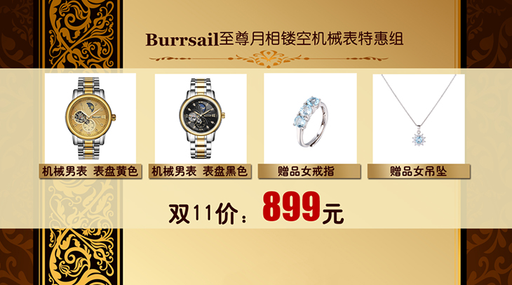 组件:机械男表,表盘黄色;机械男表,表盘黑色;女戒指,女吊坠,VIP卡,手表鉴定证书*2,托帕石鉴定证书,合格证*2,Burrsail说明书