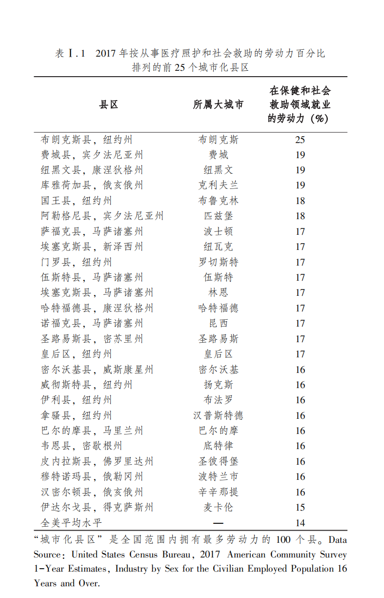如今,从全国层面看,照护工人在劳动力市场统计中所属的部类——“医疗照护与社会救助”成为所有部类中最大的一个,占据总就业量的七分之一,而在像匹兹堡这样的地方,比例会更大。在美国整个北部和中西部的老工业地带,这个比例如今已上升到五分之一。而在很多类似匹兹堡这样的城市——密尔沃基、布法罗、罗切斯特、巴尔的摩、底特律、克利夫兰、费城,医院往往占据当地最大雇主之中的大部分席位。倘若单一机构——像匹兹堡大学医疗中心、巴尔的摩的约翰斯·霍普金斯大学医院或者克利夫兰诊疗中心——巩固了其市场,那么这家医院可能成为全州最大的雇主。就医疗照护岗位在就业中的比重而言,南部和西部的主要城区中,没有哪个能与铁锈地带诸城市相比。(见表I.1)