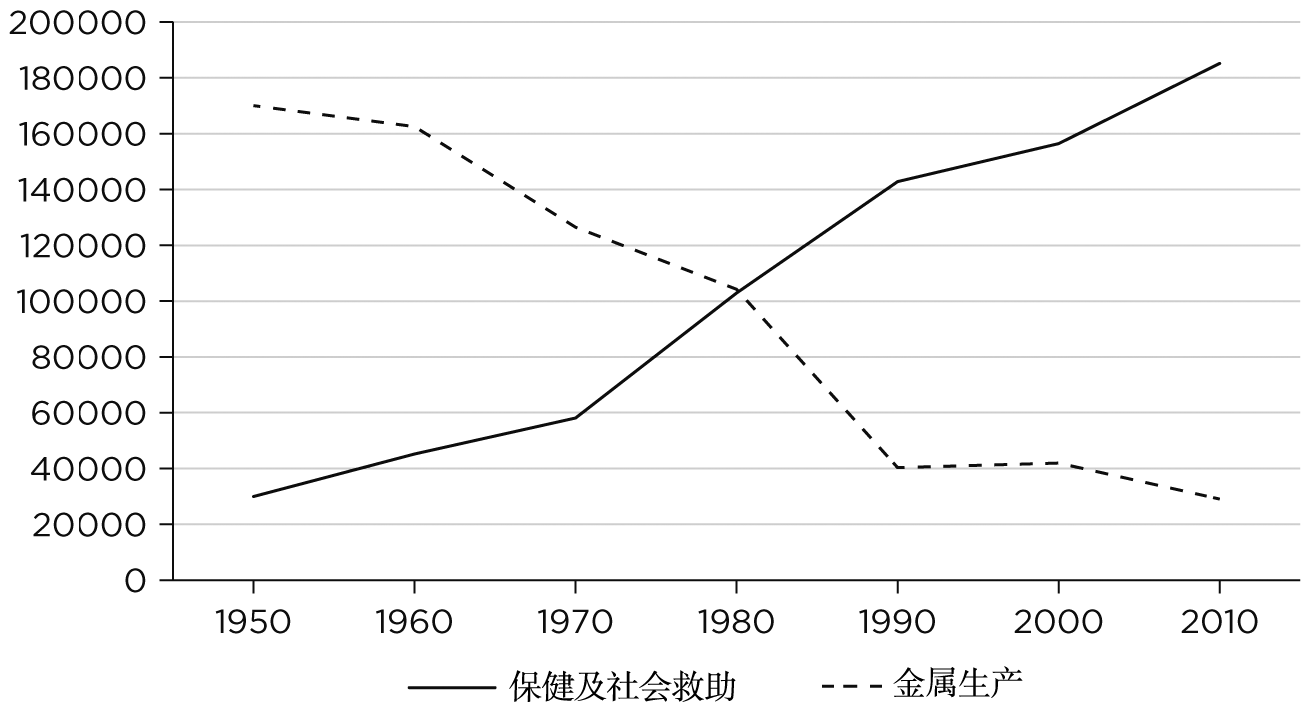 图. 1 1950—2010年匹兹堡地区金属生产与保健及社会救助的就业情况。