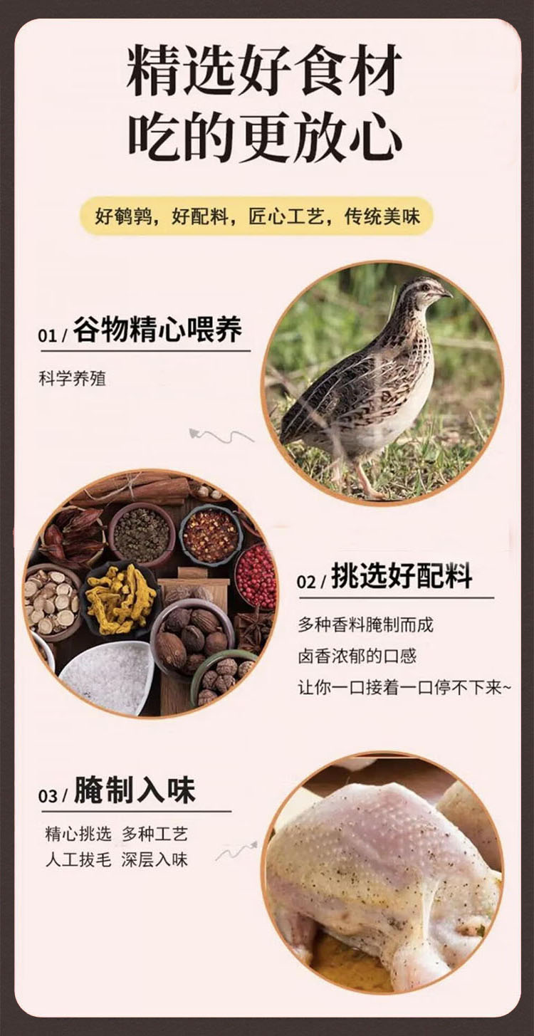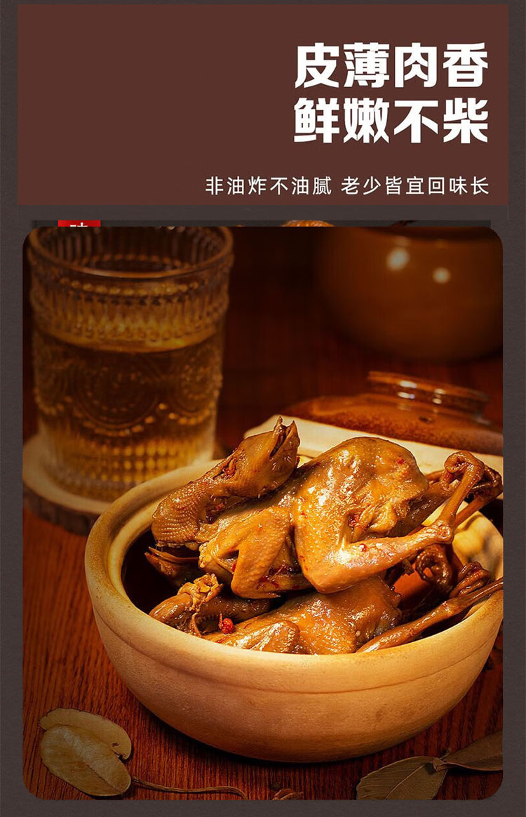 五香鹌鹑,24袋装,严选肥美健硕大鹌鹑,天然香辛料,古法焖烧工艺上色提香,特别添加黄芪和党参,配料表干净,肉质嫩滑细腻,醇香入口,美味有营养M