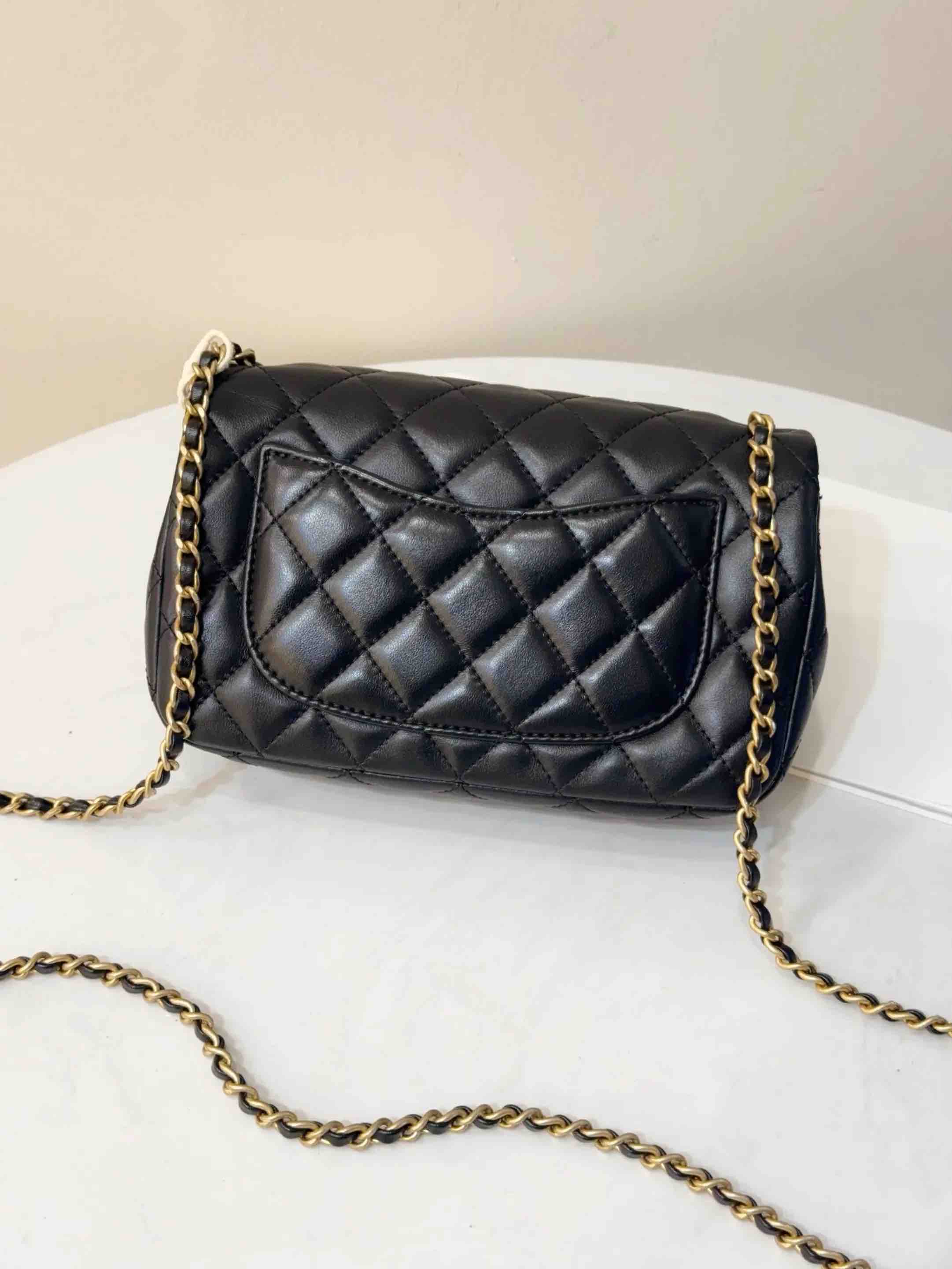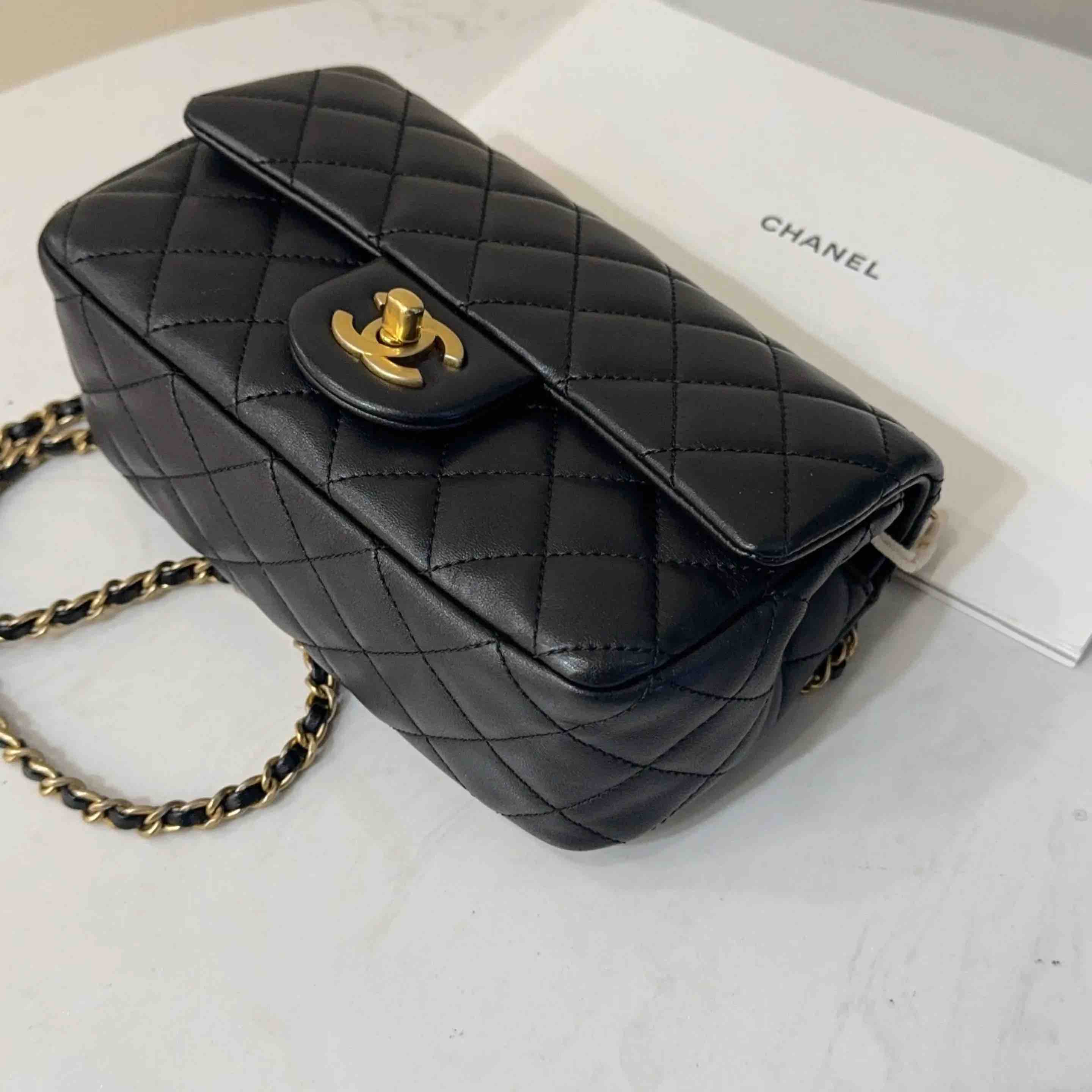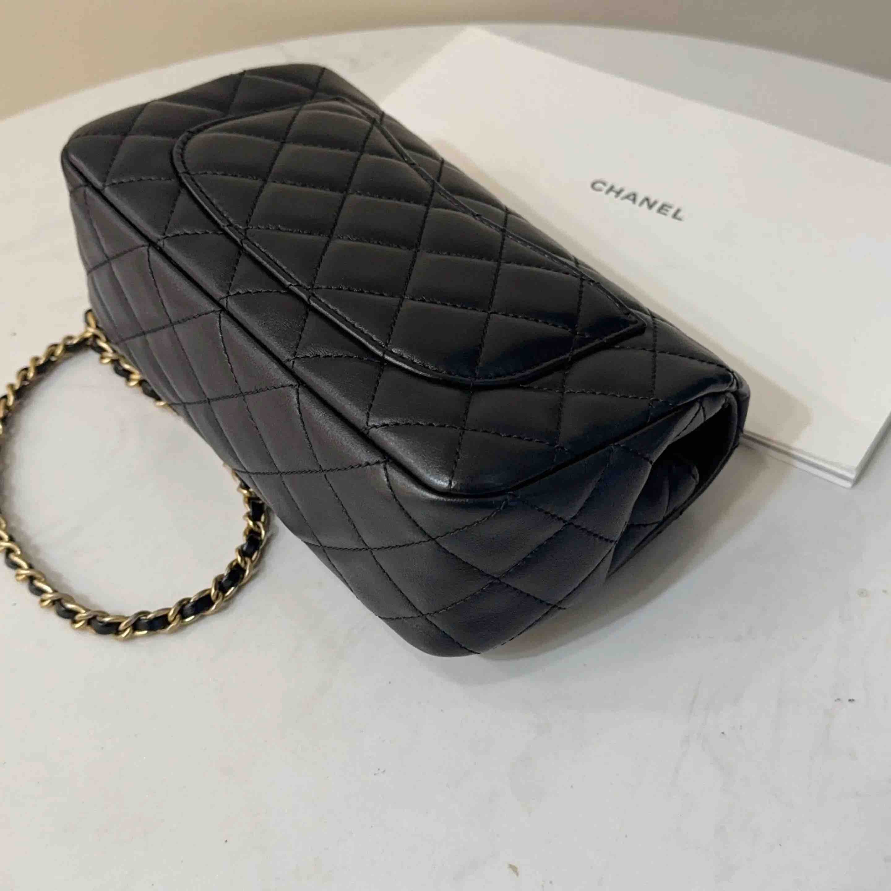 【商品详情】正品二手 CHANEL CF 大mini 黑金 羊皮 斜挎包💧97新 21x12 镭射30开 配件:防尘袋 盒子。黄金尺寸超实用款