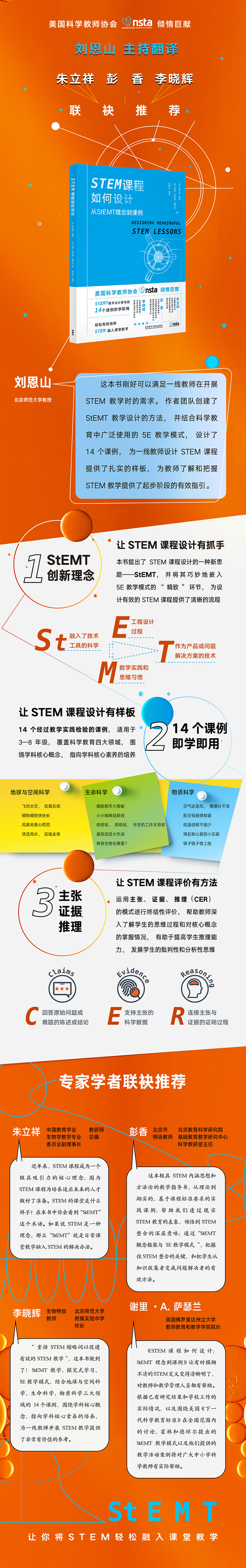 “重排STEM缩略词以促进有效的STEM教学”,这本书做到了!StEMT教学、探究式学习、5E教学模式,结合地球与空间科学、生命科学、物质科学三大领域的14个课例,围绕学科核心概念,指向学科核心素养的培养,为一线教师开展STEM教学提供了非常有价值的参考。