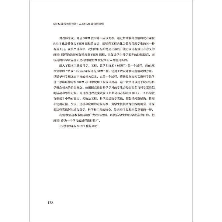 本书的作者米尔顿·霍林(Milton Huling)和杰姬·斯皮克·德怀尔(JackieSpeake Dwyer)讨论了这一话题,他们认为STEM教学不仅仅是涉及一个或多个STEM学科的教学。在本书中,作者从科学教育工作者的角度探讨了STEM教学。他们认为在STEM课程中,“数学、技术和工程的整合应该用来支持科学概念的学习”。为了强调这一点,霍林和德怀尔提出了StEMT理念。StEMT教学模式以众所周知的5E教学模式——5E学习环——开始,将工程挑战嵌入到“精致”环节。本书还附有大量“StEMT化”的课例,以展示这种教学模式的潜力。