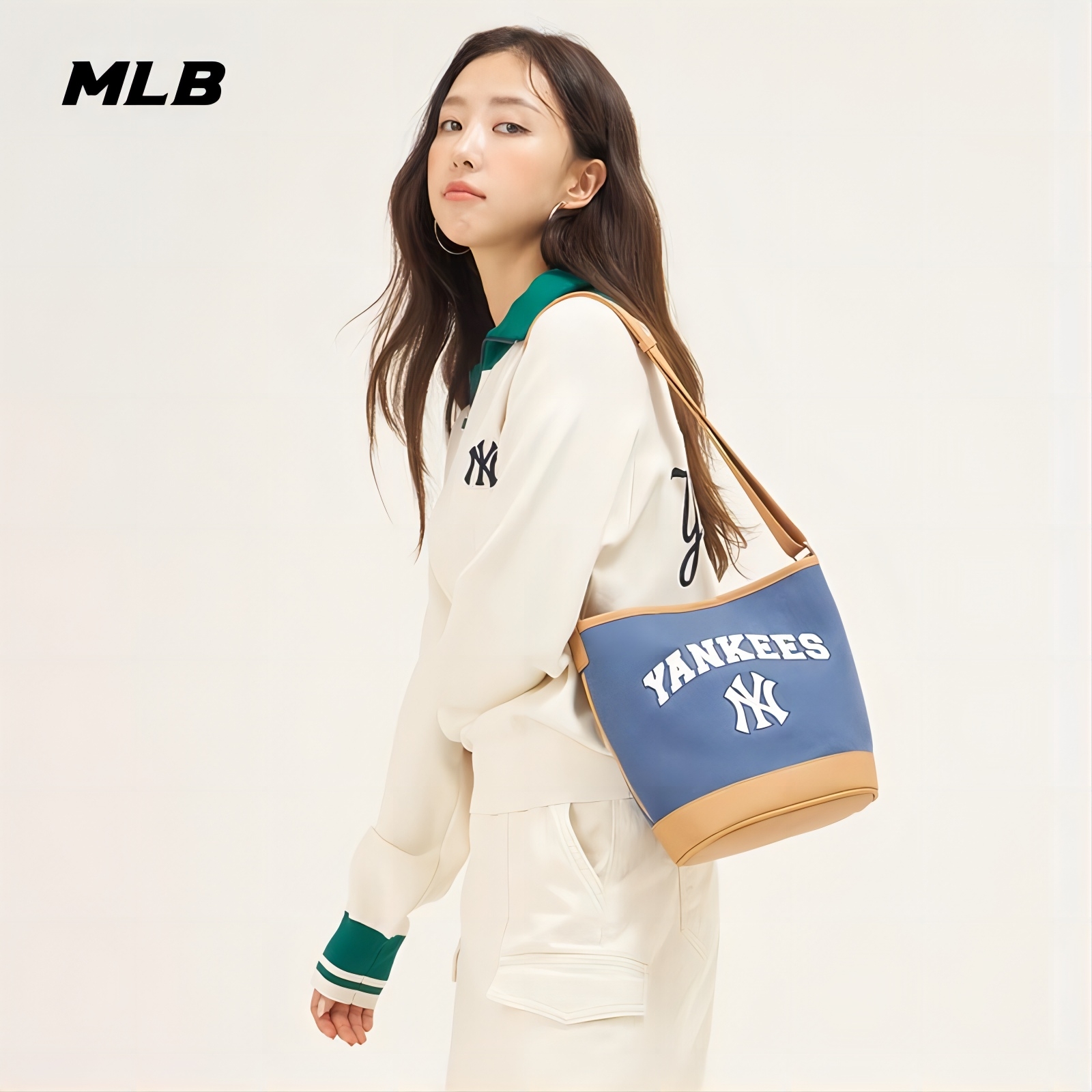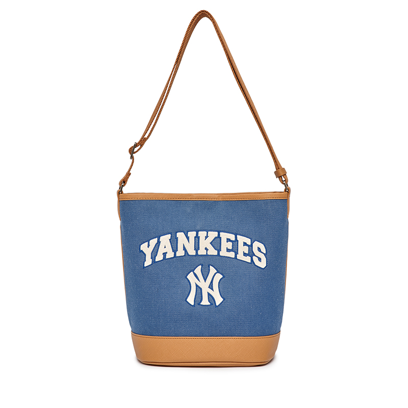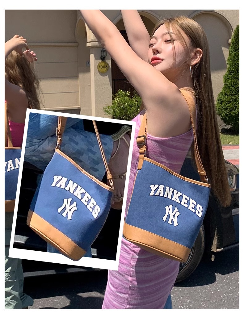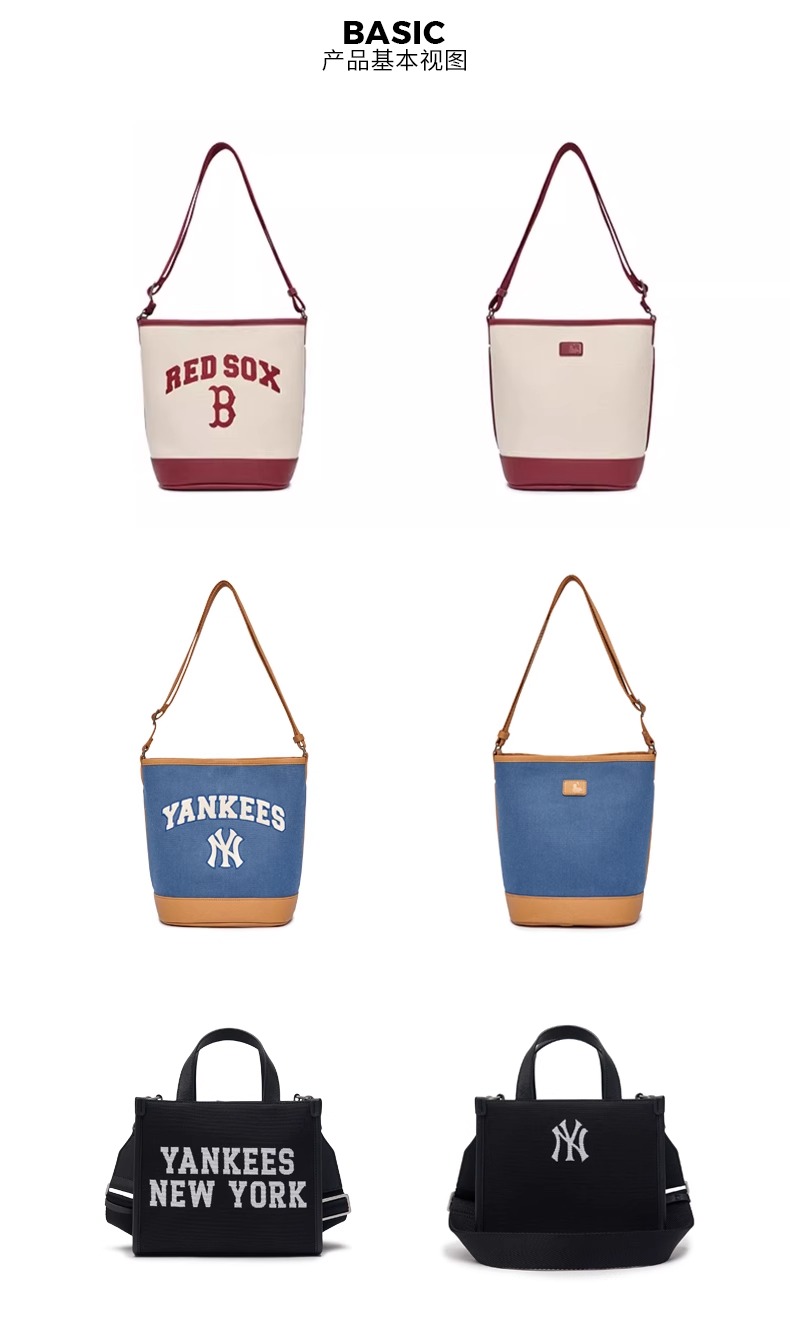 【品牌授权】扫码验证 韩国MLB 帆布拼棉字母水桶包-酒红色B 靛蓝色NY 深奶油色NY 女新款老花满印休闲时尚运动背包 3ABMS093N