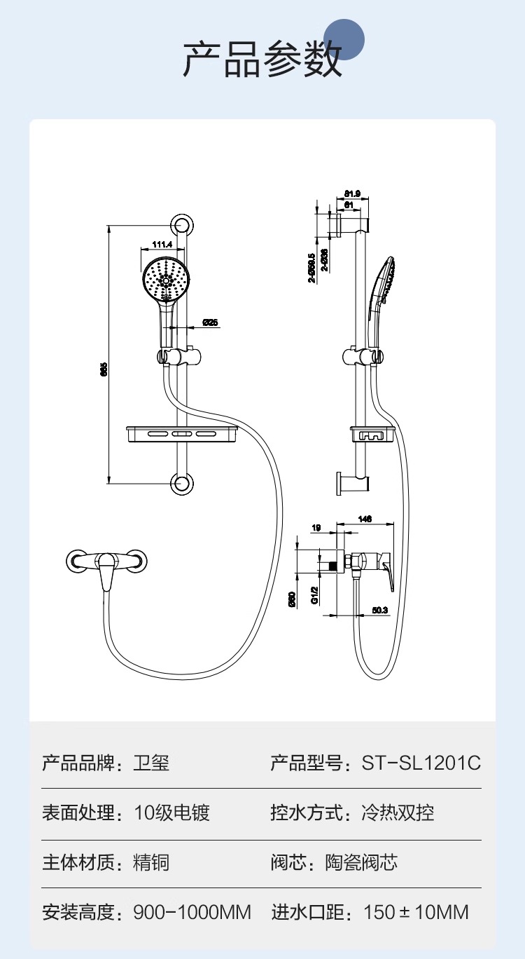 海尔花洒套装自由升降三挡调节淋浴ST-SL1201C(不带顶喷)