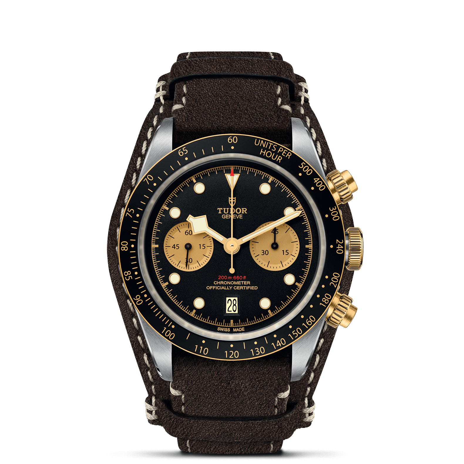 旋入式上链表冠,饰以浮雕帝舵表玫瑰标志;黄金旋入式按钮位于2点钟及4点钟位置:精钢覆有0.3毫米18K黄金薄层