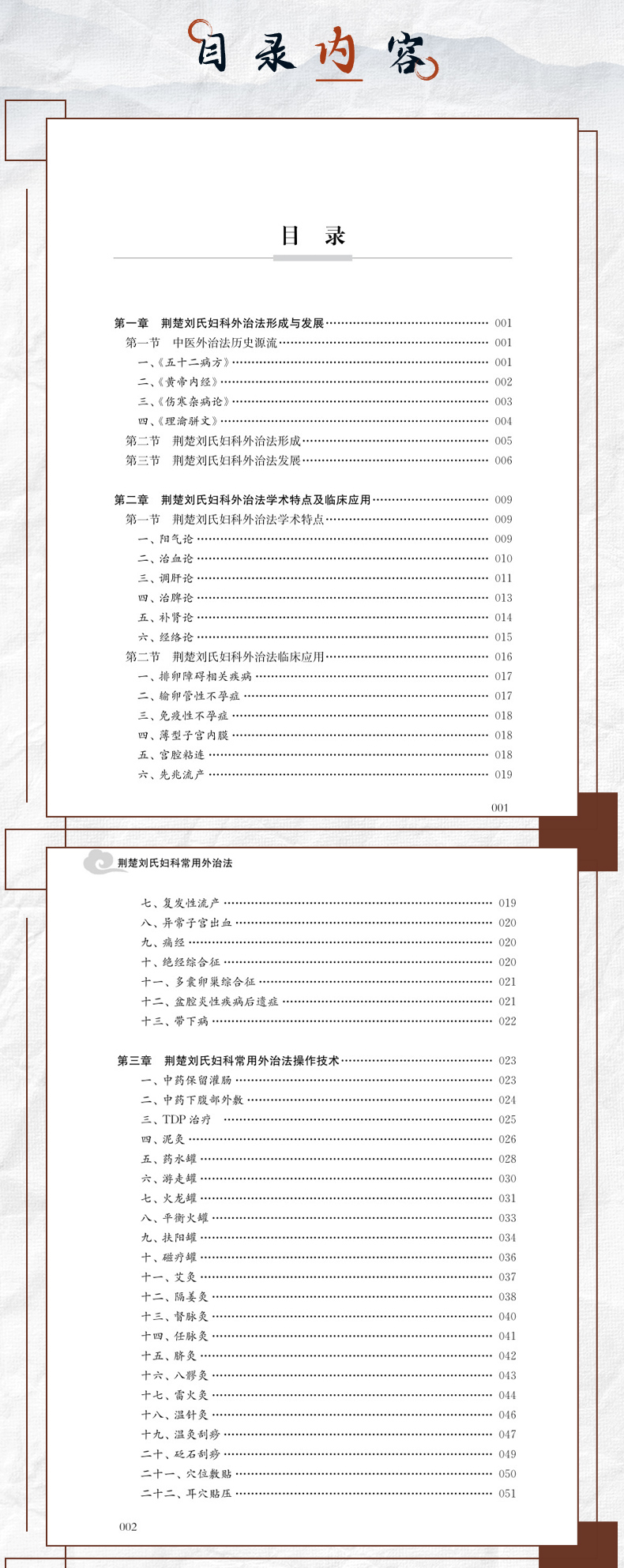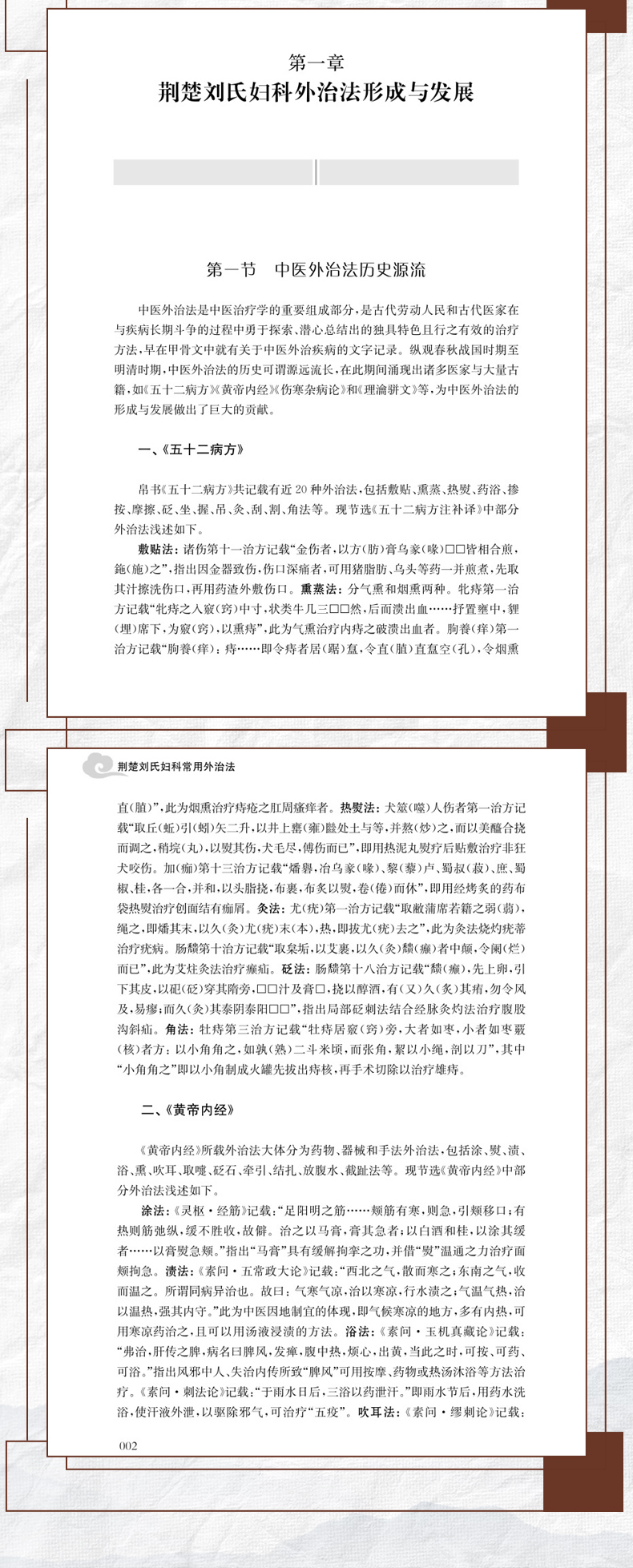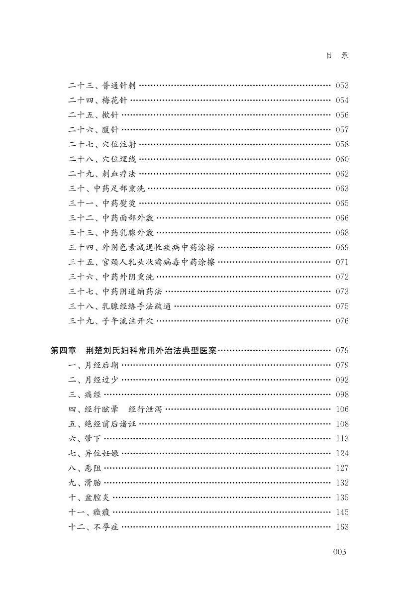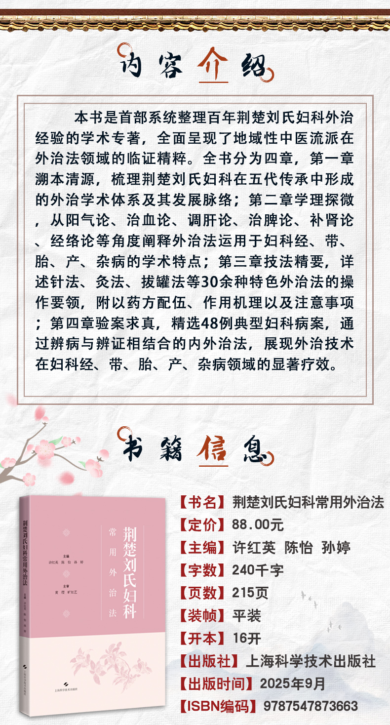 本书是首部系统整理百年荆楚刘氏妇科外治经验的学术专著,全面呈现了地域性中医流派在外治法领域的临证精粹。全书分为四章,第一章溯本清源,梳理荆楚刘氏妇科在五代传承中形成的外治学术体系及其发展脉络;第二章学理探微,从阳气论、治血论、调肝论、治脾论、补肾论、经络论等角度阐释外治法运用于妇科经、带、胎、产、杂病的学术特点;第三章技法精要,详述针法、灸法、拔罐法等30余种特色外治法的操作要领,附以药方配伍、作用机理以及注意事项;第四章验案求真,精选48例典型妇科病案,通过辨病与辨证相结合的内外治法,展现外治技术在妇科经、带、胎、产、杂病领域的显著疗效。本书既可作为中医妇科外治法教学参考用书,亦为临床医师拓展治疗思路提供翔实范本,具有重要的文献传承价值和临床指导意义。