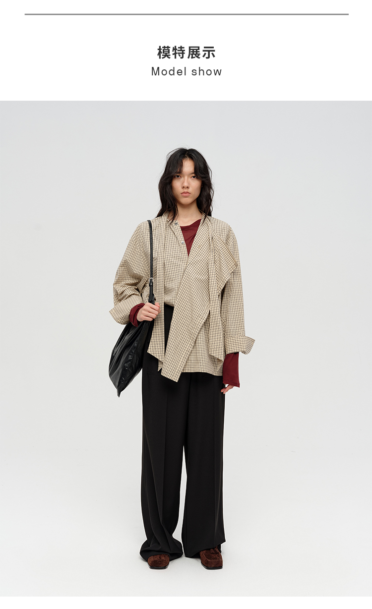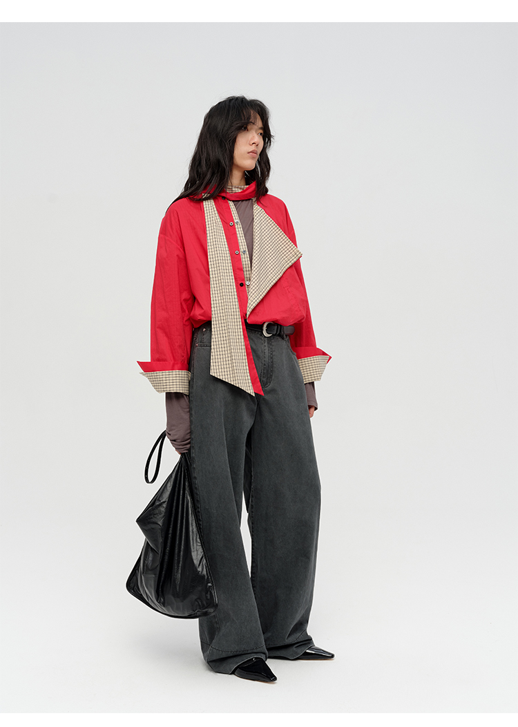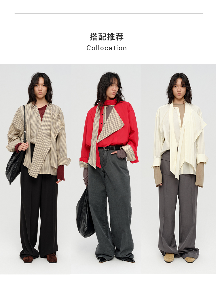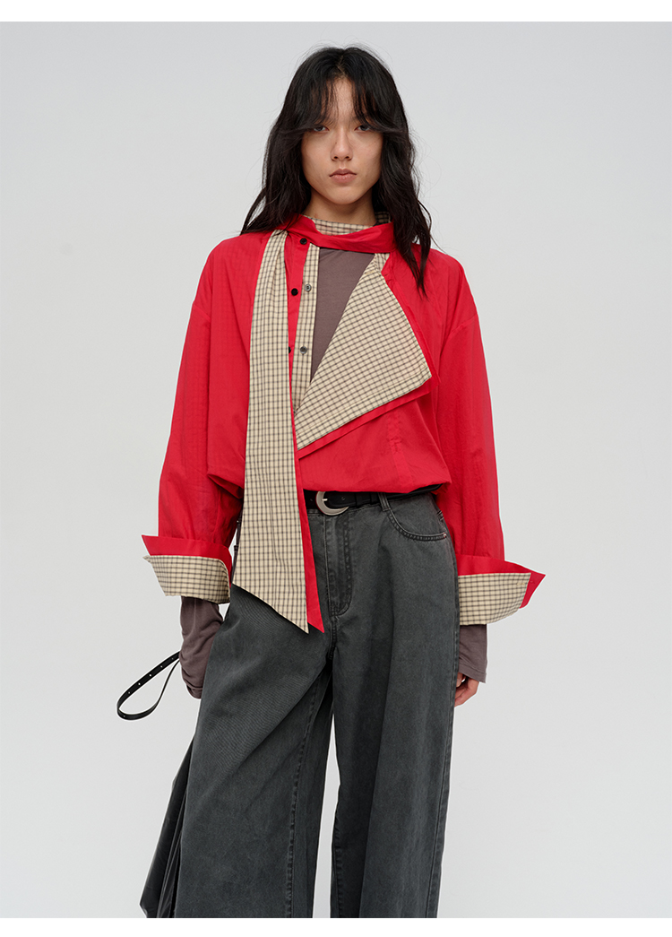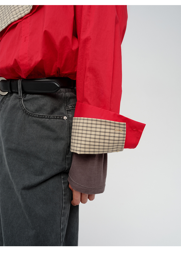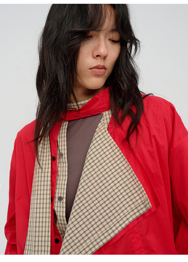HIDEMI 极简廓形不对称堆叠感设计感圆领长袖衬衫上衣 马斯正红/奶油米/色织格纹