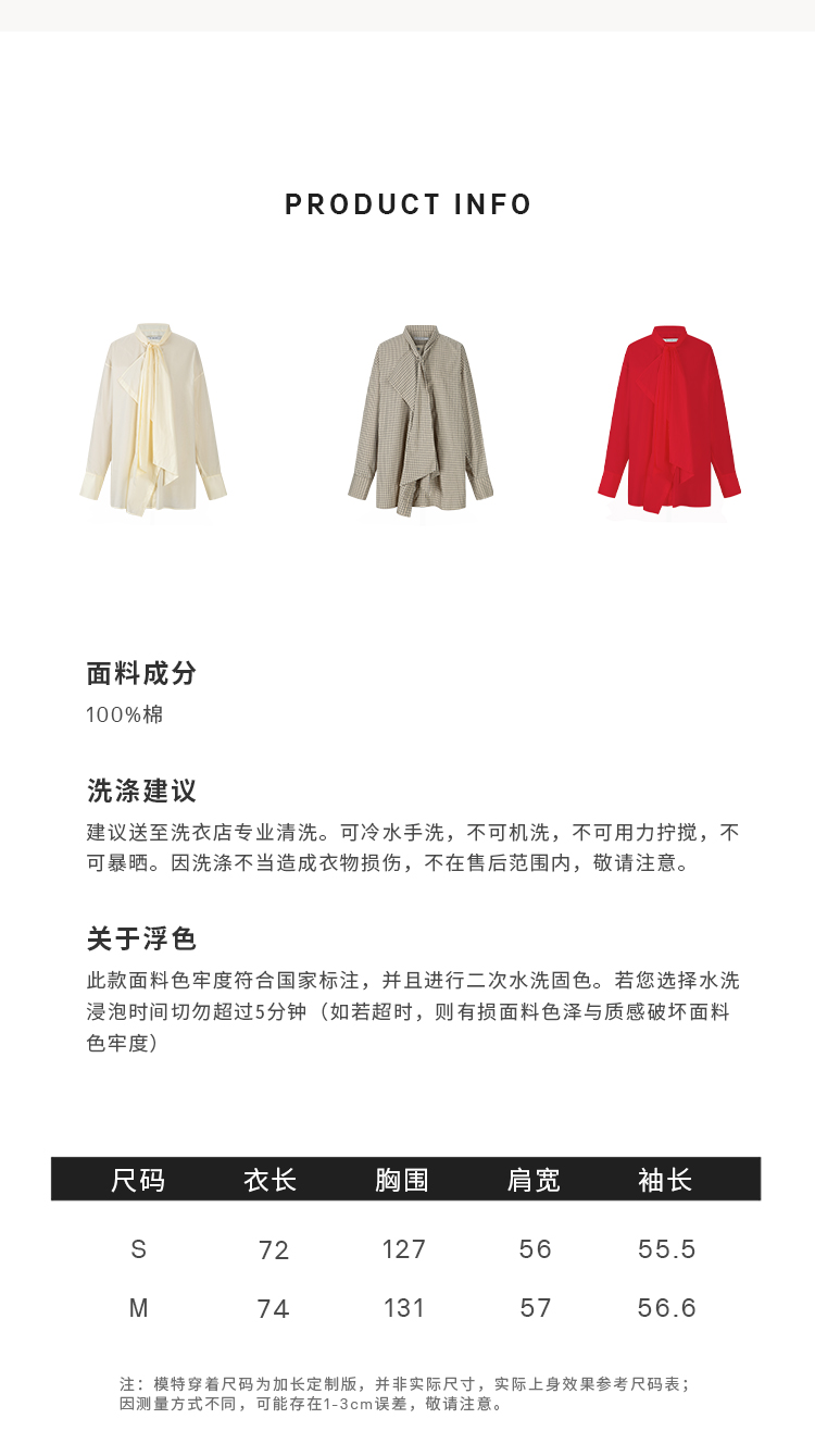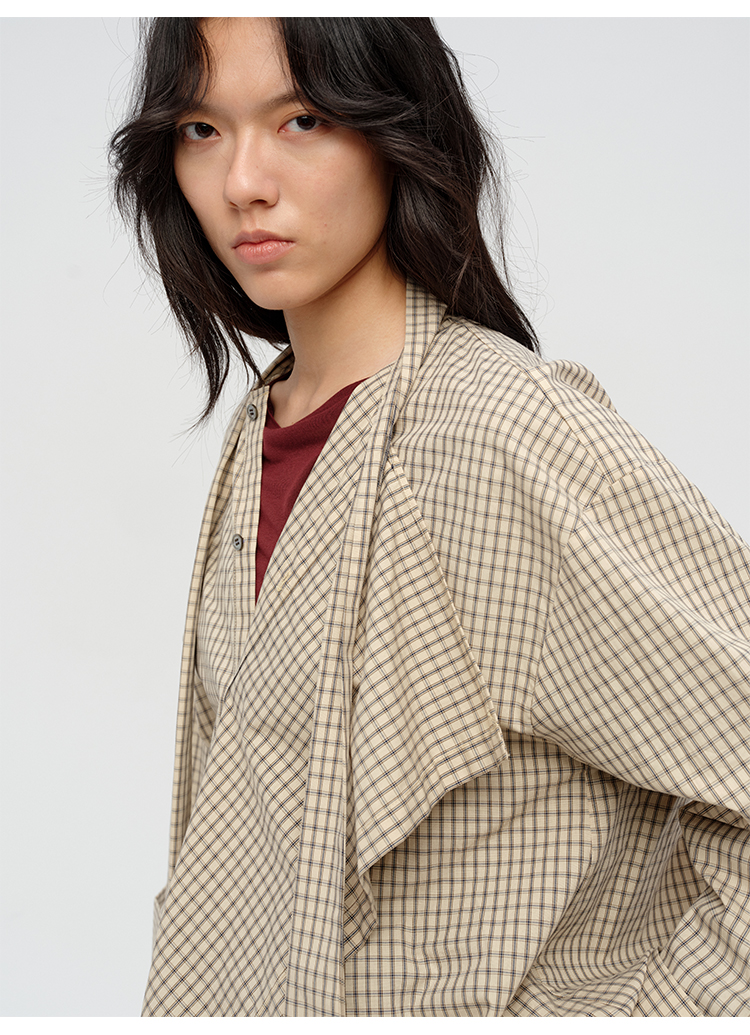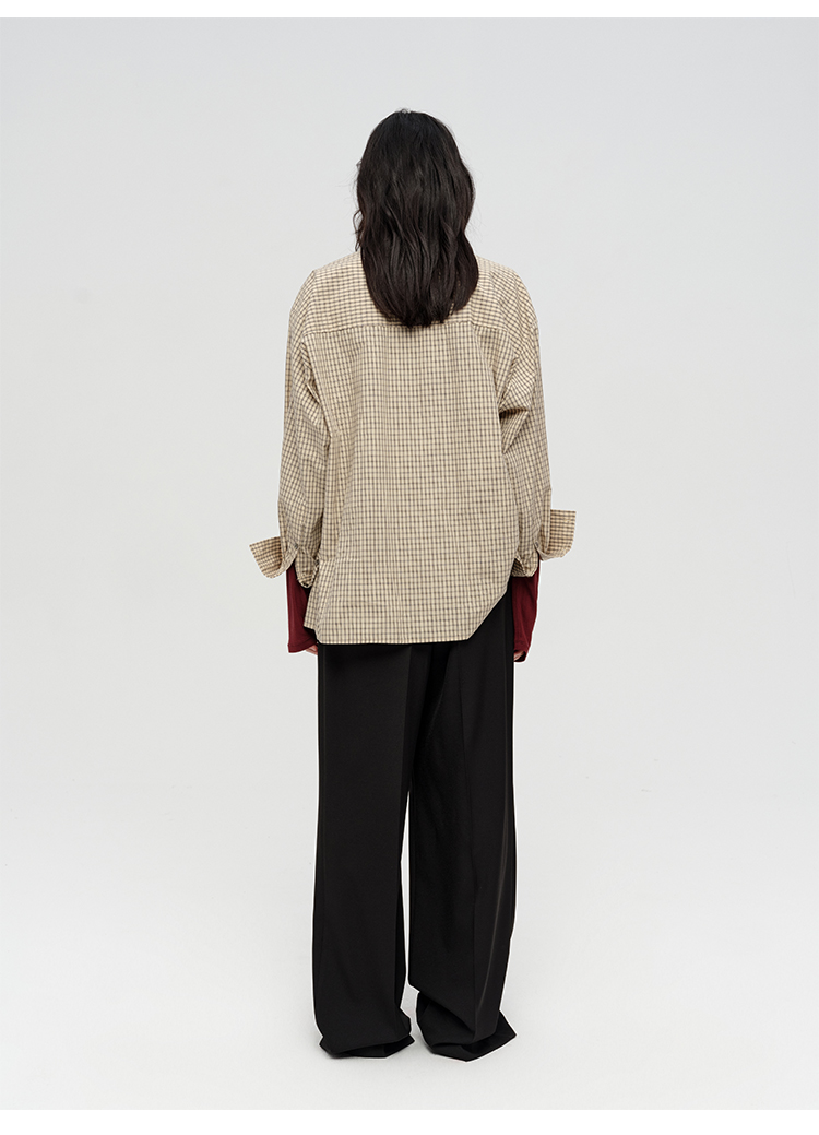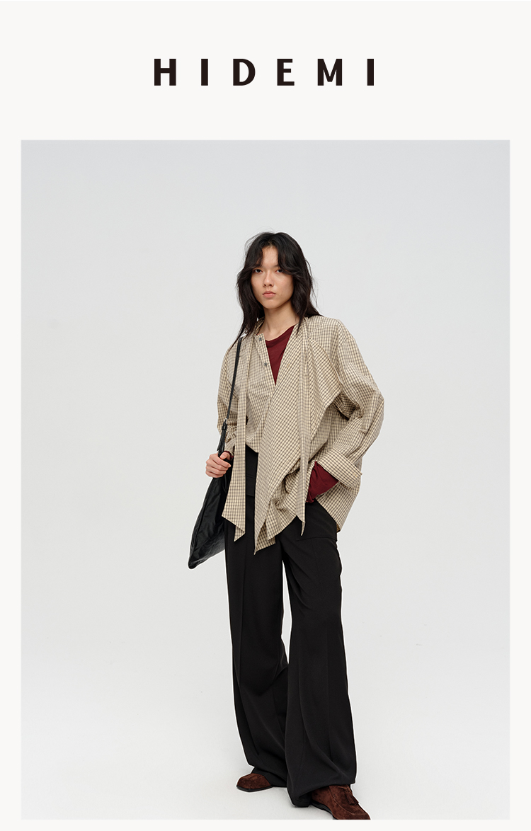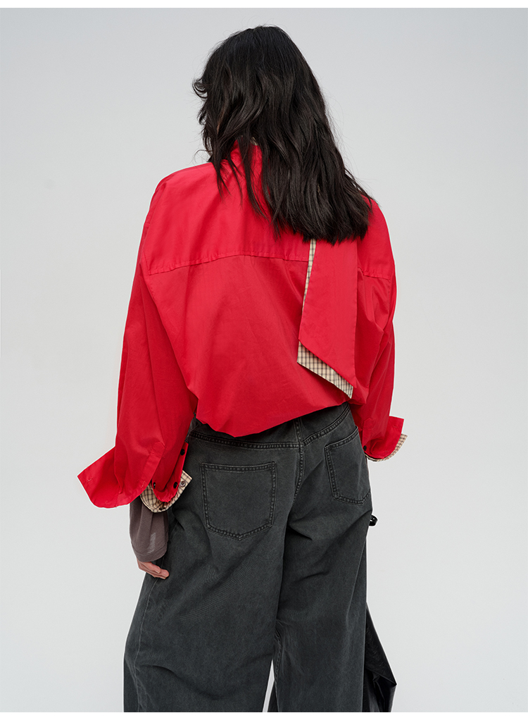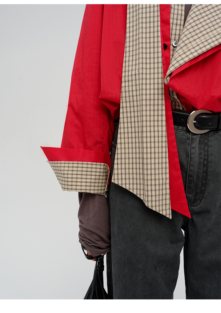 HIDEMI 极简廓形不对称堆叠感设计感圆领长袖衬衫上衣 马斯正红/奶油米/色织格纹