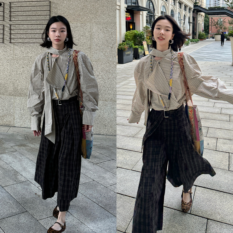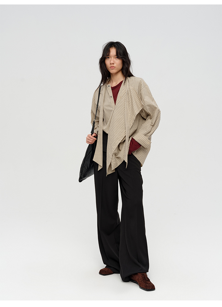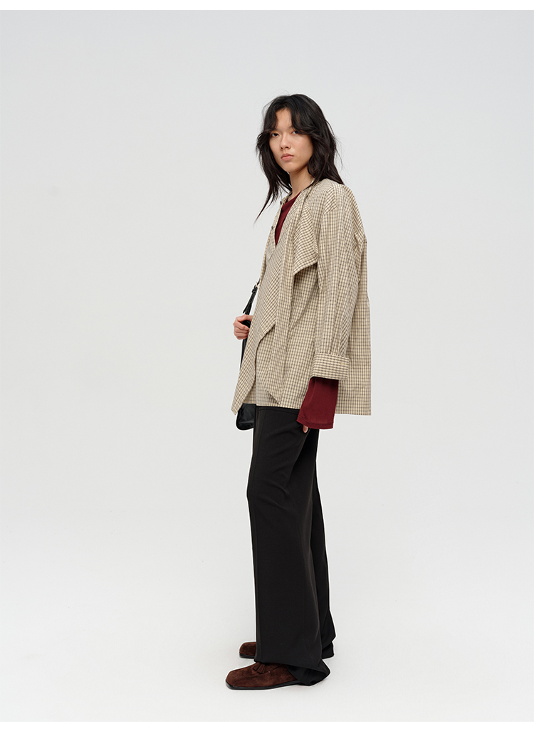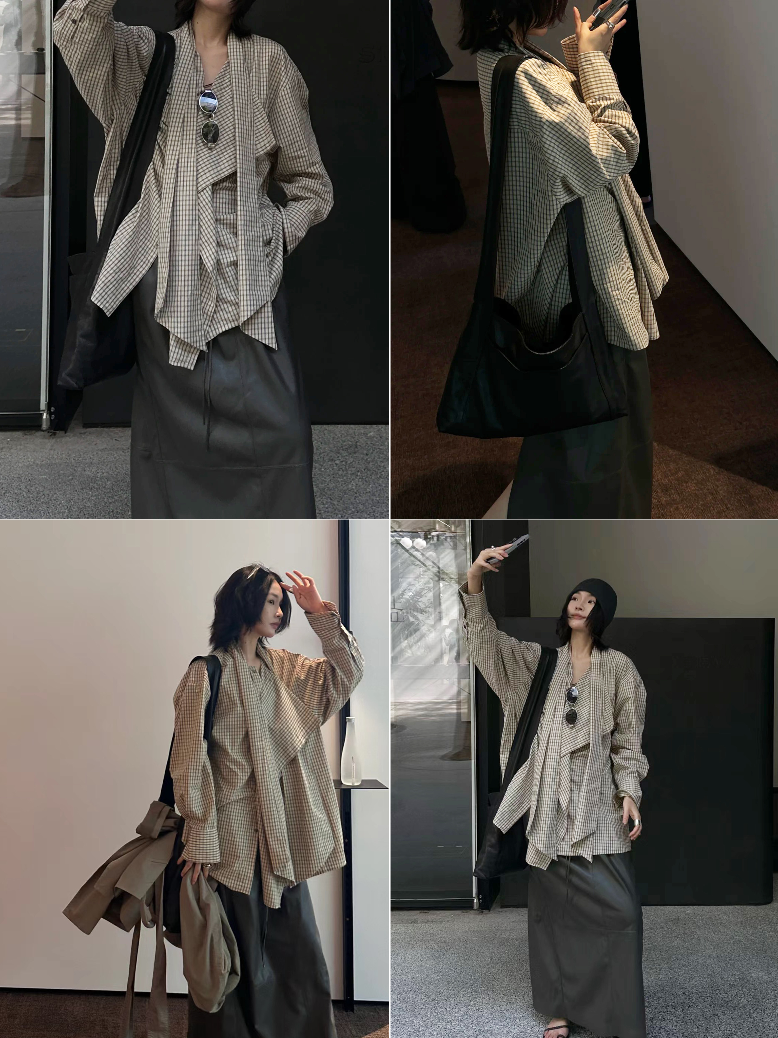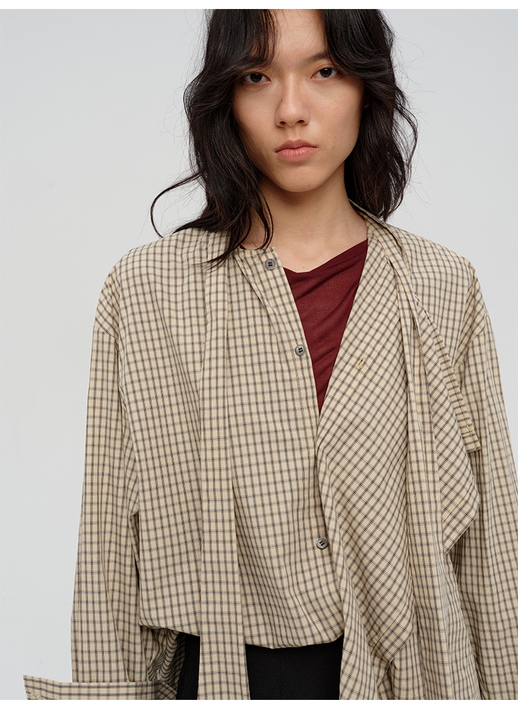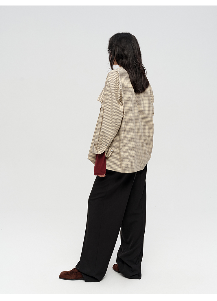 HIDEMI 极简廓形不对称堆叠感设计感圆领长袖衬衫上衣 马斯正红/奶油米/色织格纹