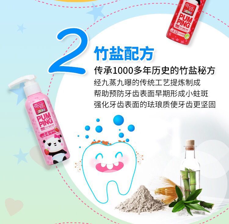 【预售 急单慎拍】竹盐儿童派缤按压式牙膏2-6岁粉红草莓