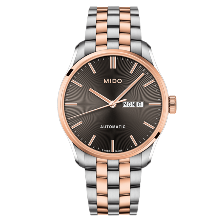 镜面 材质 | 蓝宝石水晶玻璃 | 表盘 | 不锈钢 PVD镀玫瑰金表壳 烟煤灰色表盘 大三针 日期 星期显示 透底 |