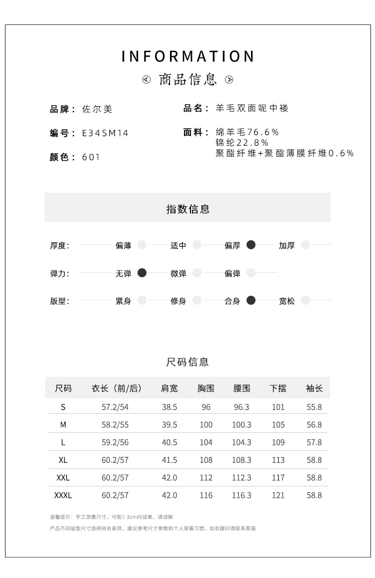 佐尔美冬季新款双面呢大衣纯色呢子大衣外套女中长款E54ST41