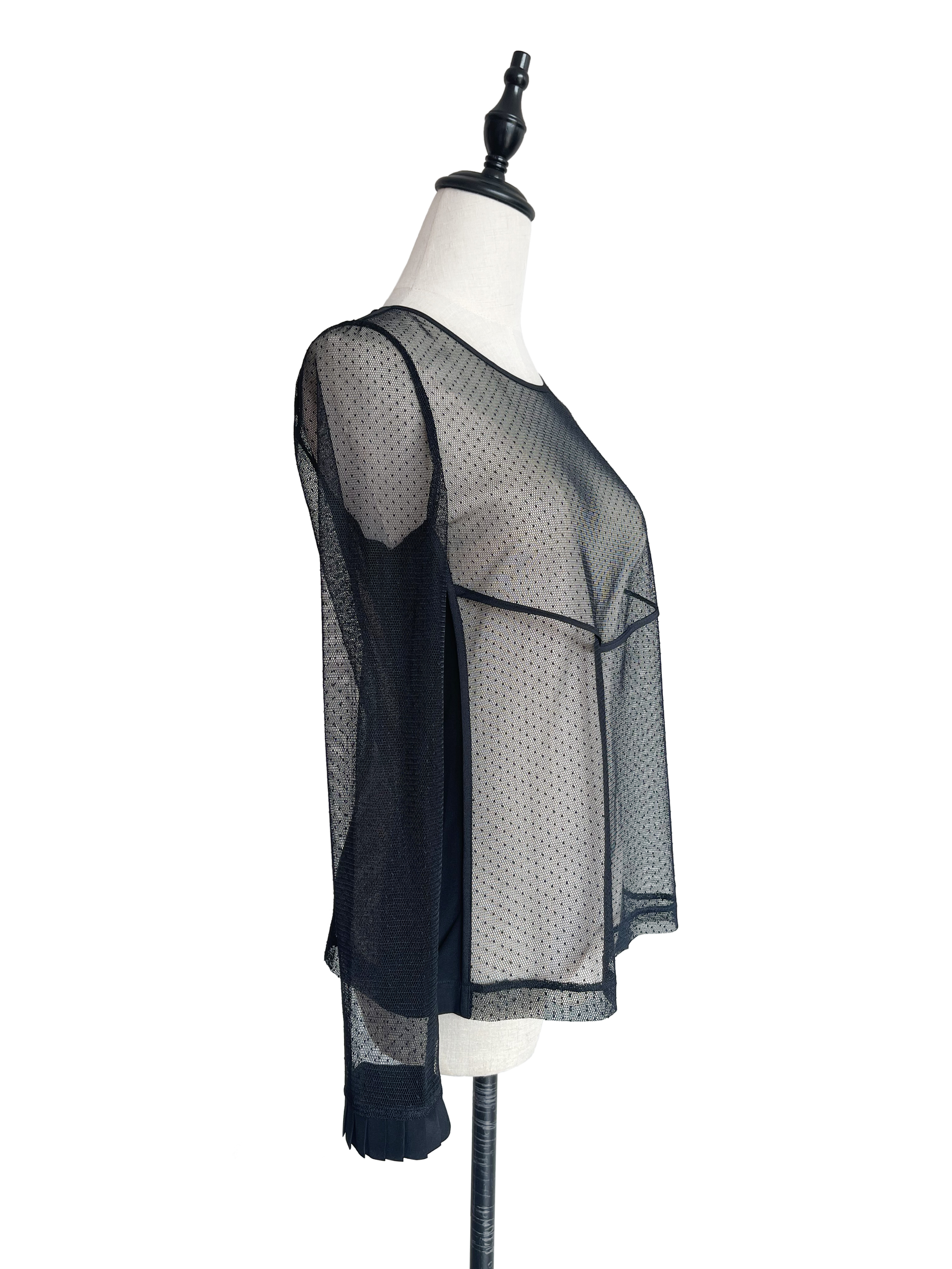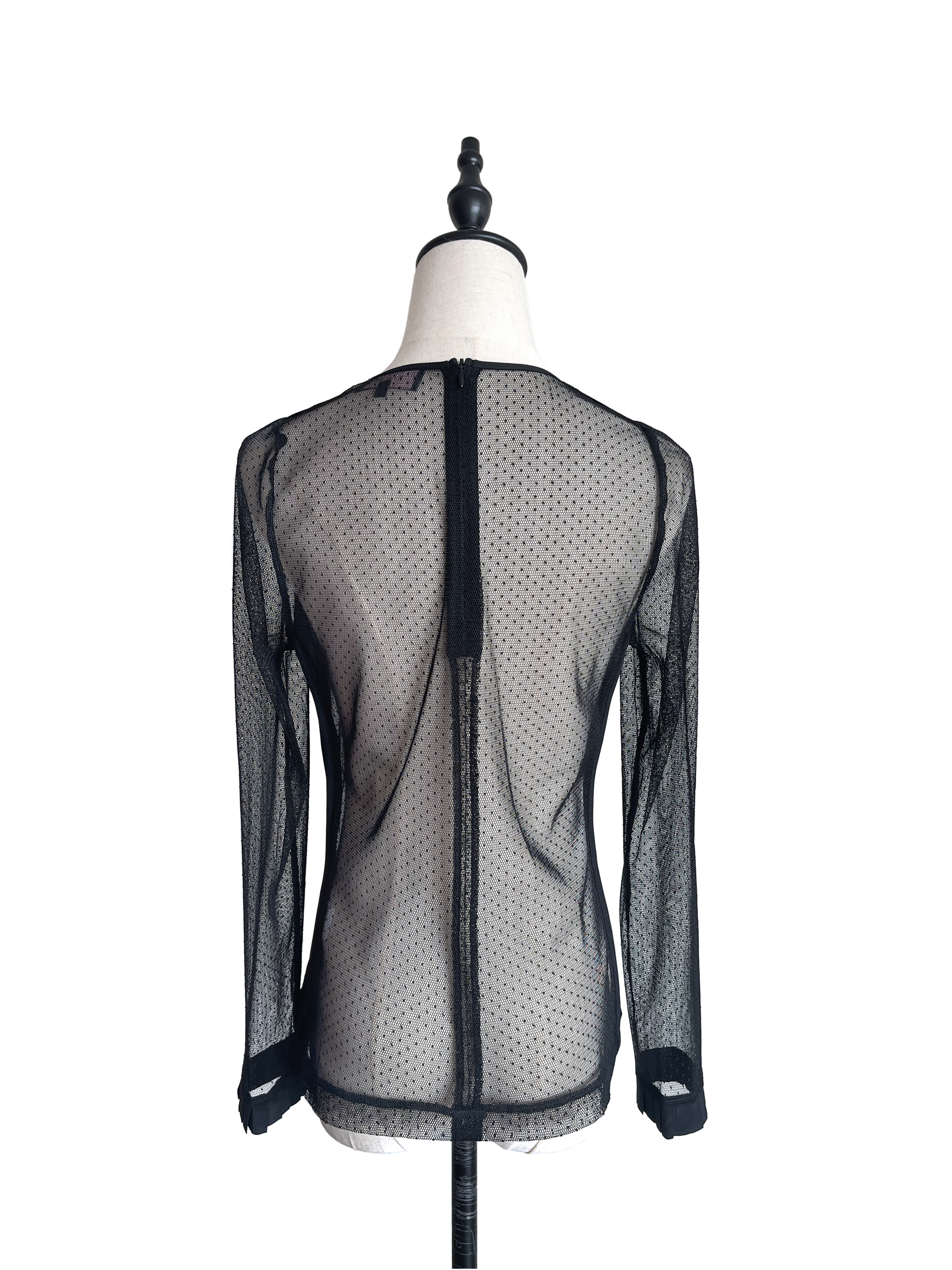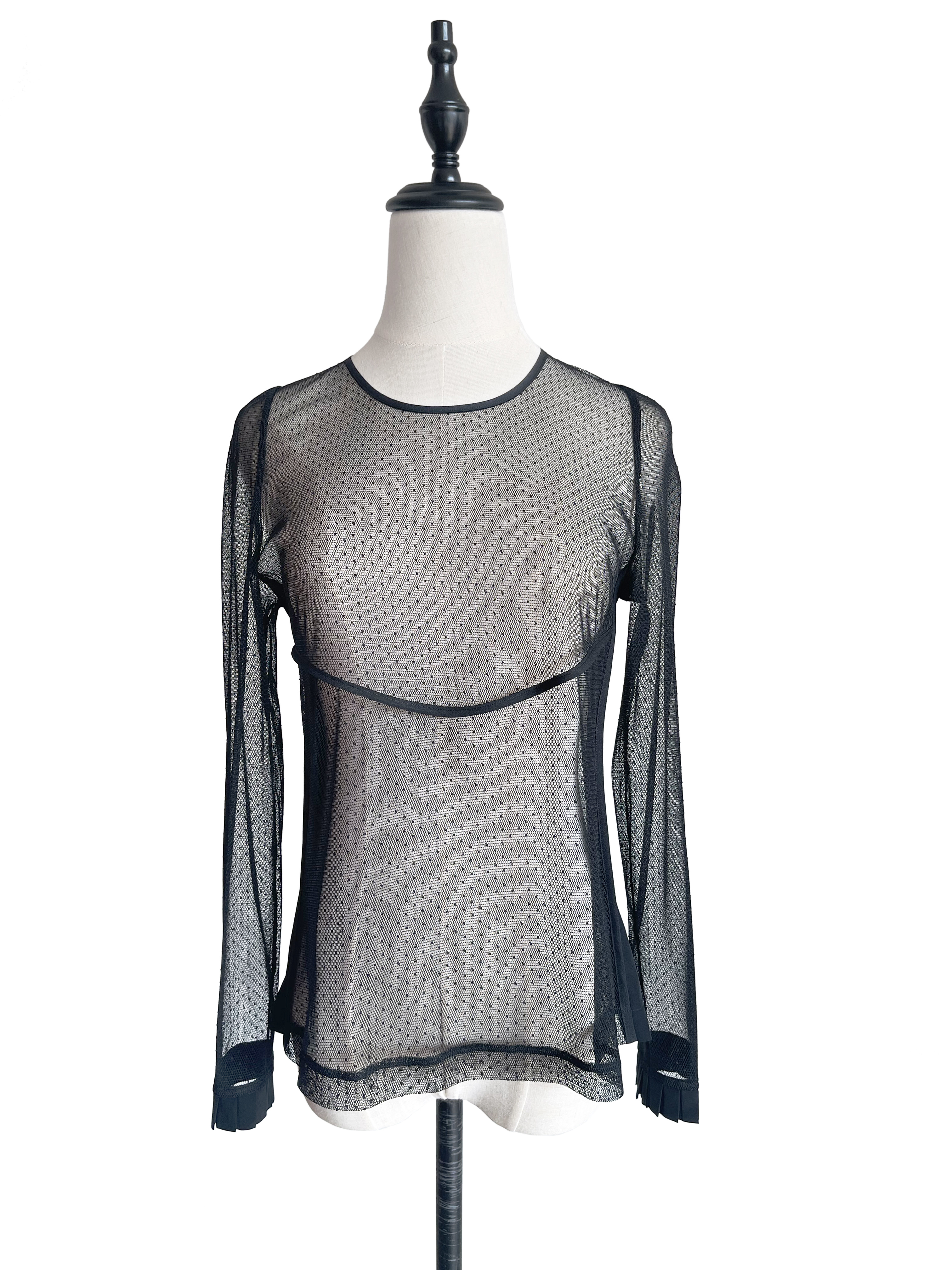 TYNVIE 褶皱袖口镶边花型蕾丝透视长袖上衣-黑色