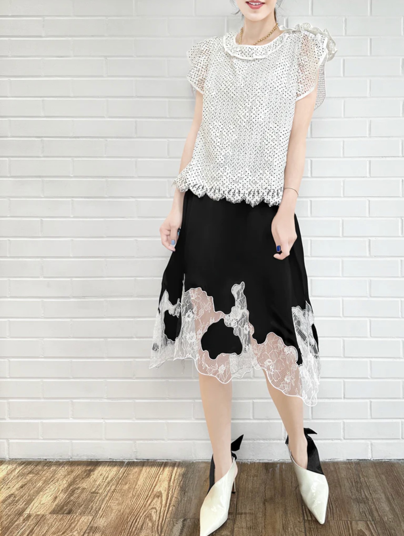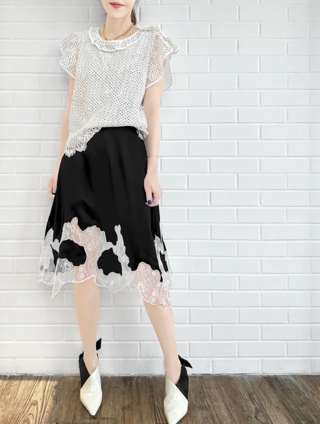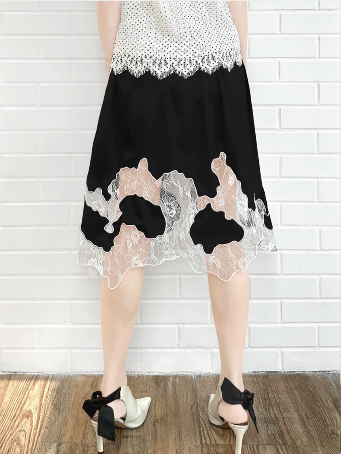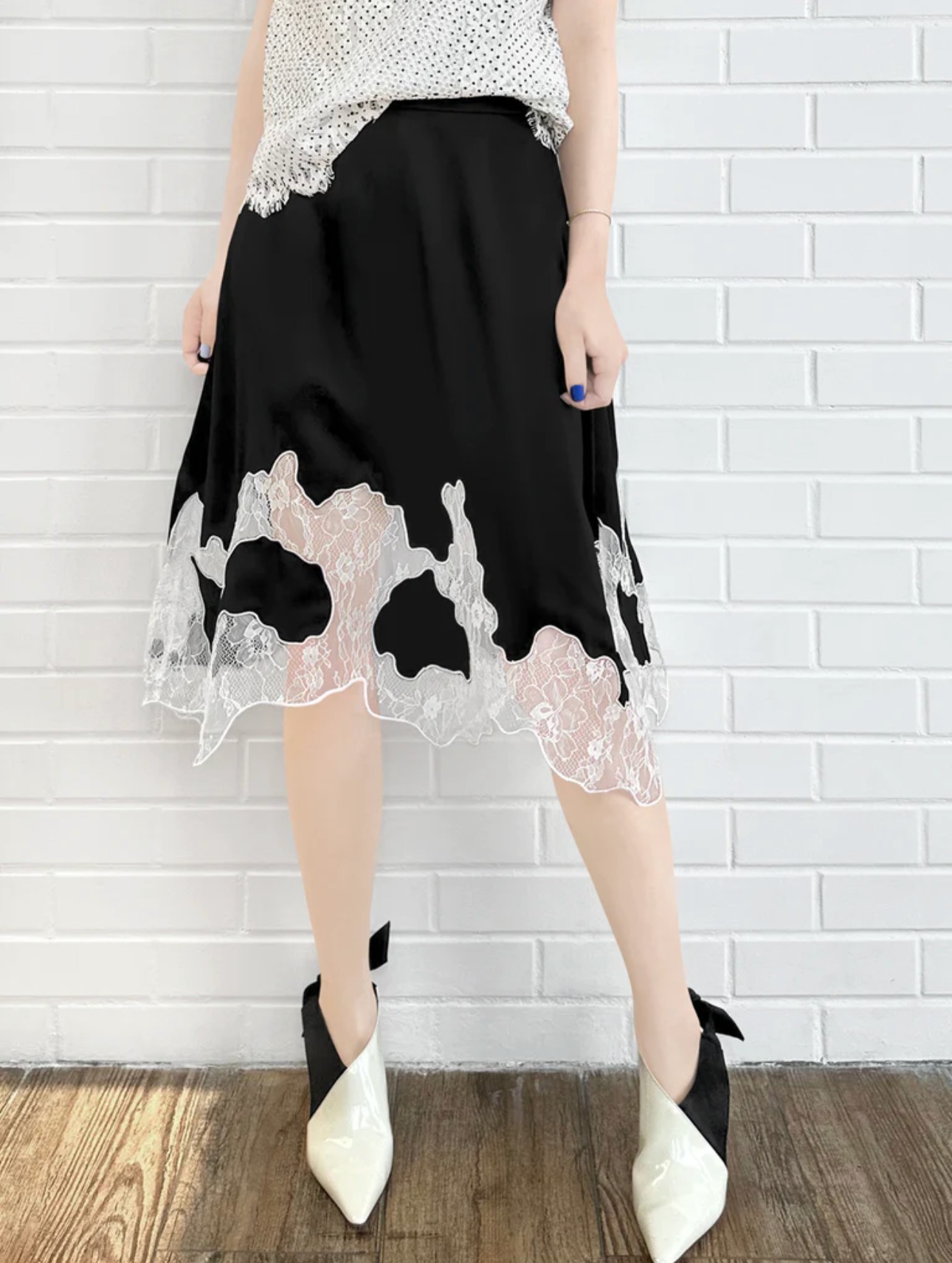 TYNVIE 蕾丝拼接裙摆半身裙-黑色