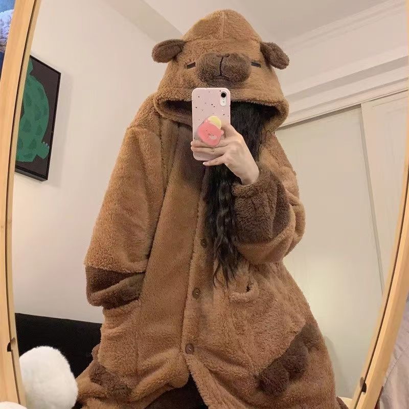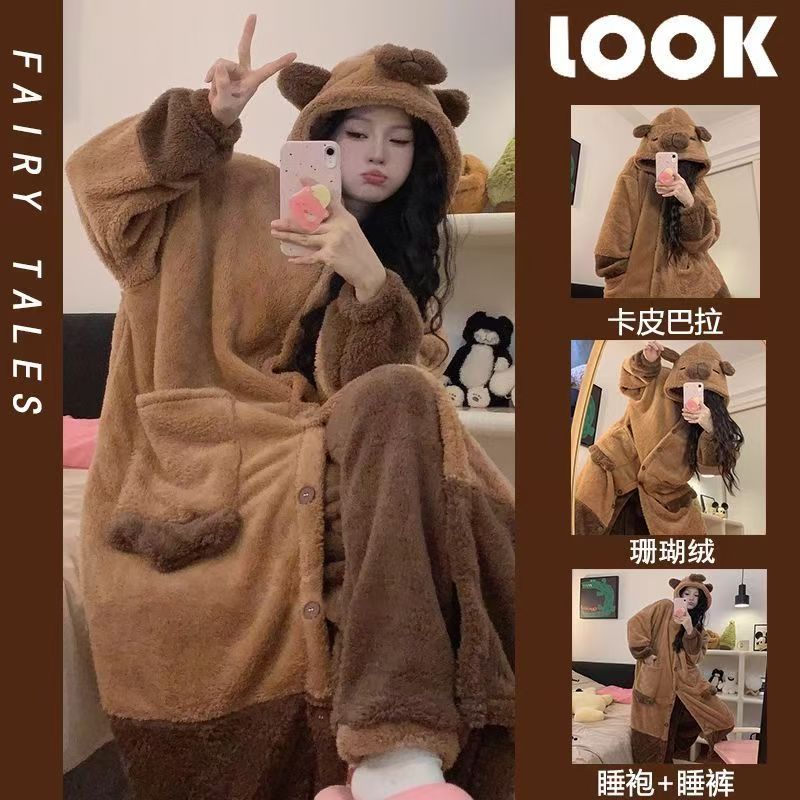 【YW】无忧购【甄选】卡通可爱卡皮巴拉水豚秋冬季加厚睡袍套装珊瑚绒睡衣女家居服(截单后3-5天发货)