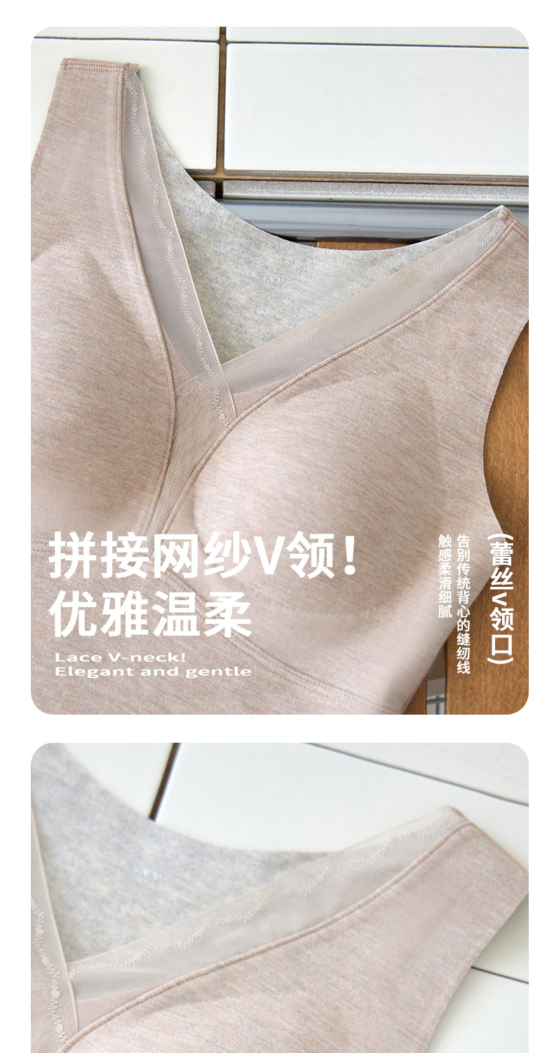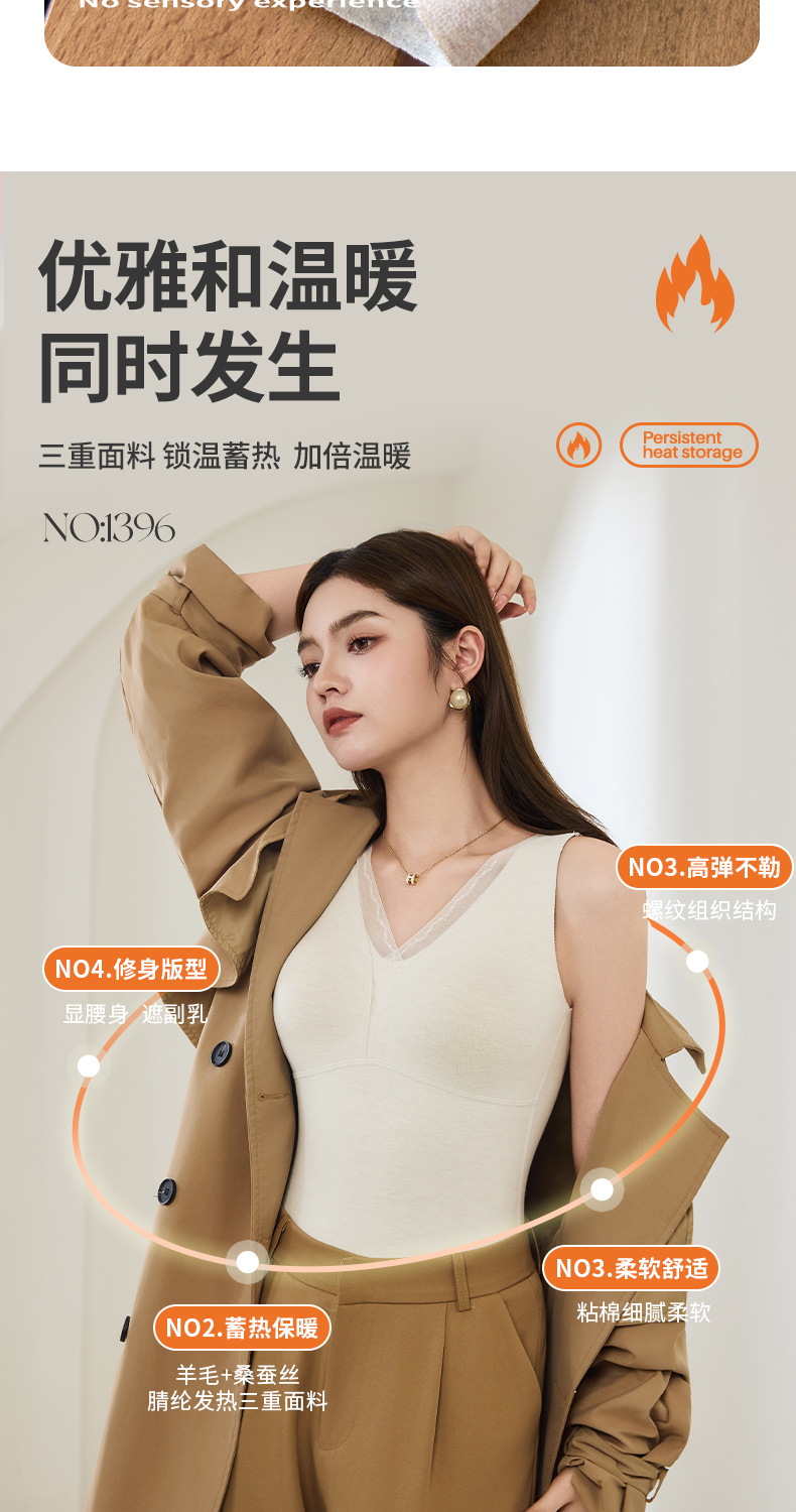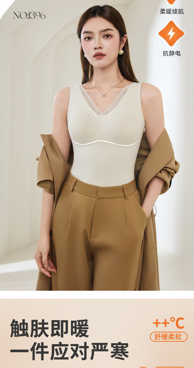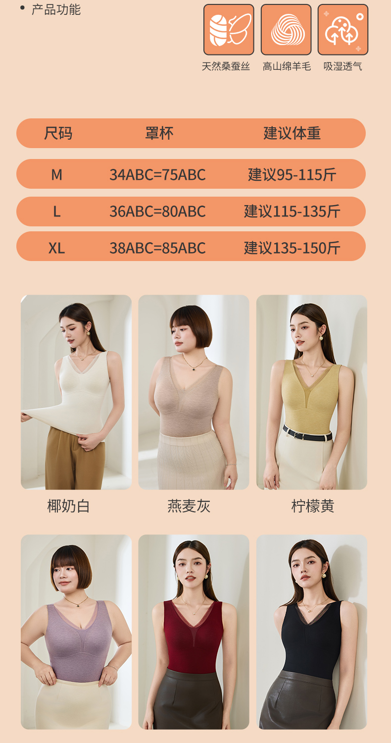 雅客优途25秋冬新款蚕丝美肌拼接网纱V领保暖背免穿文胸打底背心Y2511396