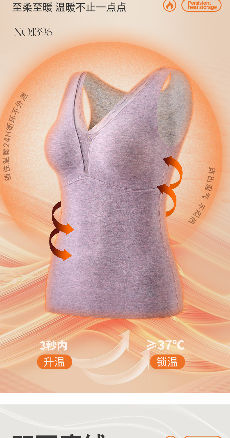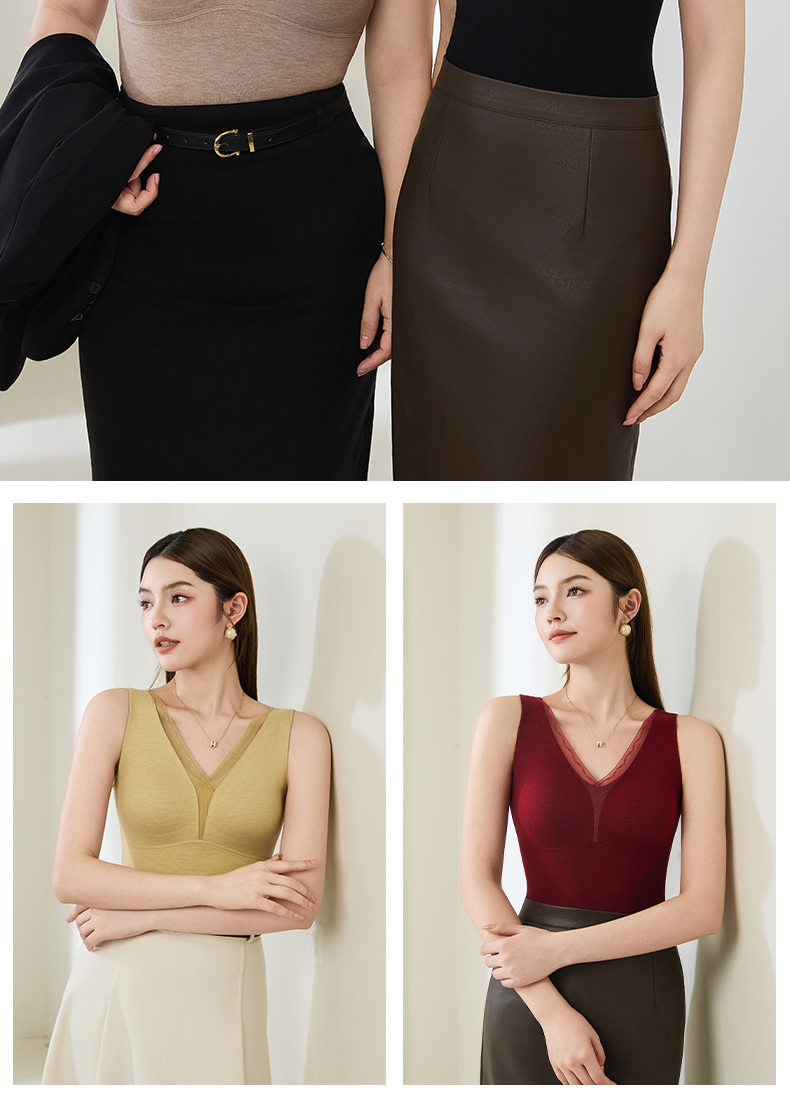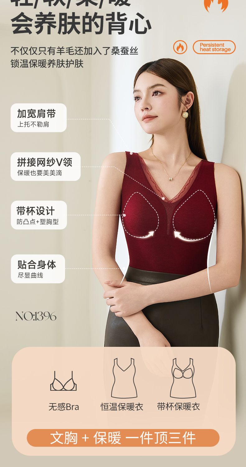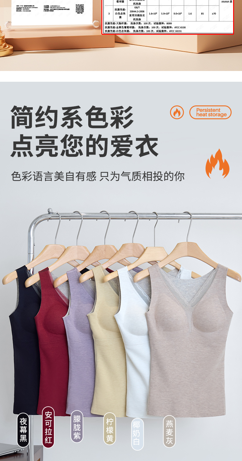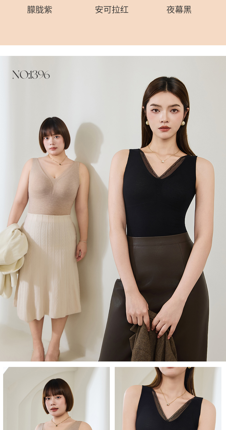 雅客优途25秋冬新款蚕丝美肌拼接网纱V领保暖背免穿文胸打底背心Y2511396
