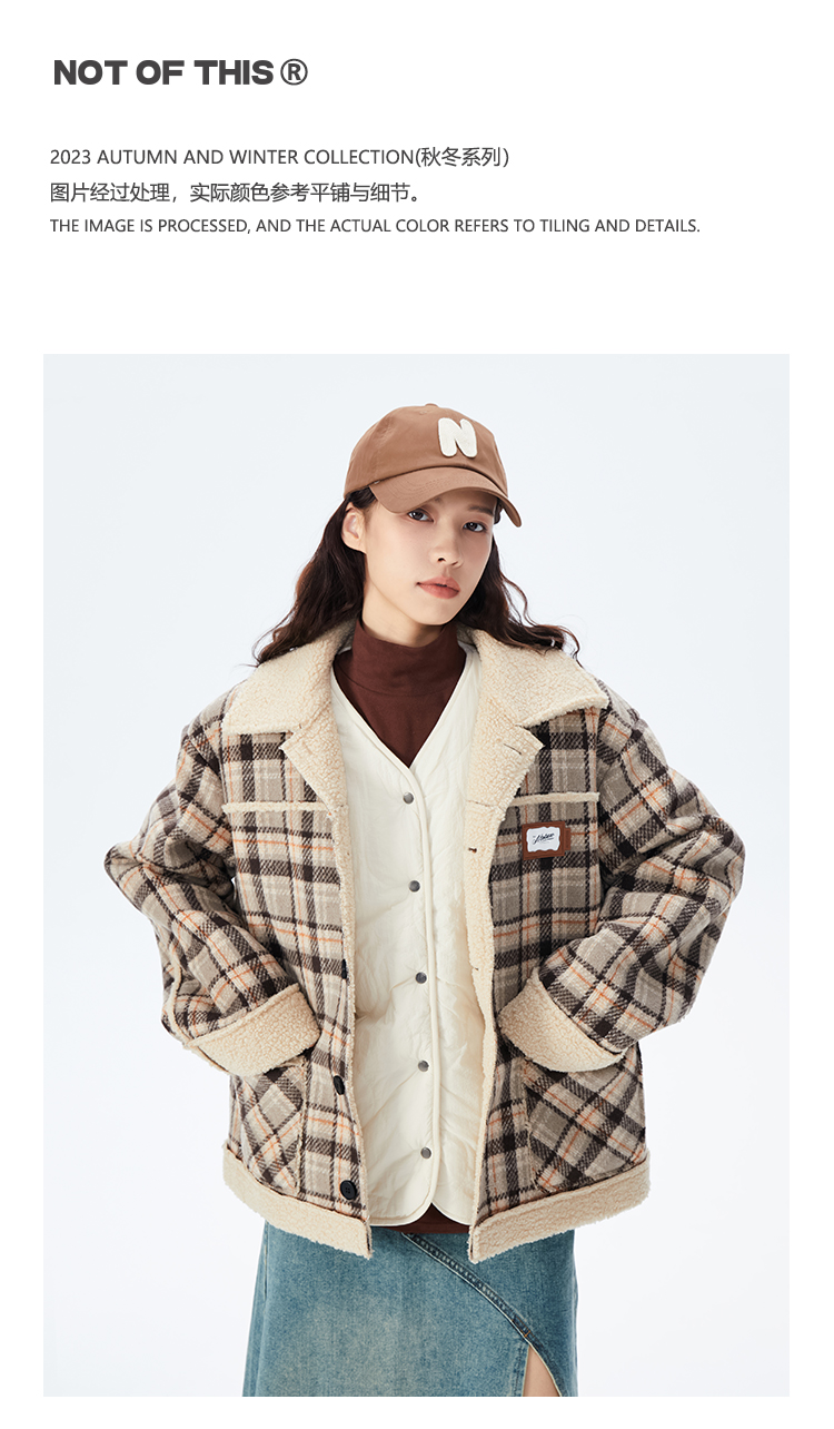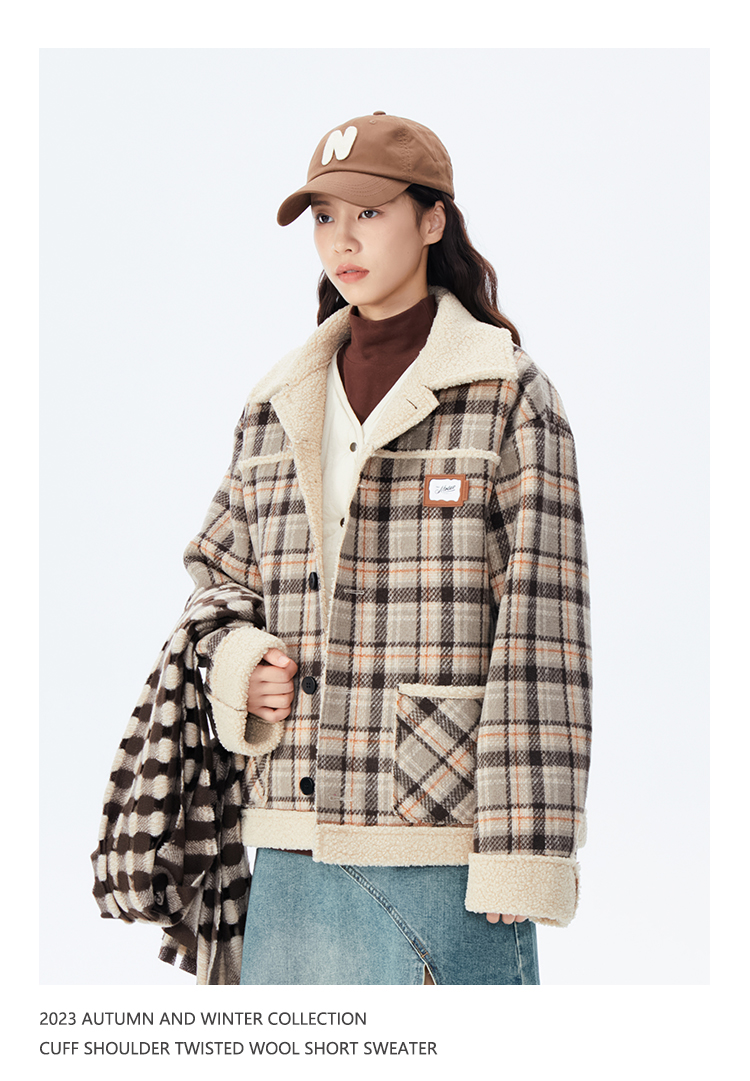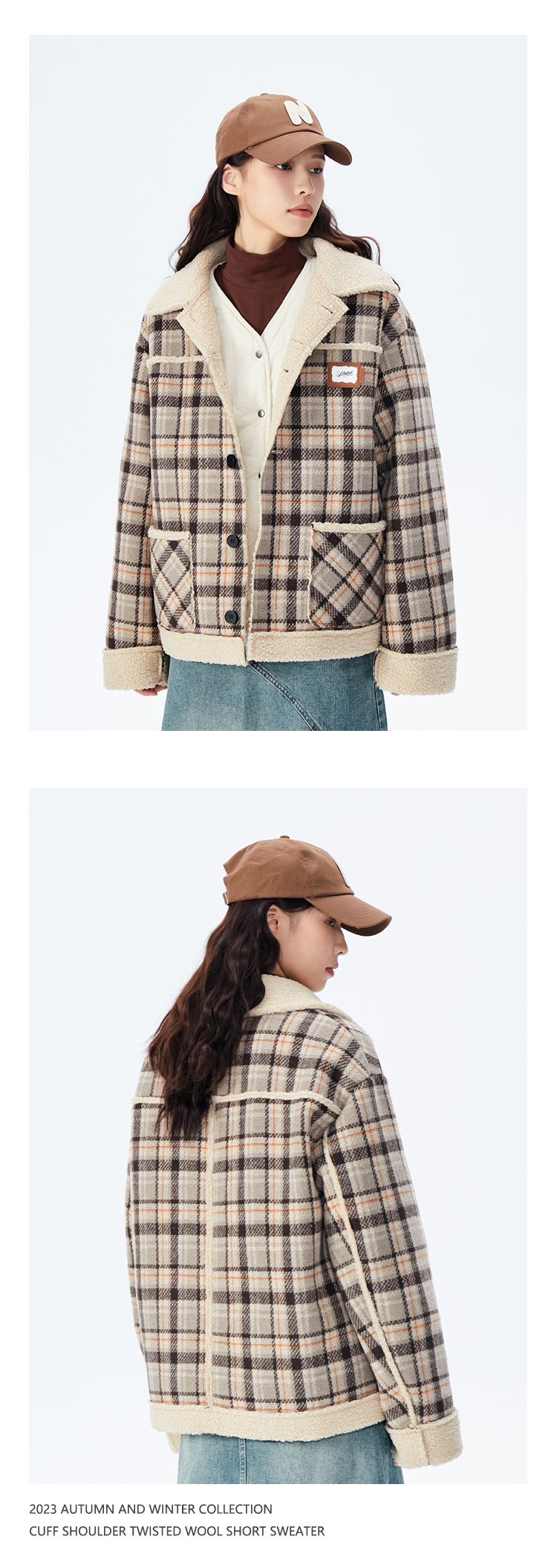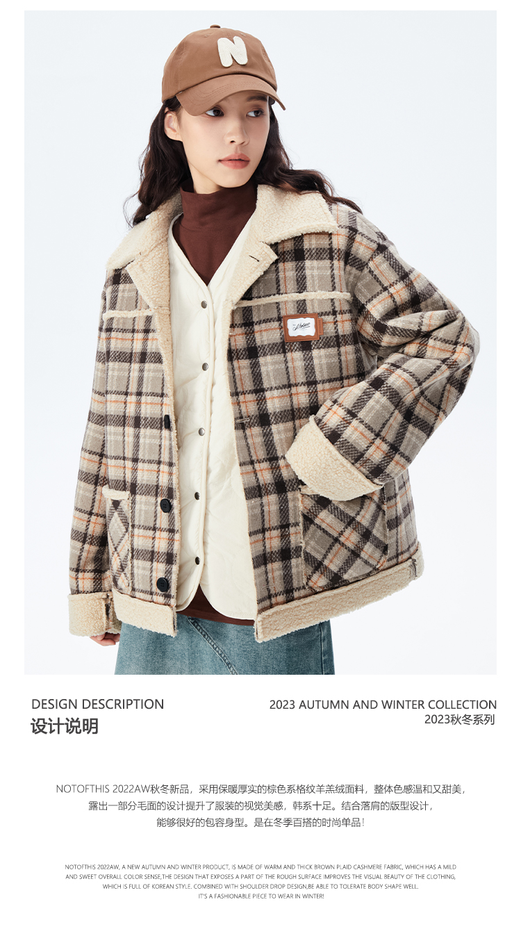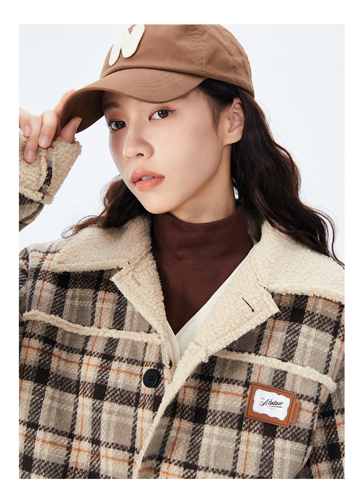 NTOT/NOTMF22276/棕色格纹羊羔毛翻领外套