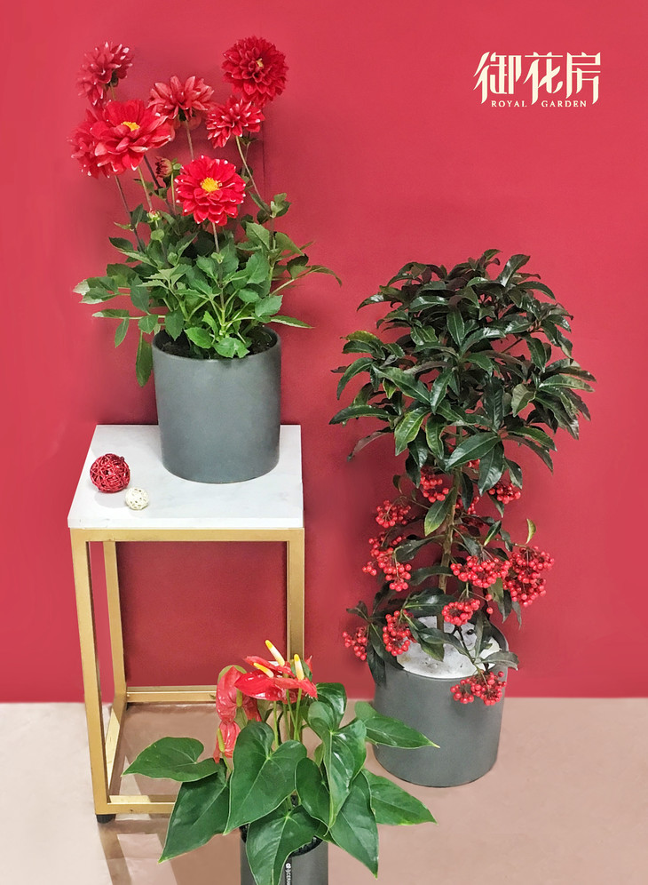 一本万利组合:大丽花1盆+红掌1盆+黄金万两果子