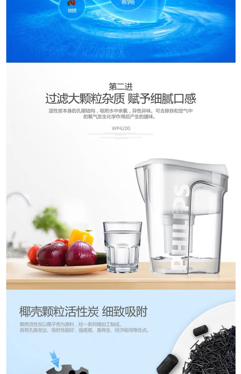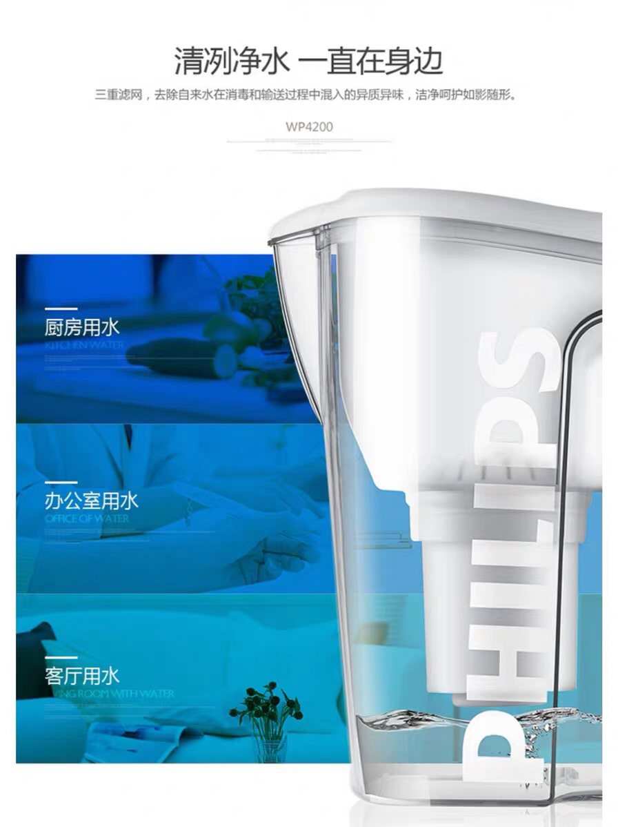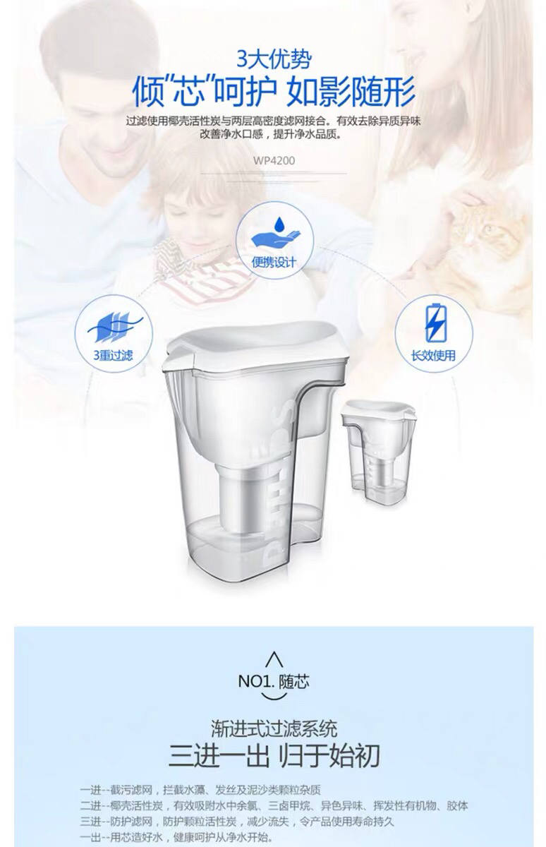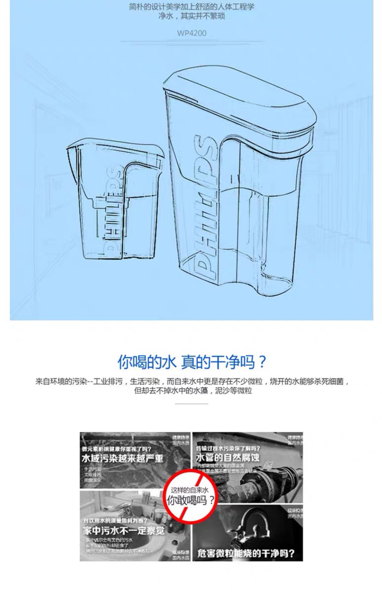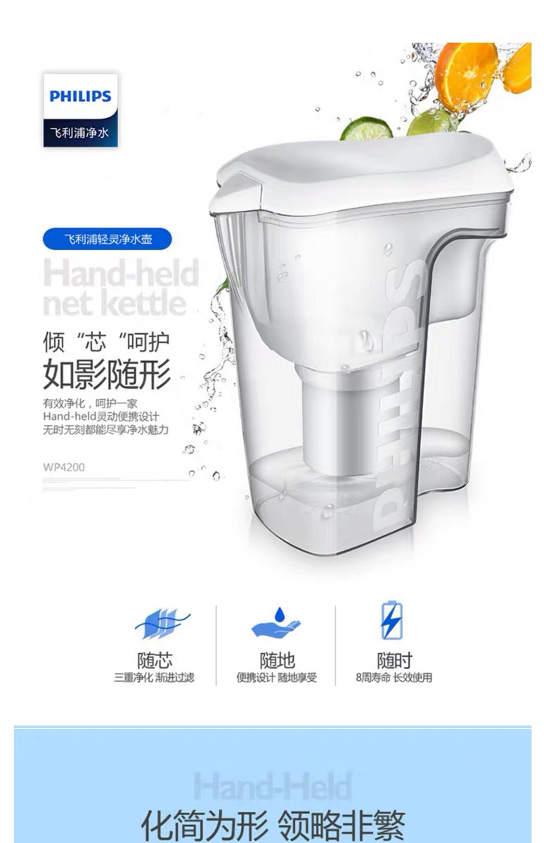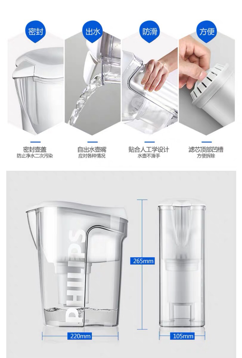 说明:1、夏天你要多喝水!家里自来水水质不达标,水壶烧水一层水垢,凉白开一股漂白粉味道,口感涩嘴。这个飞利浦直饮净水壶就太合适了。办公室,家里,宿舍必备随时随地喝纯净好水!