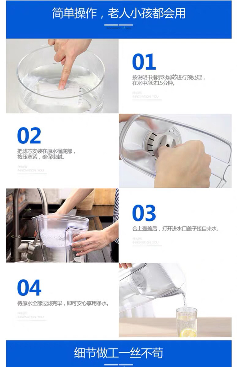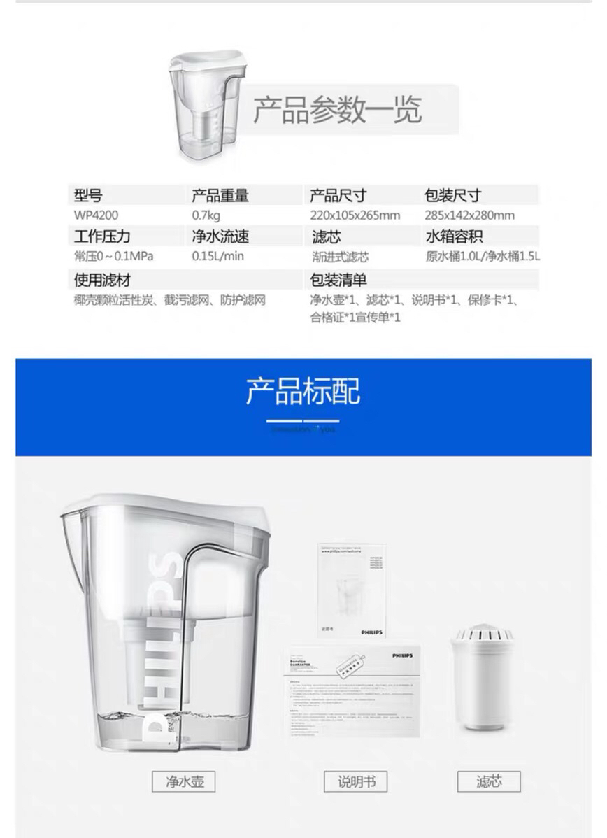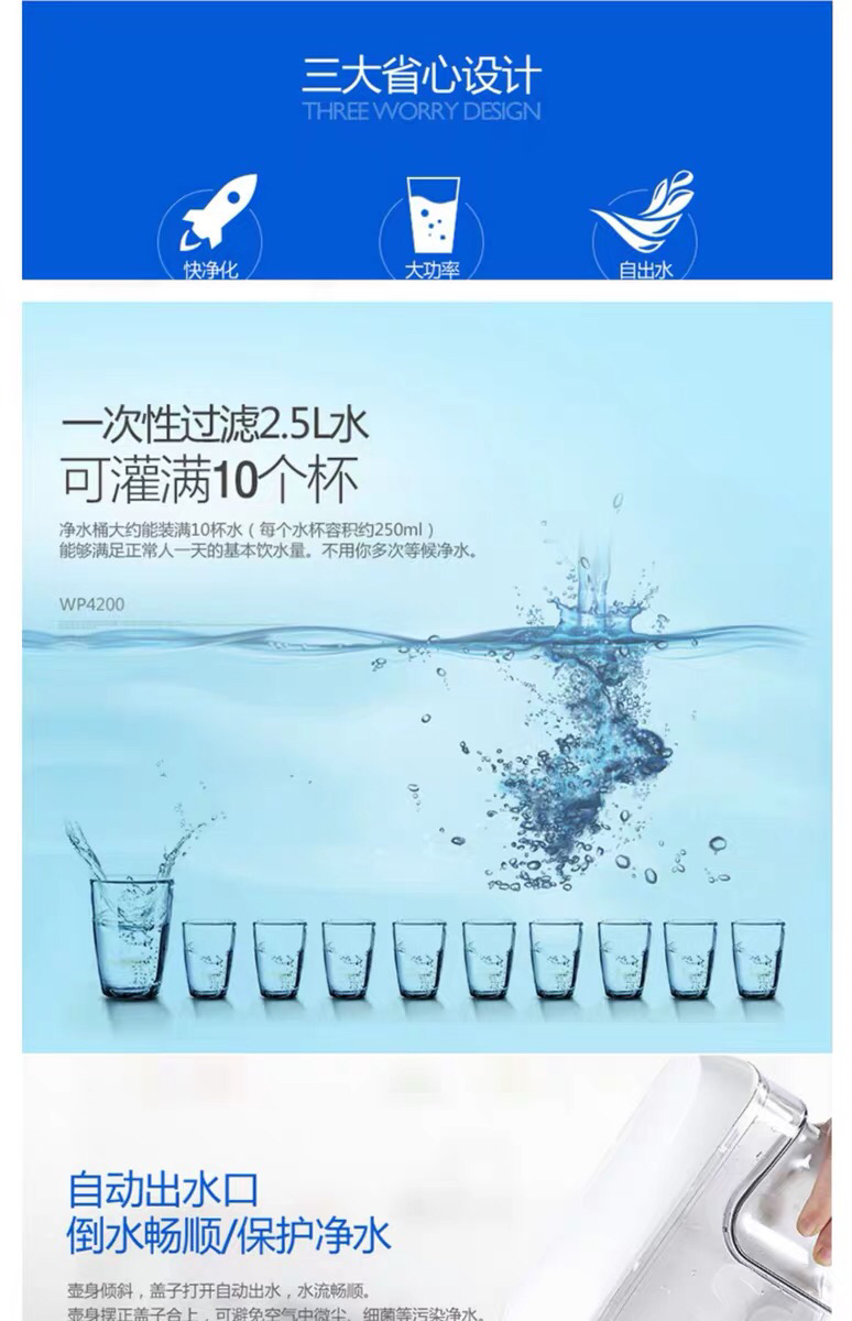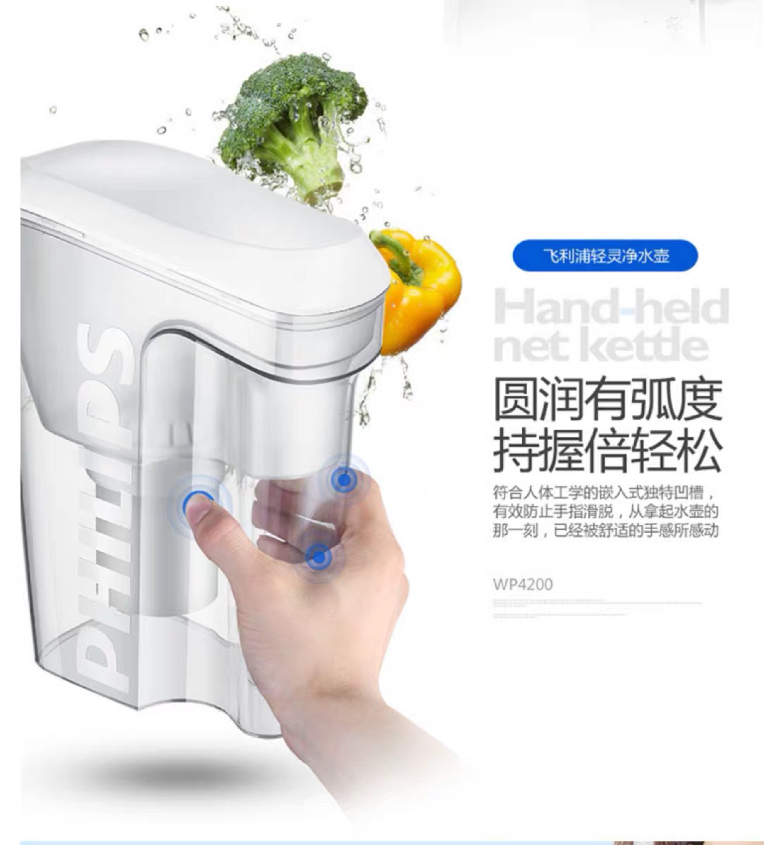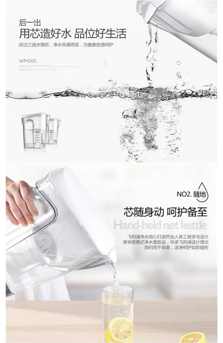 说明:1、夏天你要多喝水!家里自来水水质不达标,水壶烧水一层水垢,凉白开一股漂白粉味道,口感涩嘴。这个飞利浦直饮净水壶就太合适了。办公室,家里,宿舍必备随时随地喝纯净好水!