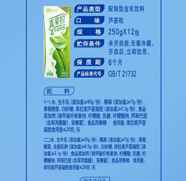 蒙牛真果粒芦荟果粒牛奶饮品250g *12/箱