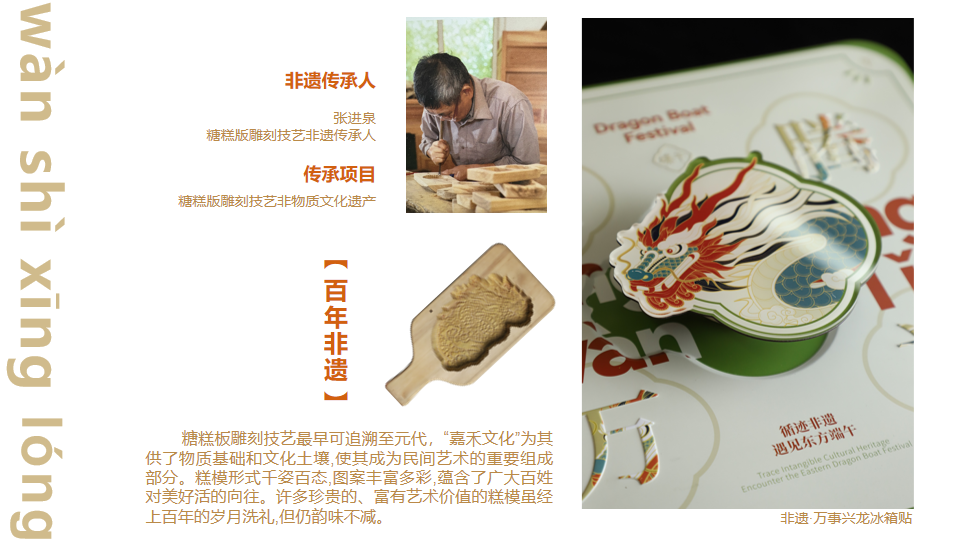 把非遗糖糕板的经典画面-万事新龙,以现代形式冰箱贴呈现,将手艺的温度与现代生活方式结合,在端午节也是一份吉祥有纪念的好寓意。