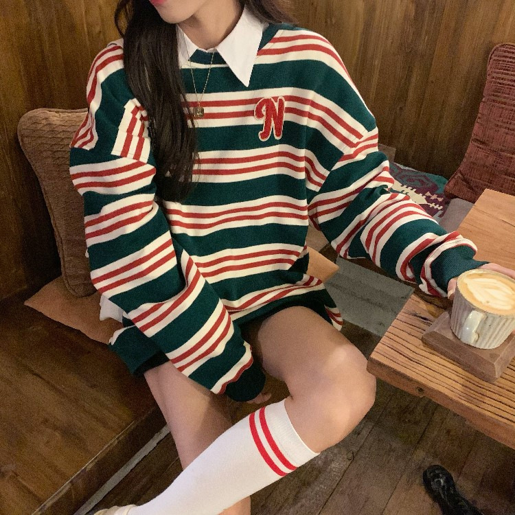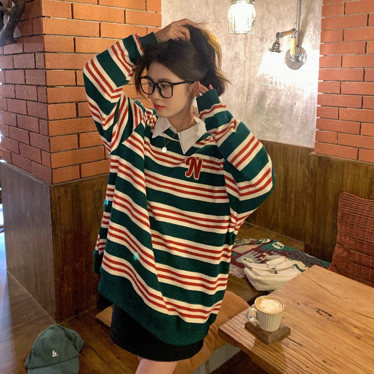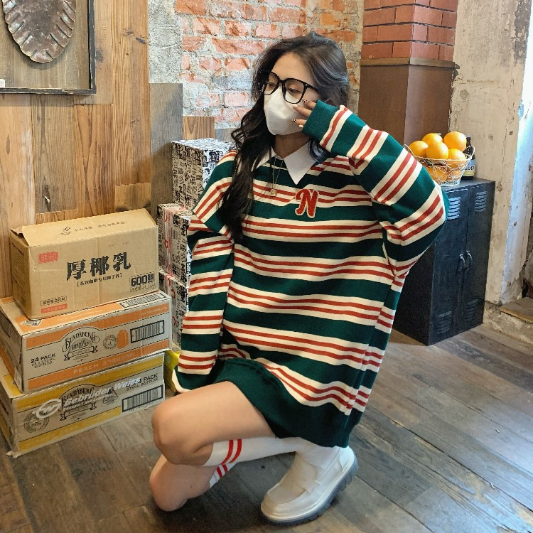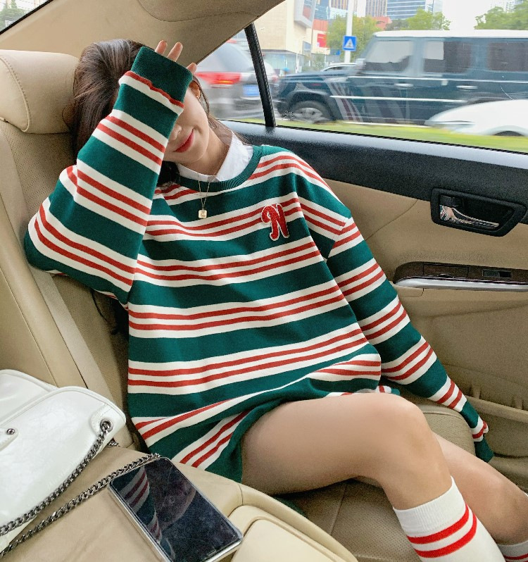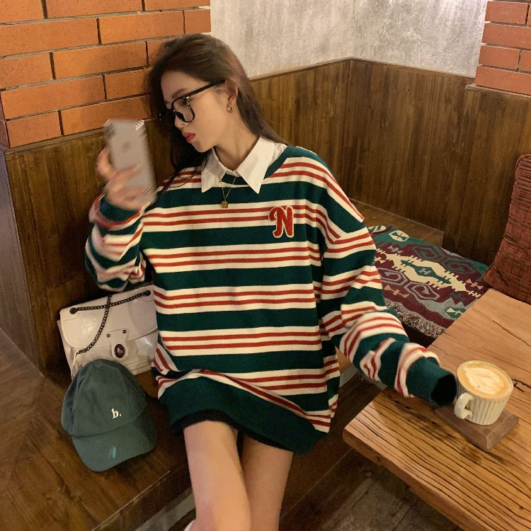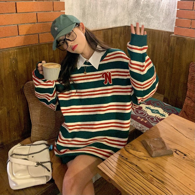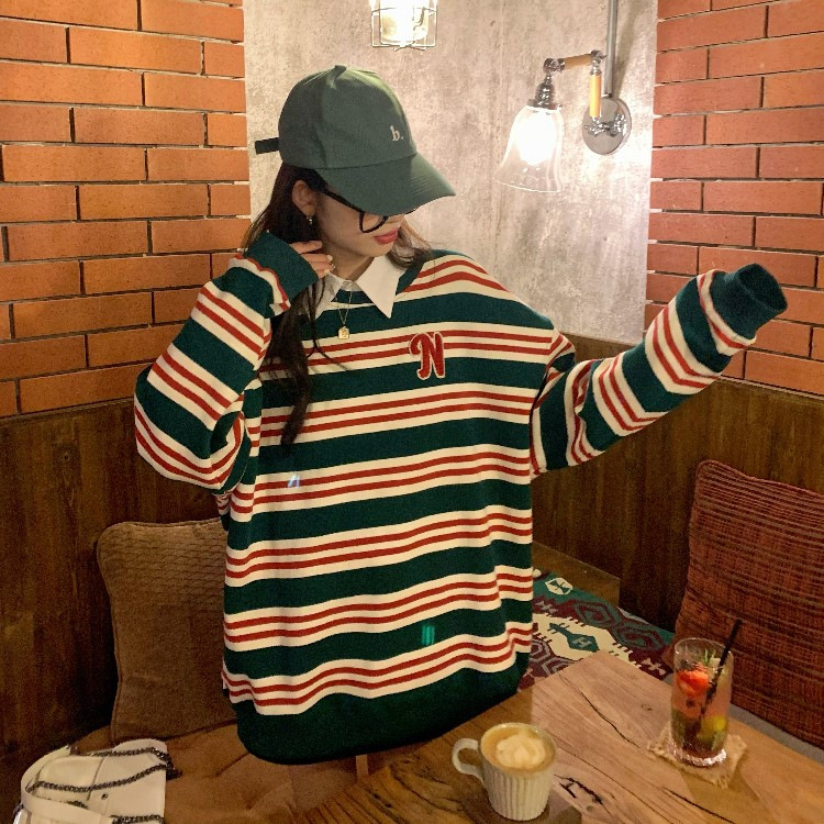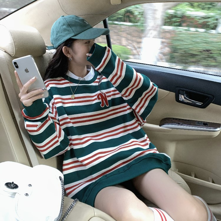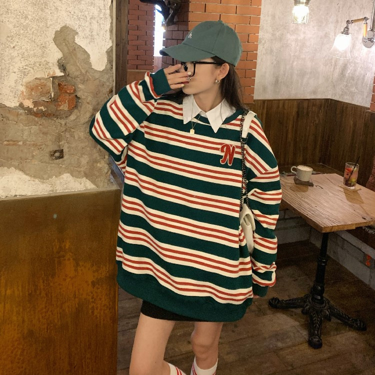 【春秋条纹卫衣】宽松潮ins 慵懒风bf薄款港风chic外套 条纹元素增添时尚感
