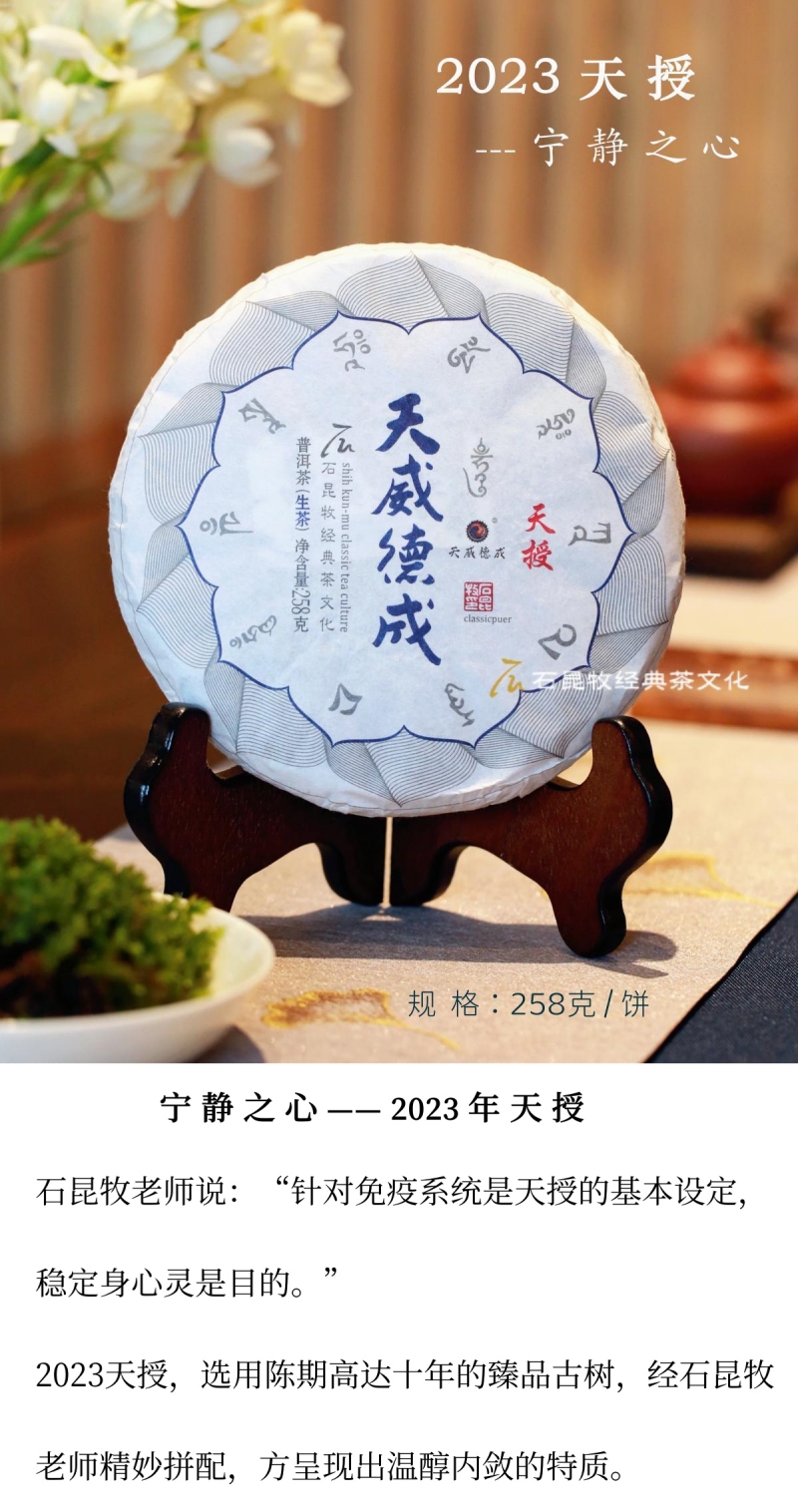 - 石昆牧老师于2007年创立经典普洱体系,天威德成品牌主要经营石昆牧老师历年定制普洱茶以及收藏茶品。