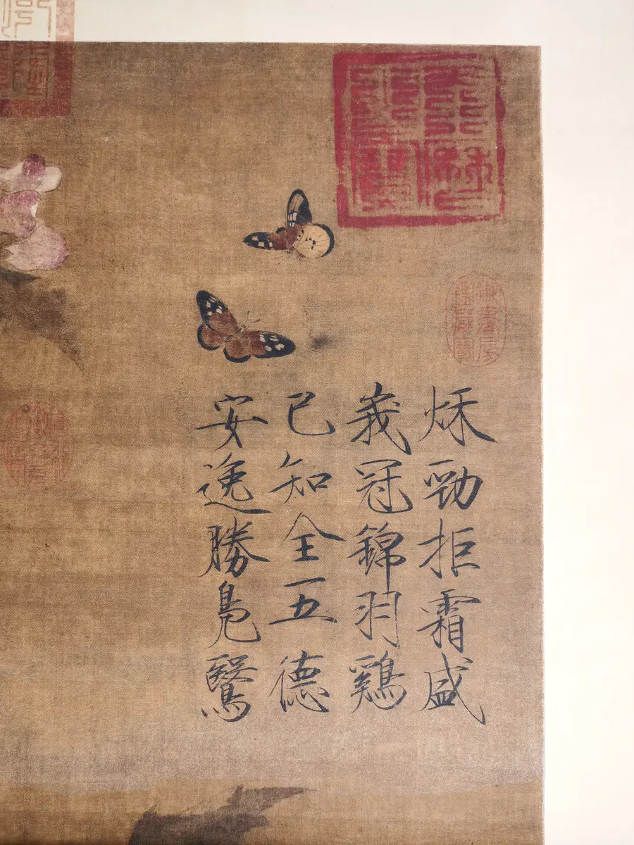 《芙蓉锦鸡图》是北宋徽宗赵佶创作的绢本双勾重彩工笔花鸟画,现收藏于北京故宫博物院。《芙蓉锦鸡图》绘有芙蓉、锦鸡、蝴蝶、菊花,画中一枝芙蓉从左侧伸出,花枝上栖一只锦鸡,右上角两只彩蝶追逐嬉戏,左下角一丛秋菊迎风而舞。整幅画层次分明,疏密相间,充满秋色中盎然的生机,表现出平和愉悦的境界。