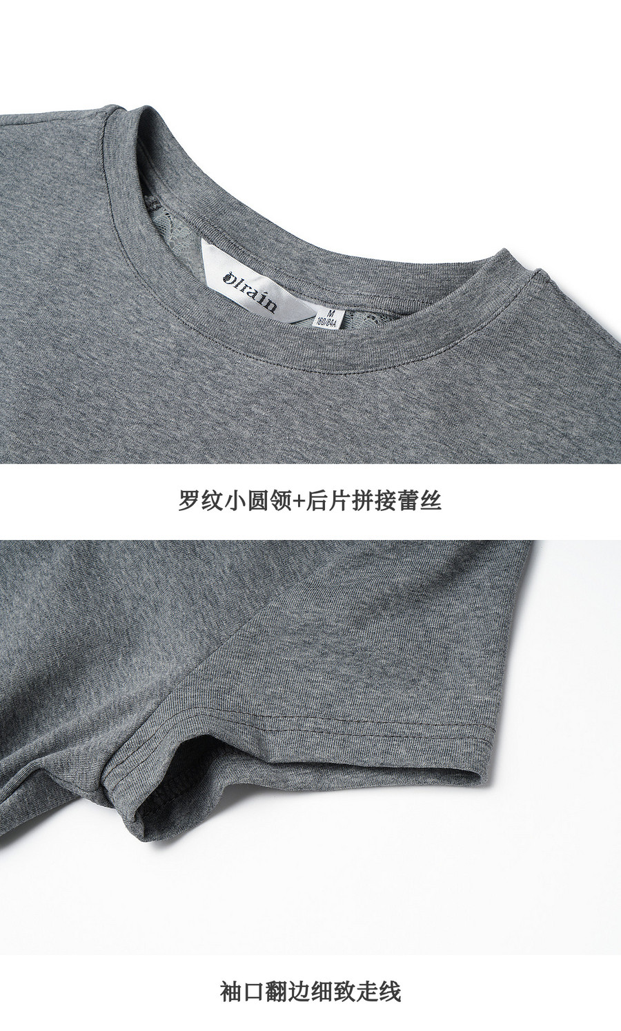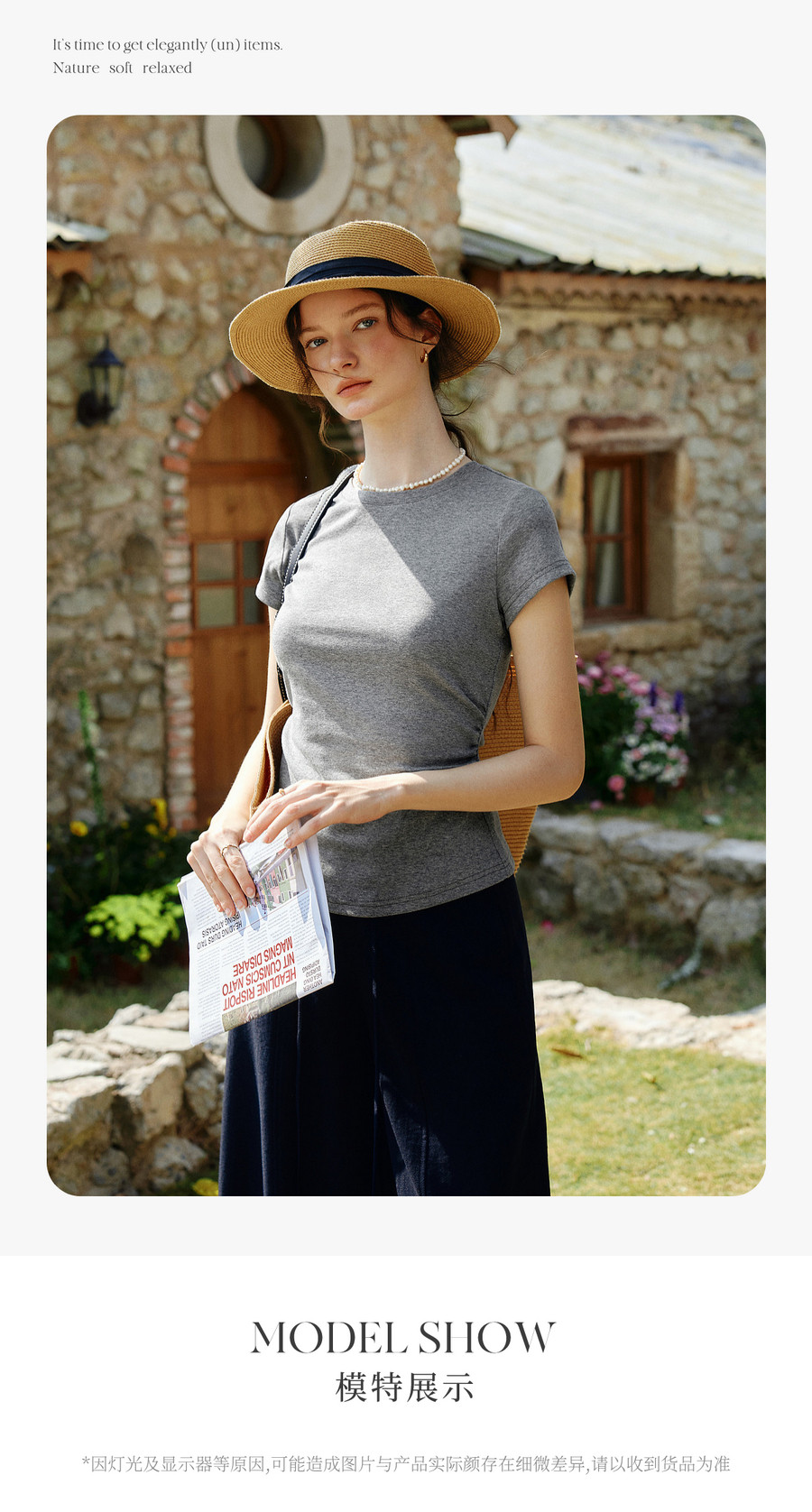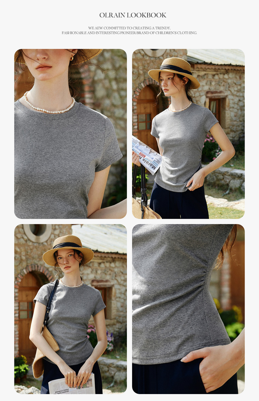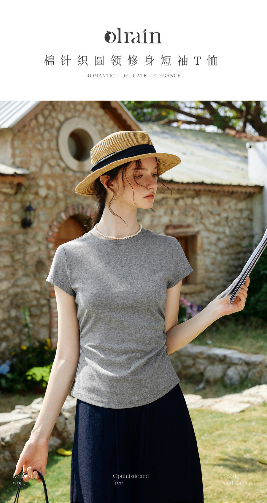 欧芮儿2026年新款夏季收腰设计修身灰色圆领休闲风棉针织短袖T恤
