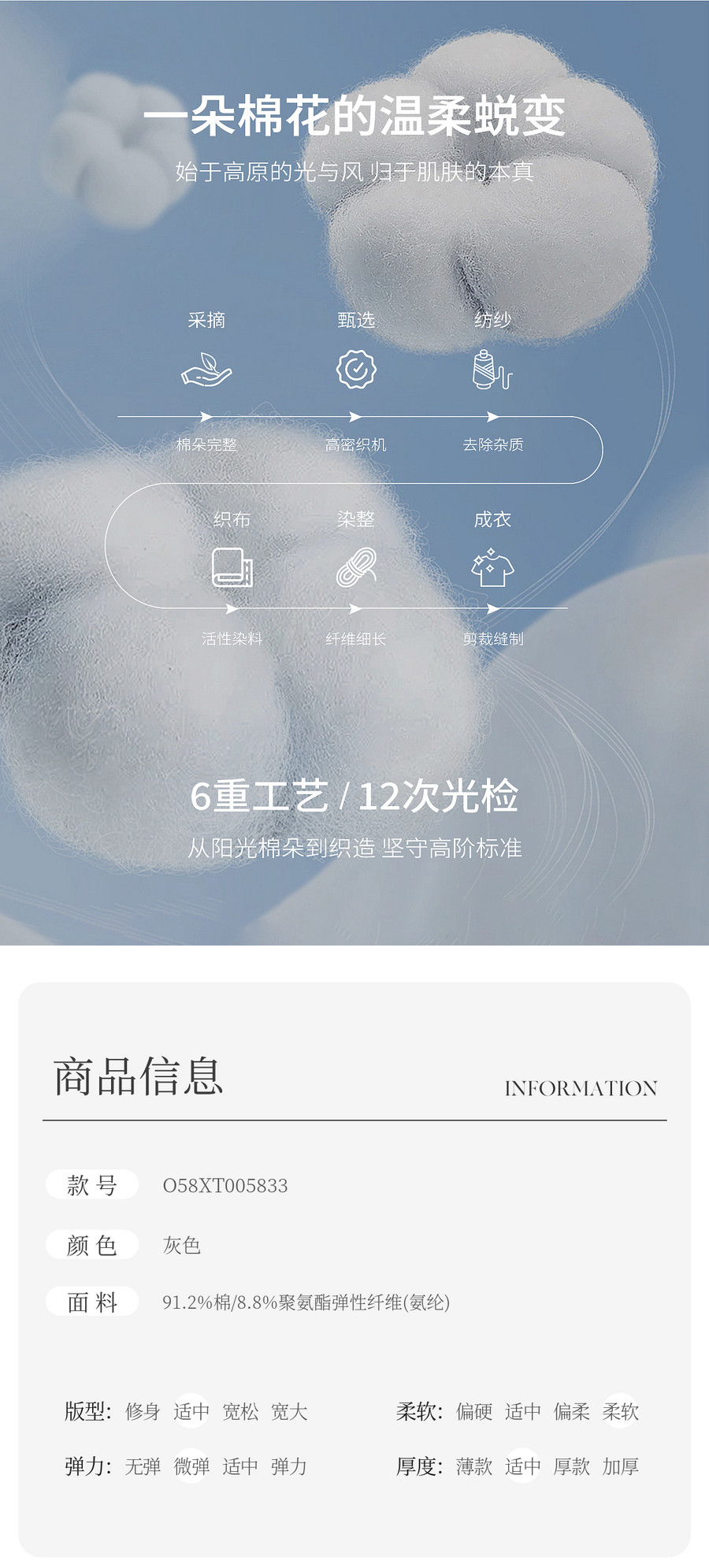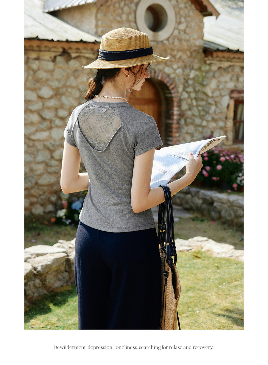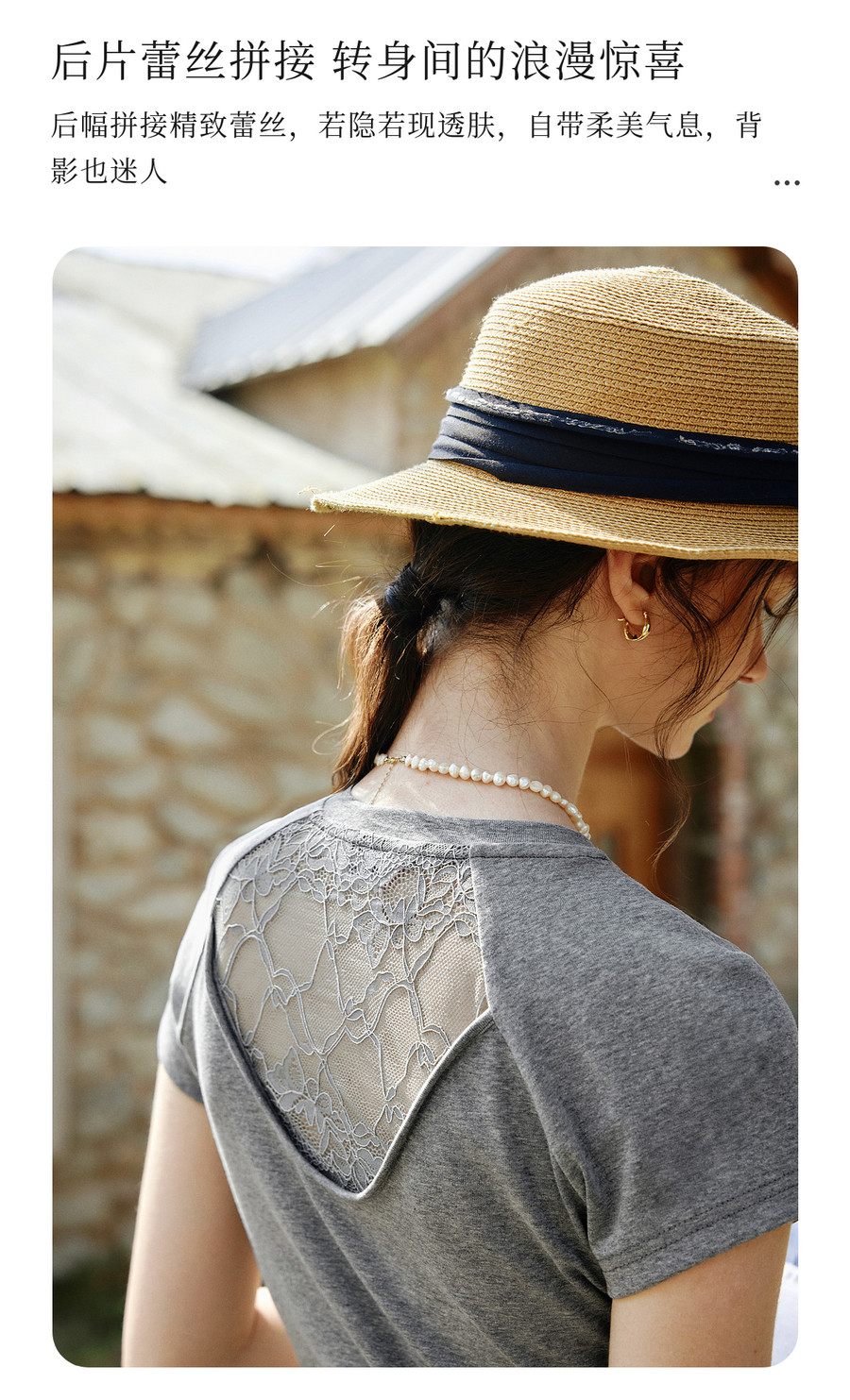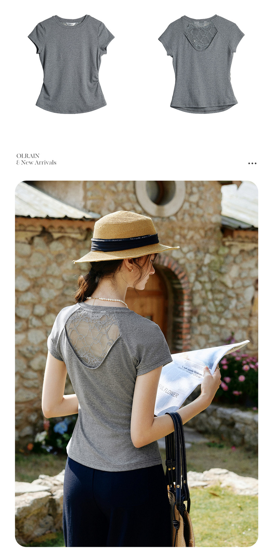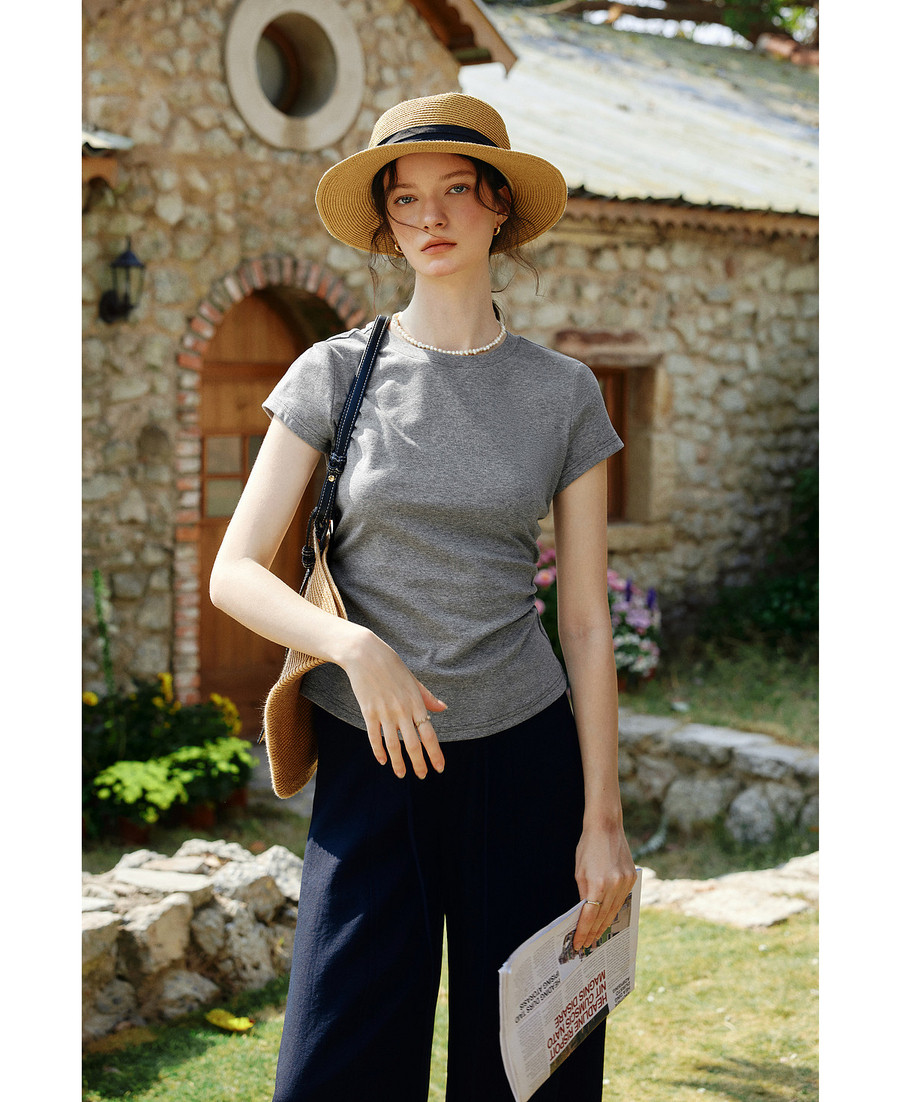 欧芮儿2026年新款夏季收腰设计修身灰色圆领休闲风棉针织短袖T恤