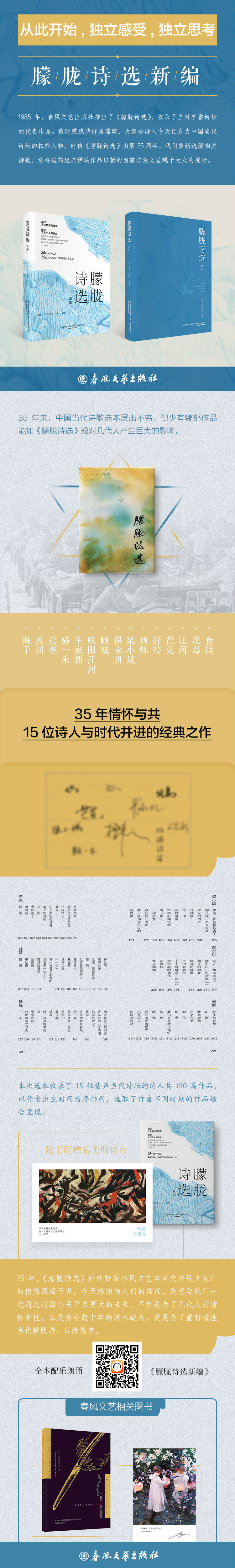 35年来,中国当代诗歌选本层出不穷,但少有哪部作品能如《朦胧诗选》般对几代人产生巨大的影响。35年,春风文艺与当代诗歌大家们的情缘深藏于世。今天感谢诗人们的信任,愿意与我们一起通过这部小书开启更大的大未来,不仅是为了几代人的情怀牵挂,以及弥补数十年的版本缺失,更是为了重新梳理当代朦胧诗,以飨读者。