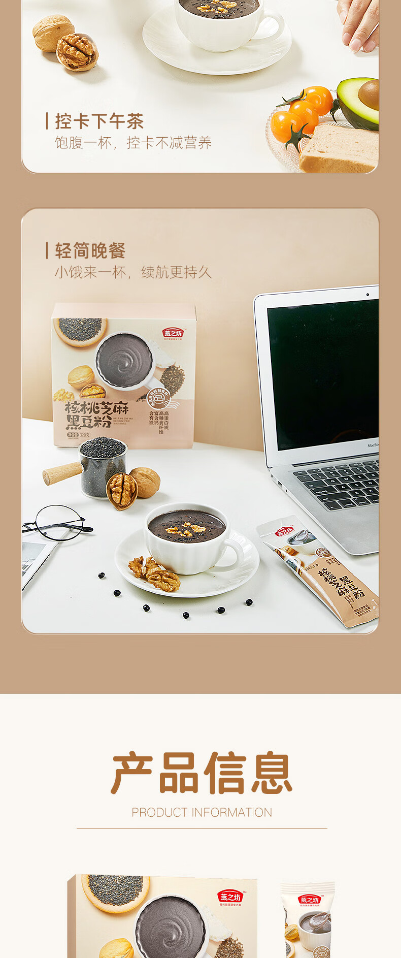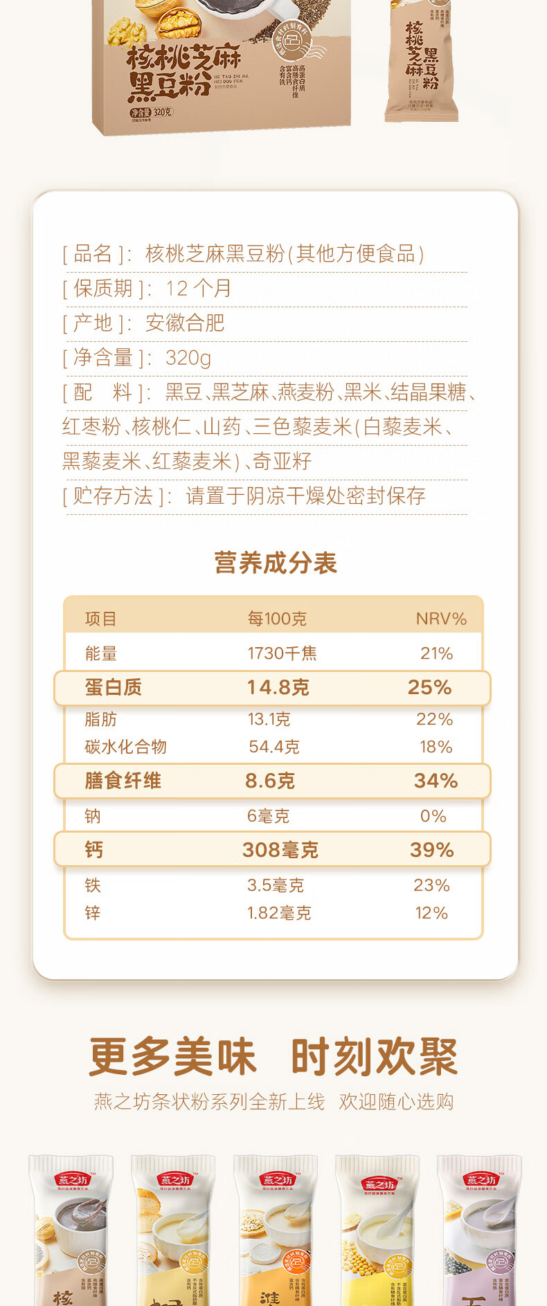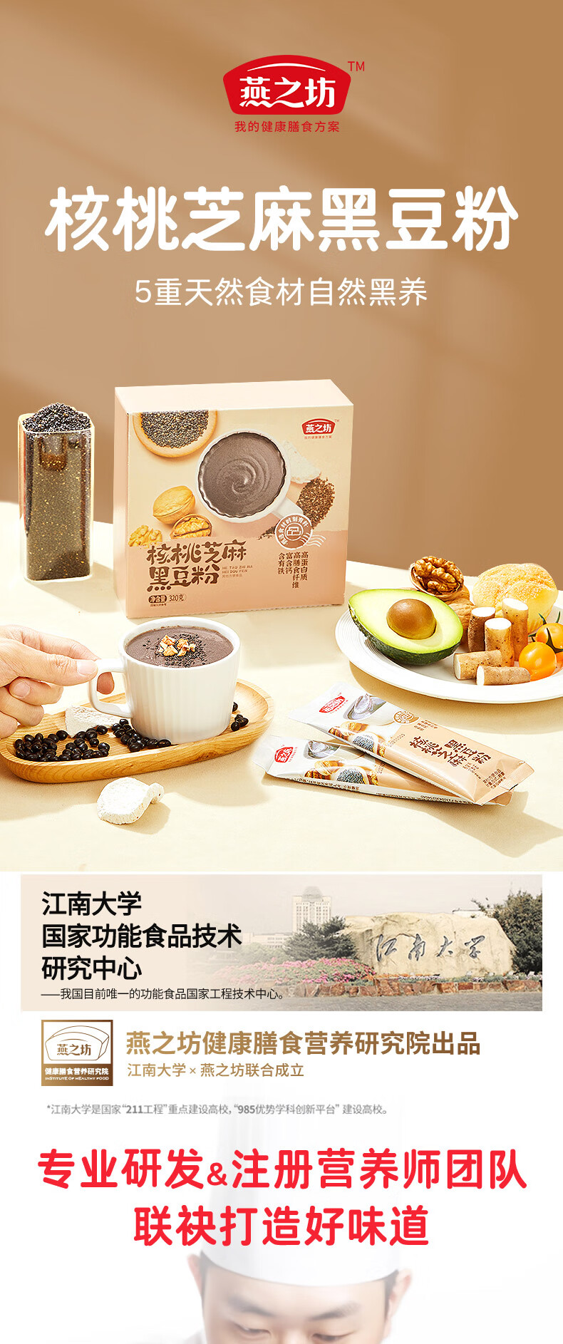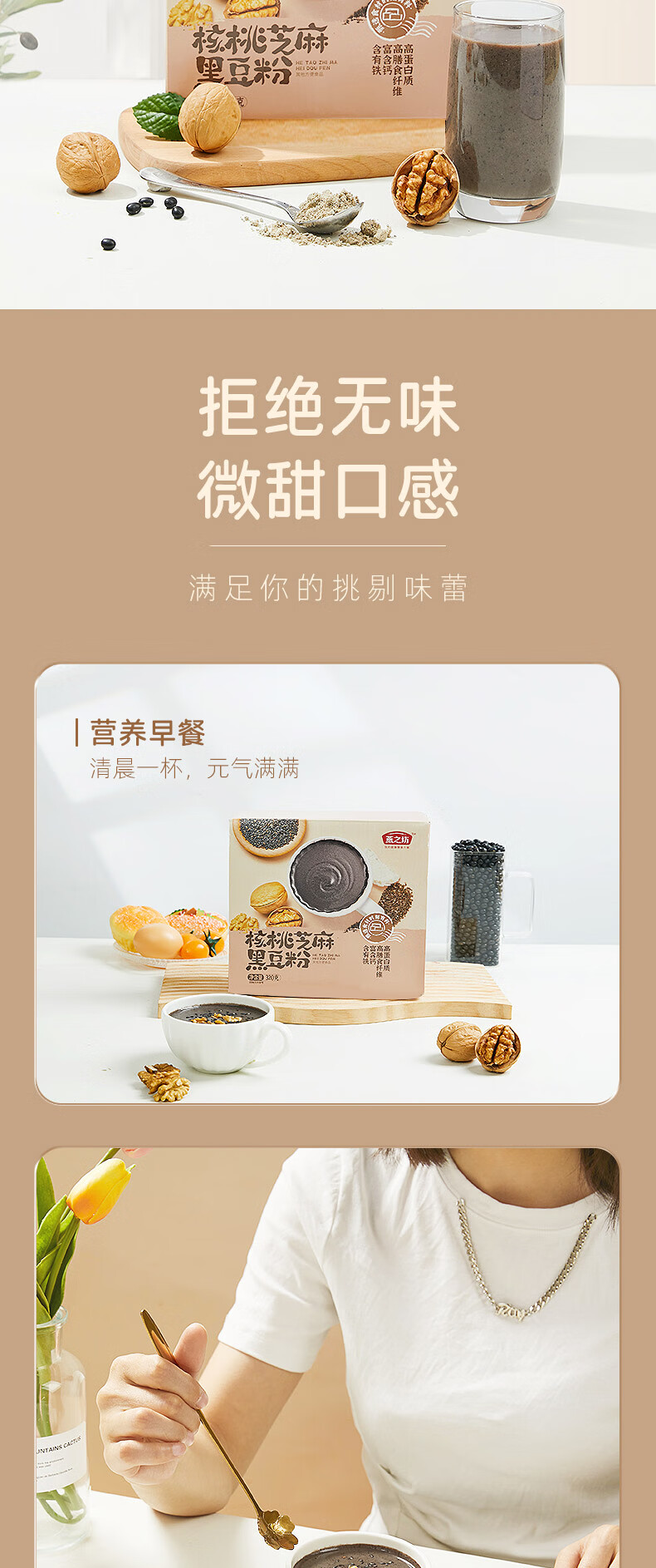 燕之坊 核桃芝麻黑豆粉 豆浆粉 粗粮粉 营养早餐 冲饮代餐即食粉 饱腹 盒装 320g 1盒