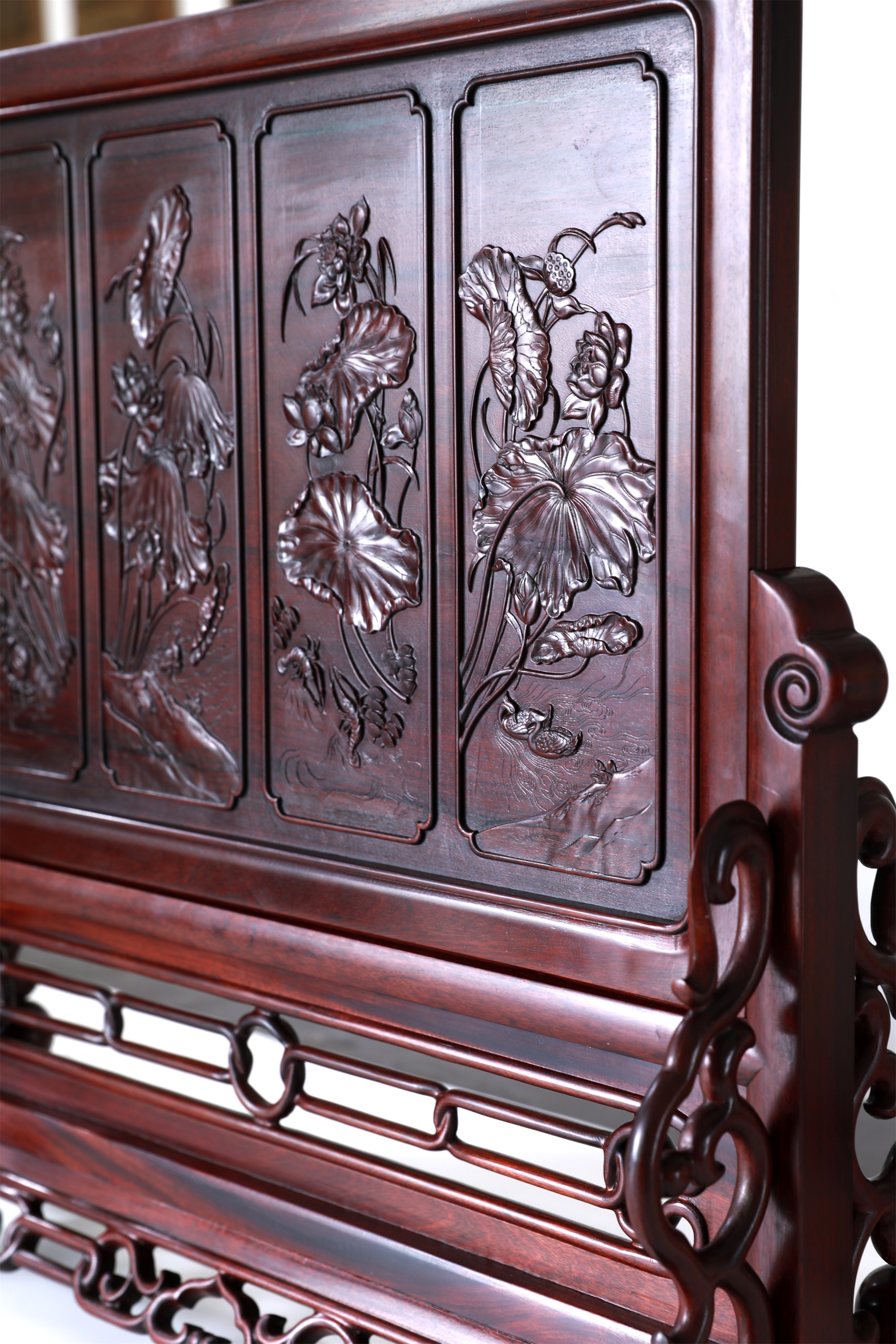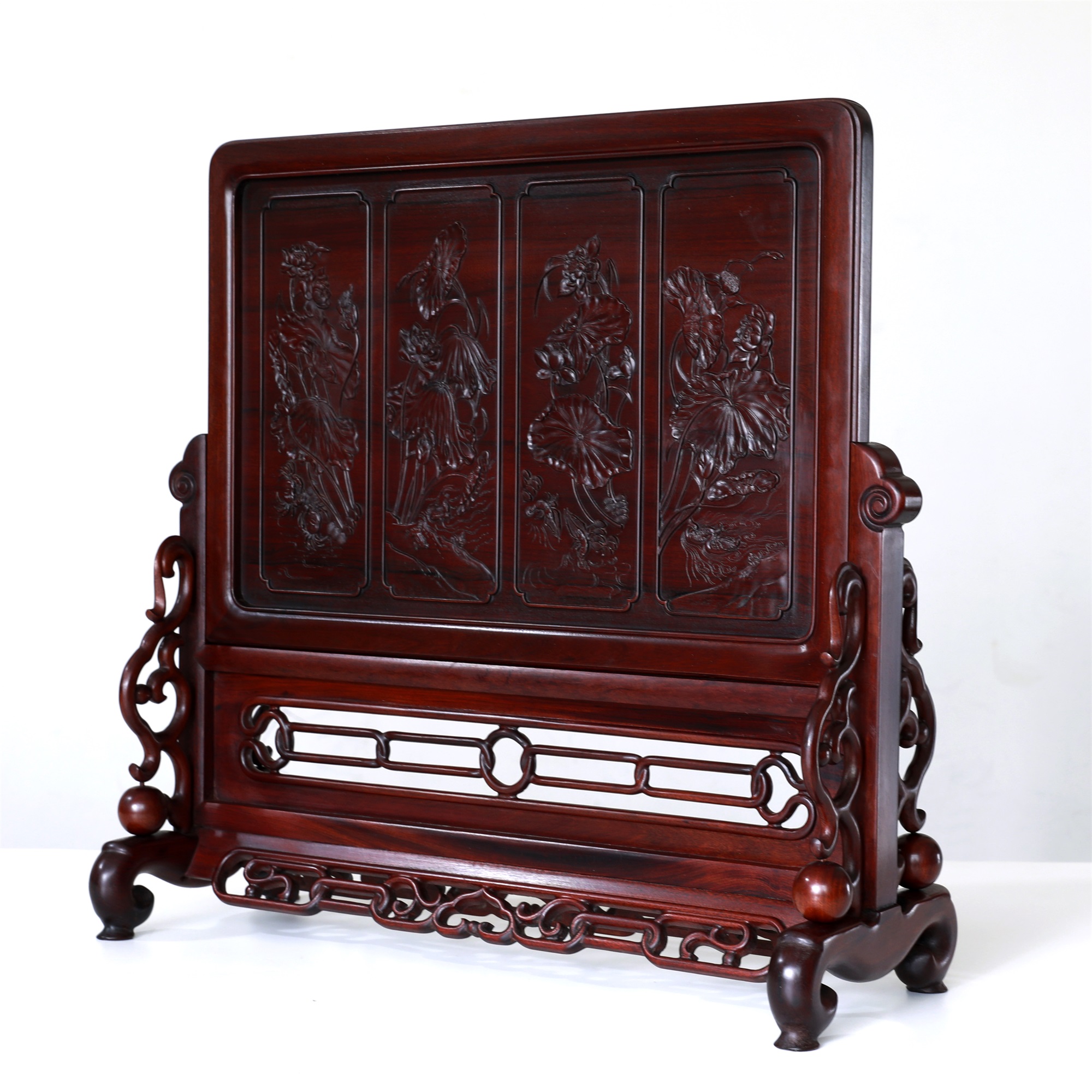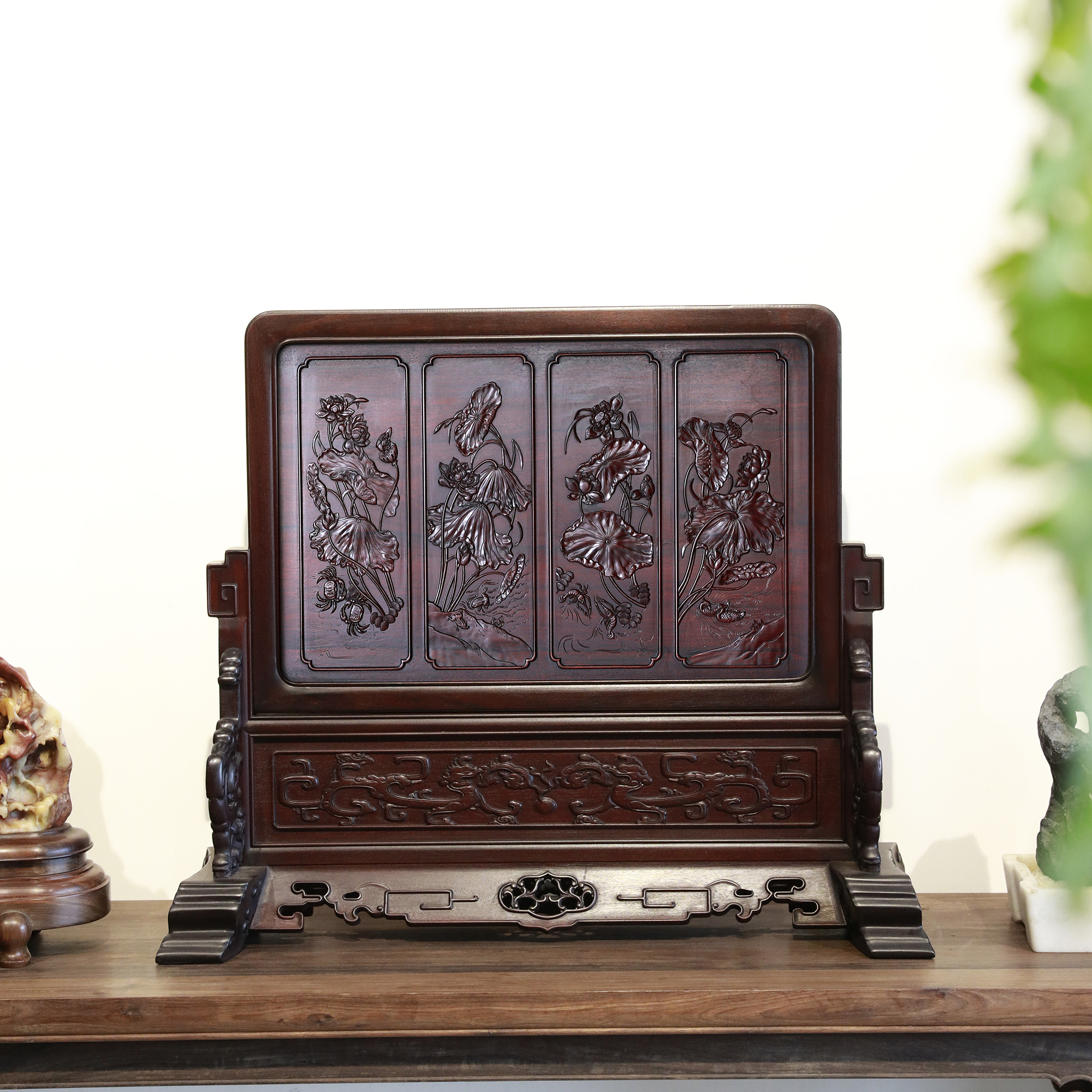 作品精选胡氏宗祠隔门上的和谐、和鸣、和顺、和美图案组合,将其微缩于珍贵木材酸枝之上,使得徽州龙川木雕艺术得以走入寻常百姓之家。