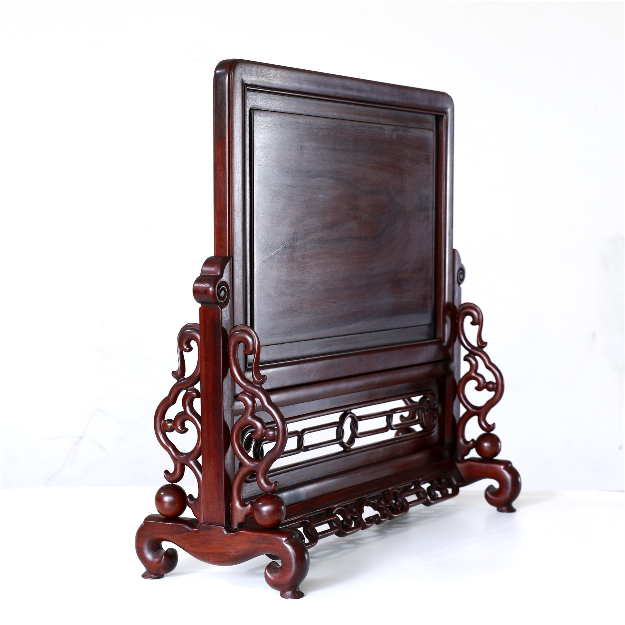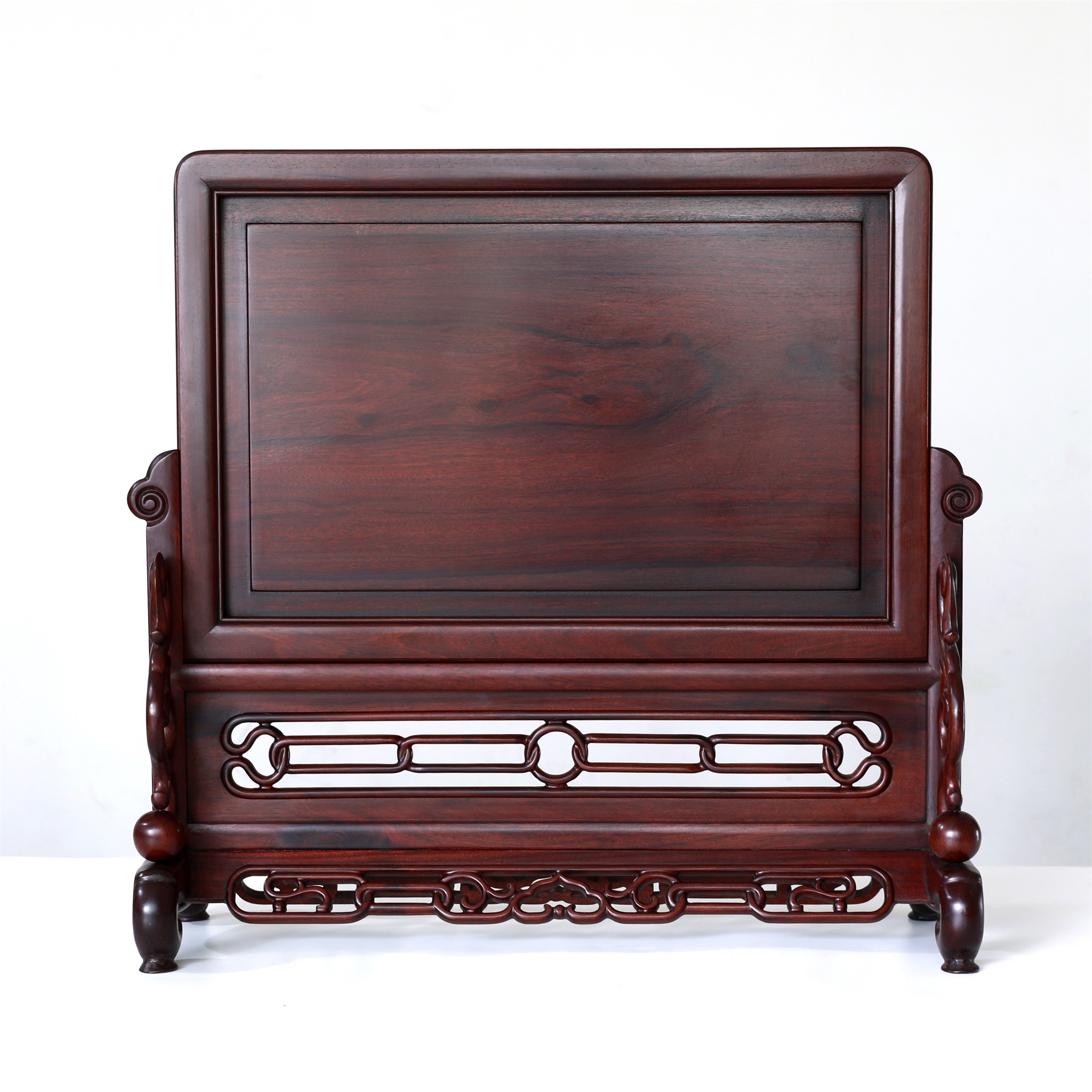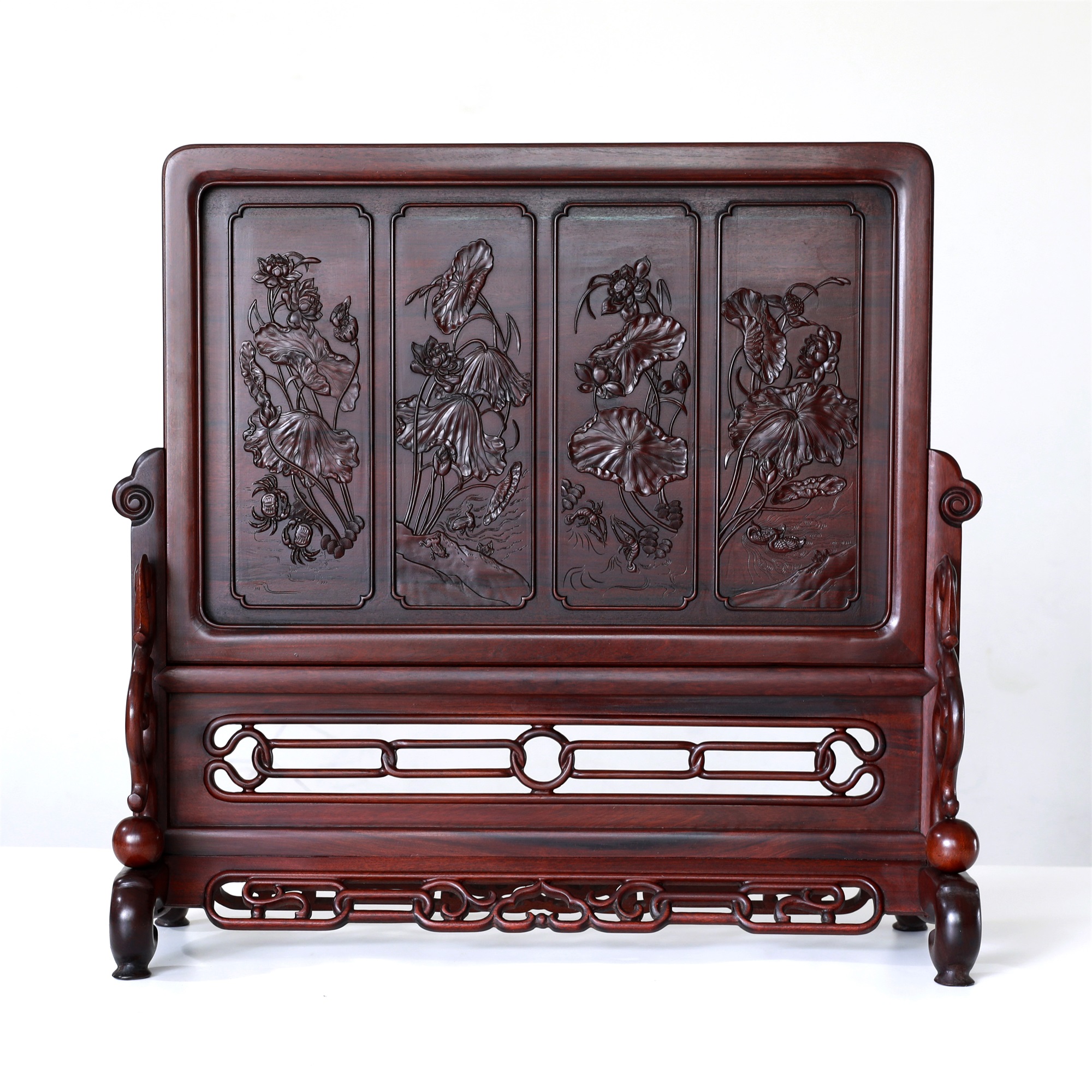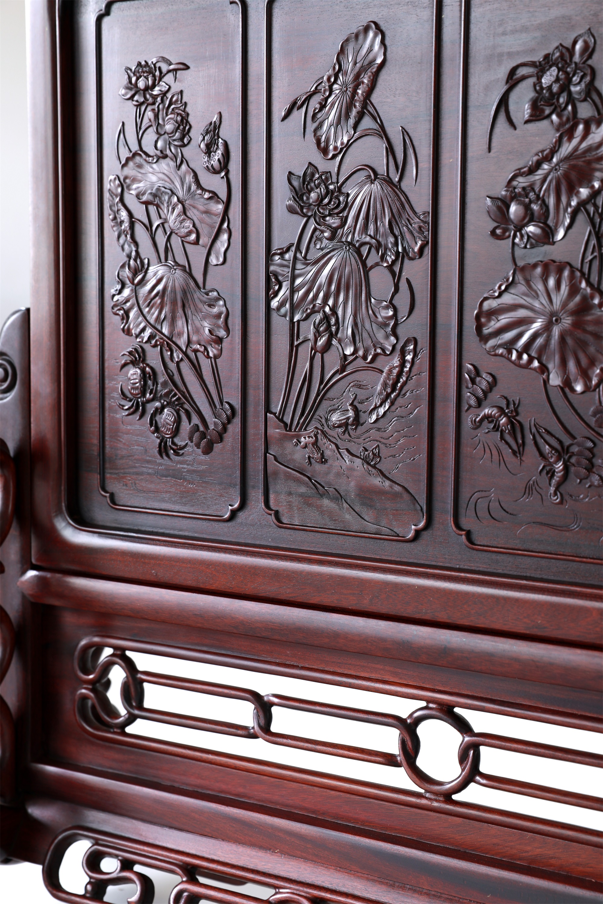 作品精选胡氏宗祠隔门上的和谐、和鸣、和顺、和美图案组合,将其微缩于珍贵木材酸枝之上,使得徽州龙川木雕艺术得以走入寻常百姓之家。
