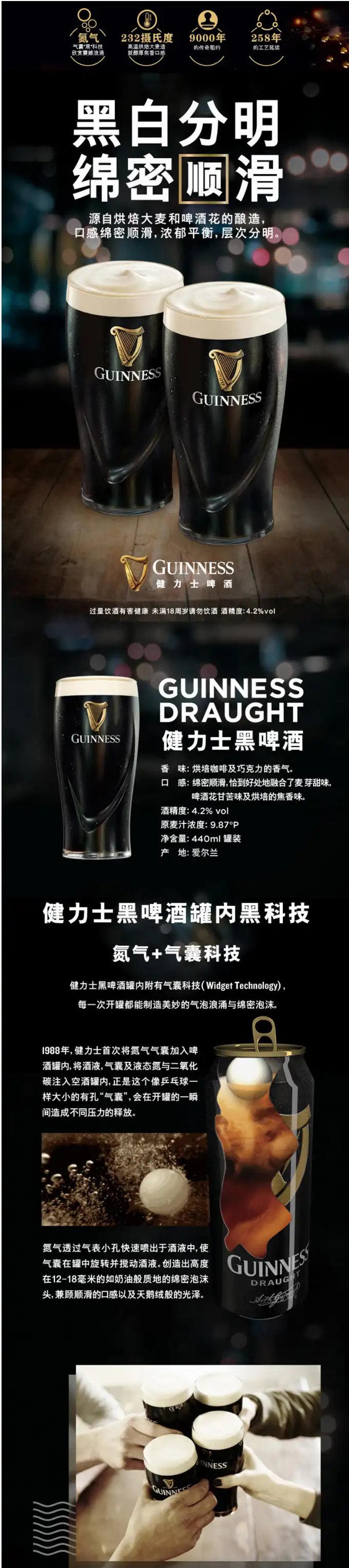 健力士Guinness 进口9.9°P黑啤酒 440ml*24听/箱