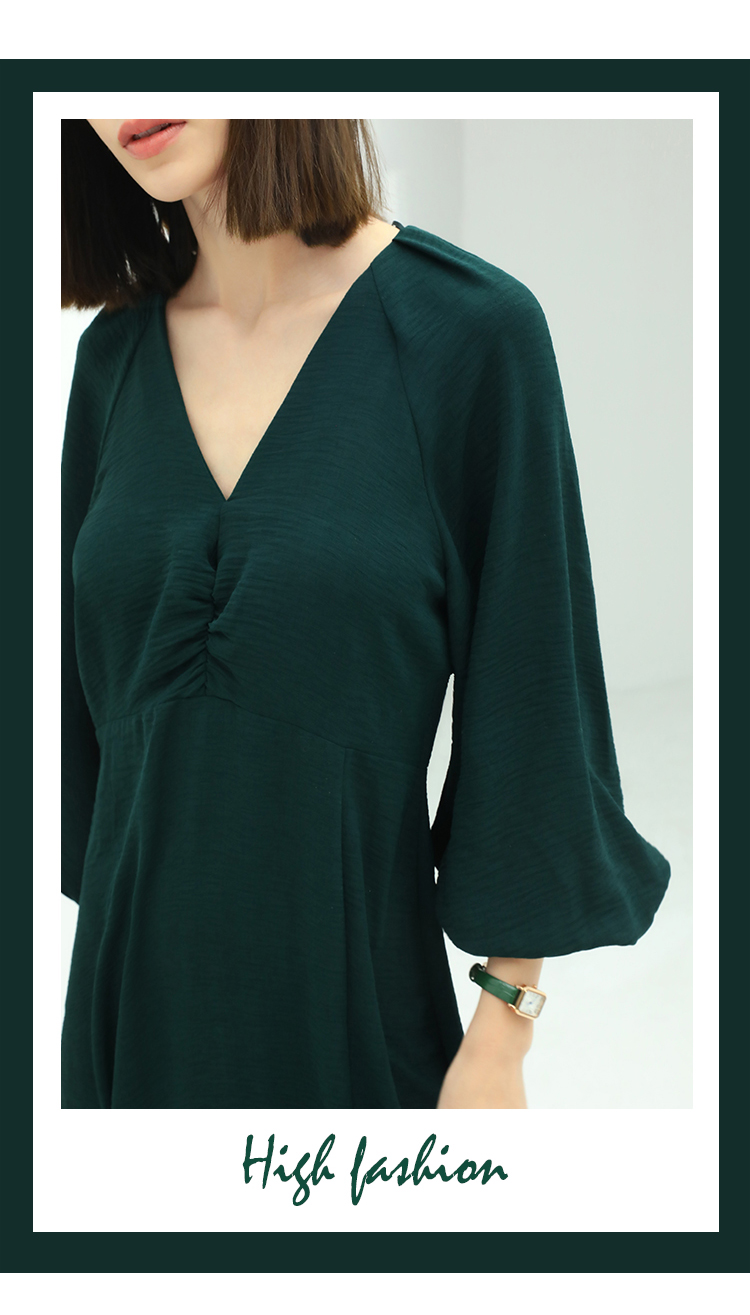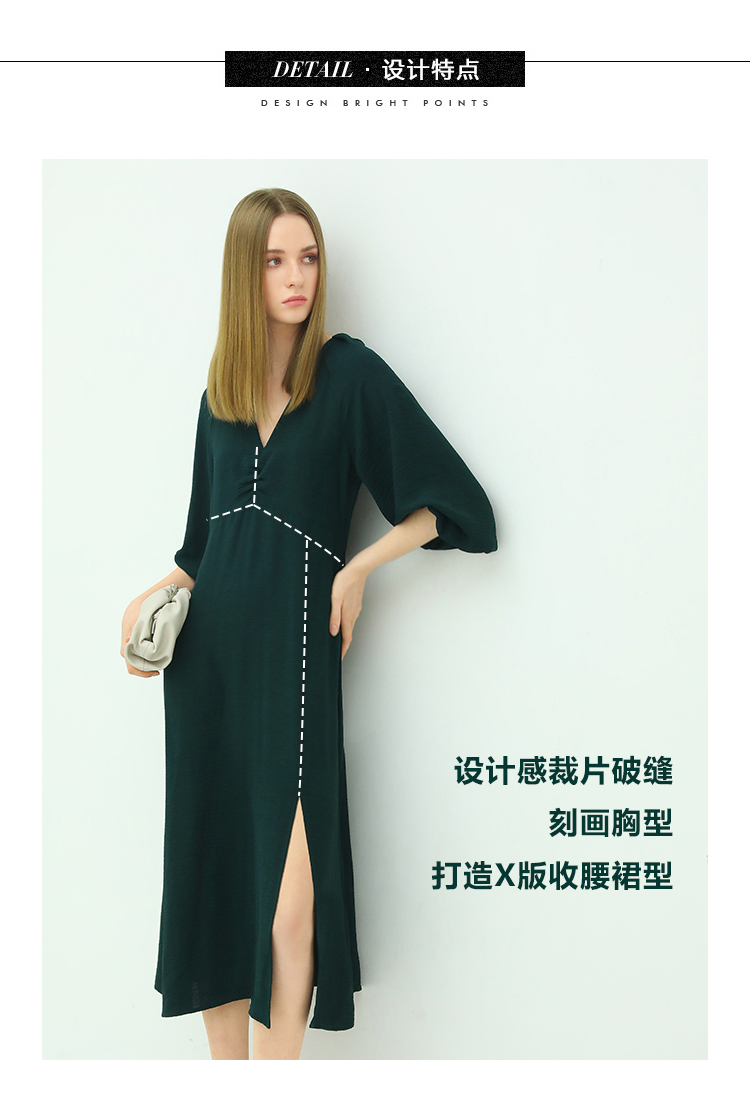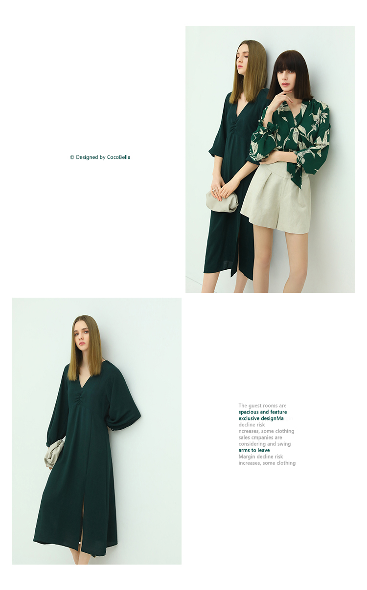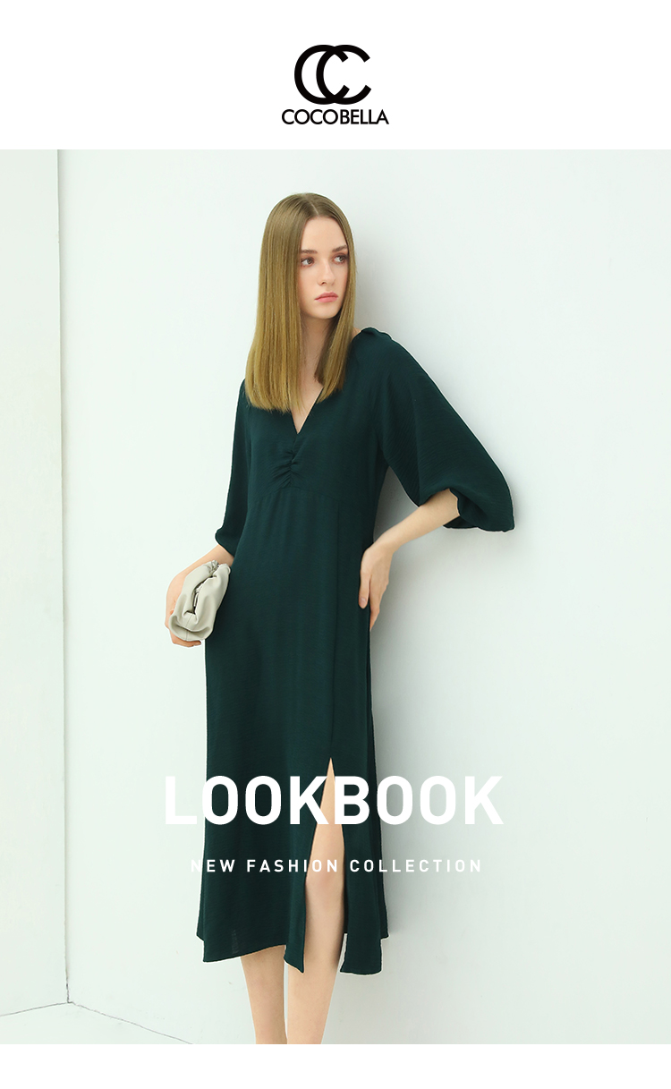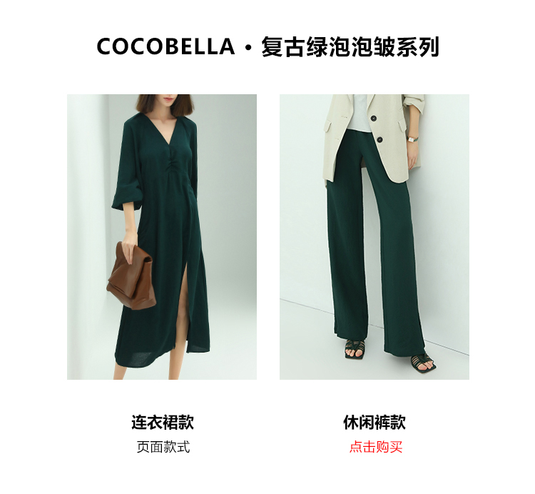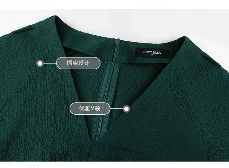 COCOBELLA肌理质感绿色V领连衣裙优雅女人味OL大摆长裙FR109