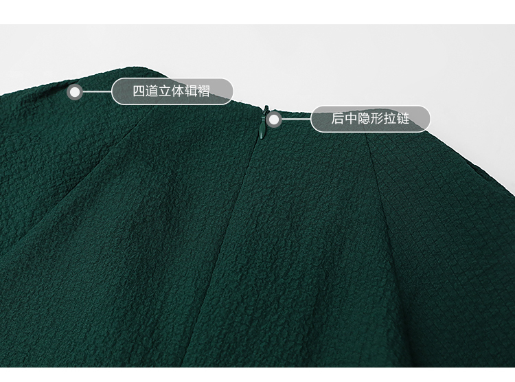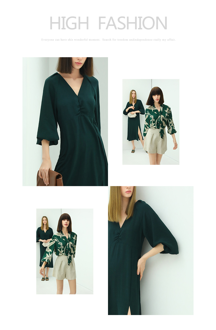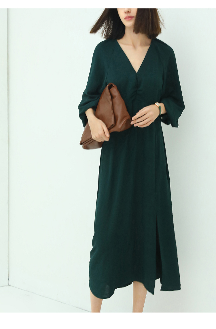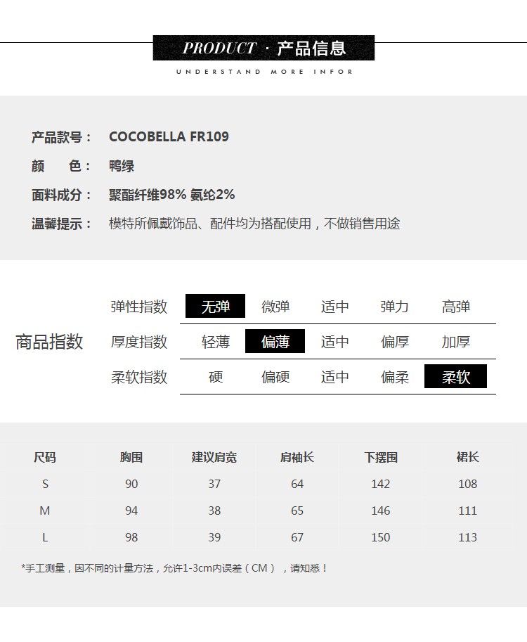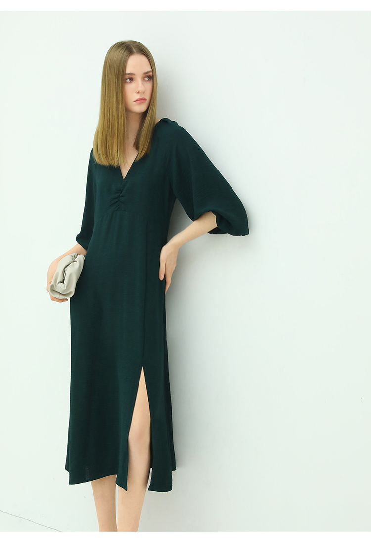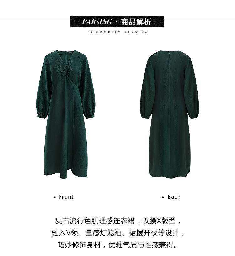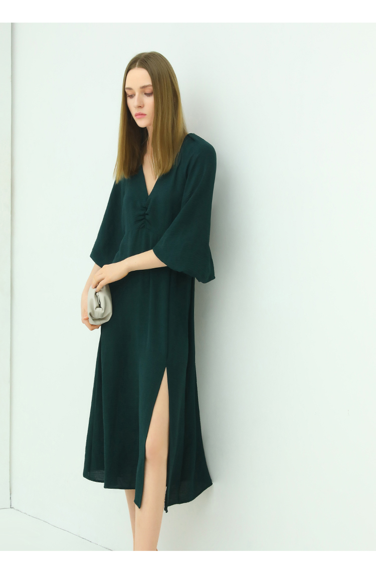 COCOBELLA肌理质感绿色V领连衣裙优雅女人味OL大摆长裙FR109