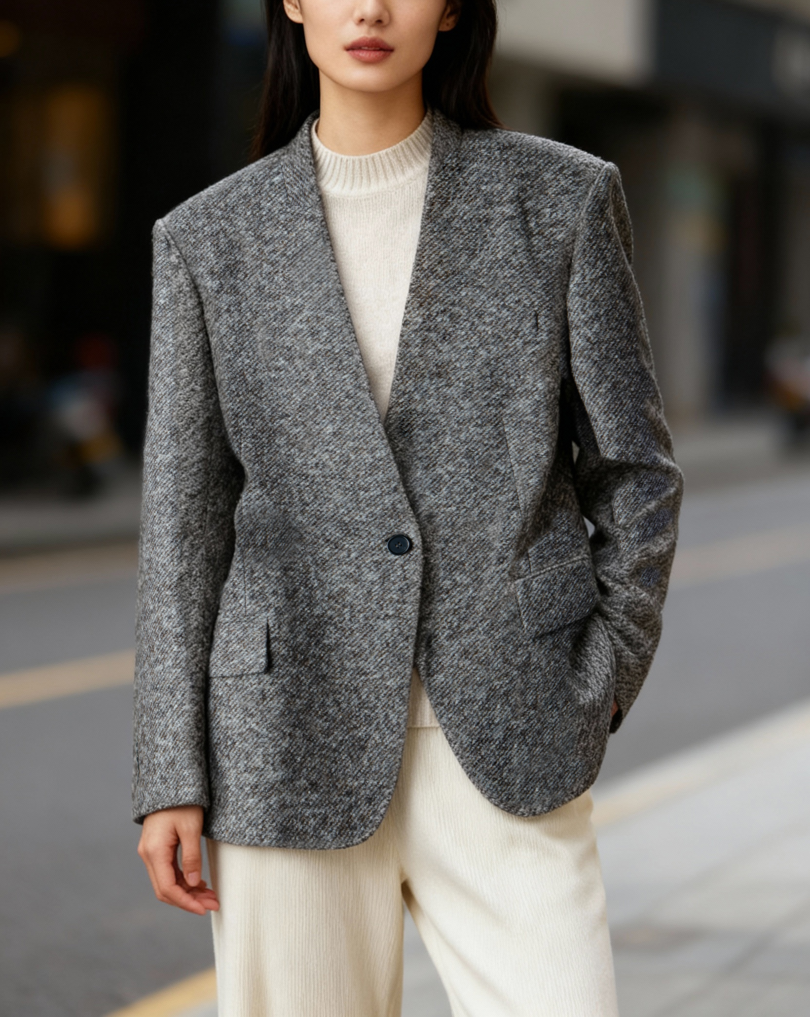 灰棕羊毛廓形西装外套|温柔与气场的平衡术