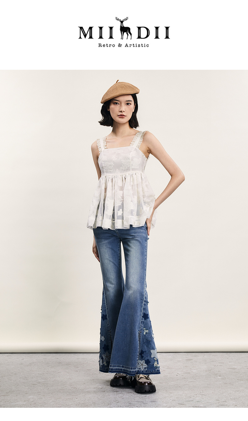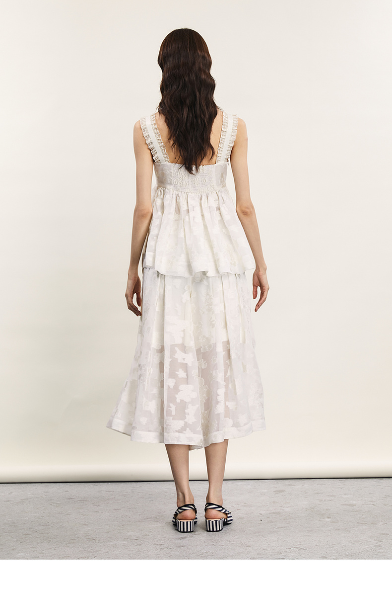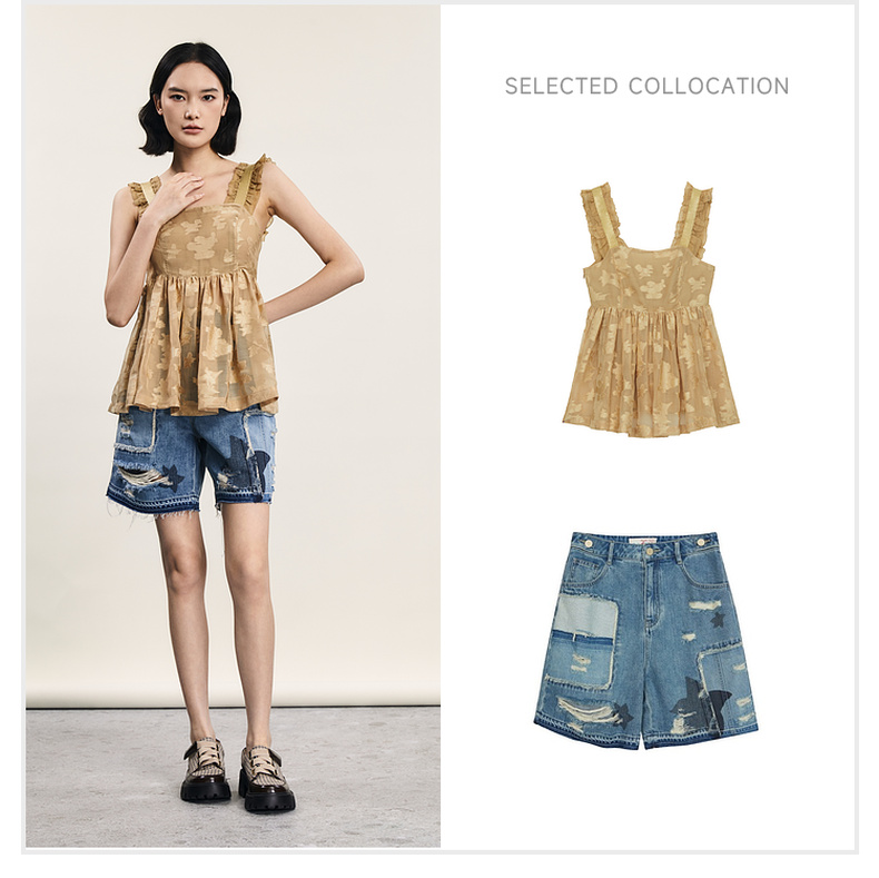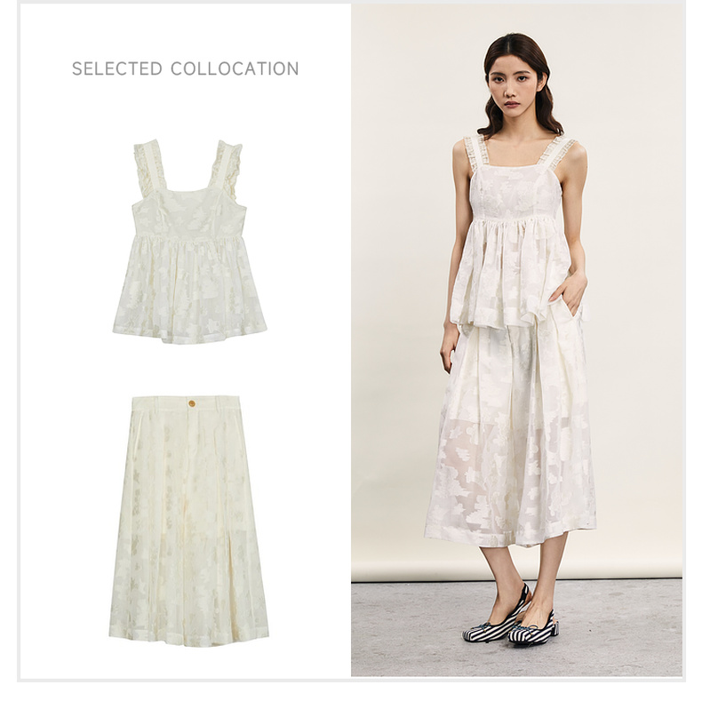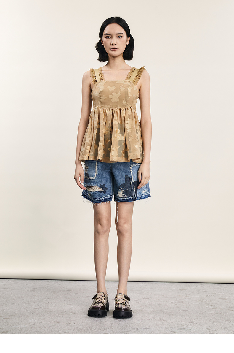 谜底提花吊带上衣女2024年夏新品复古风气质优雅荷叶边242MS0633