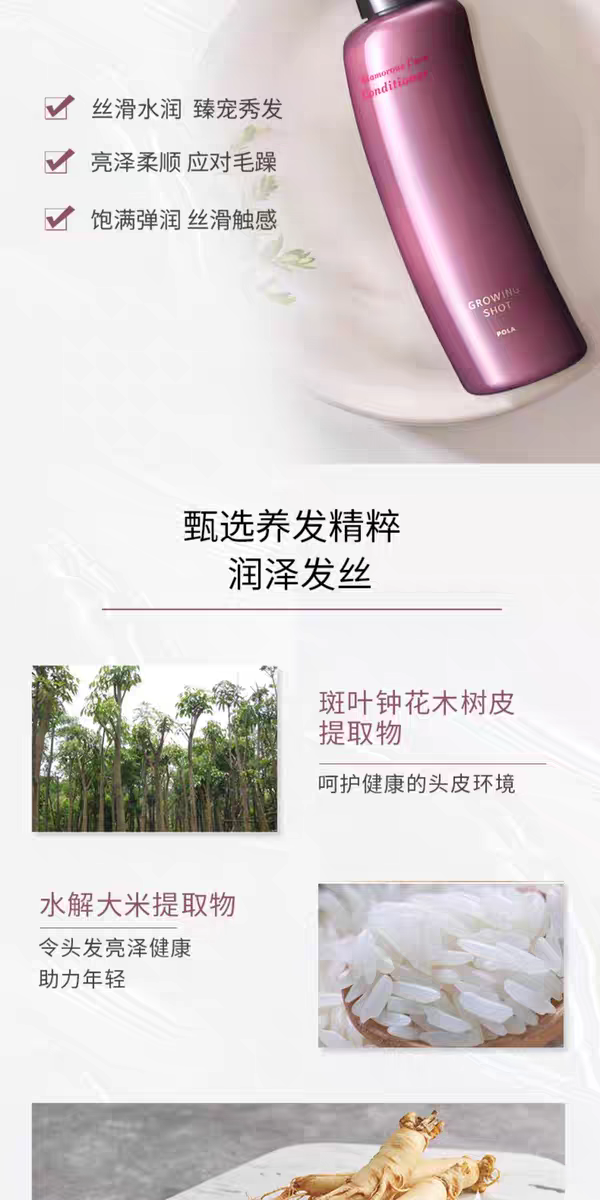 含有POLA的原创成分-风铃木树皮精华和黑米精华,可滋养头发富含3种渗透型胶原蛋白、5种神经酰胺、14种氨基酸、皱波角叉菜精华、白茅精华和五加科植物人参根精华等,强化受损发质